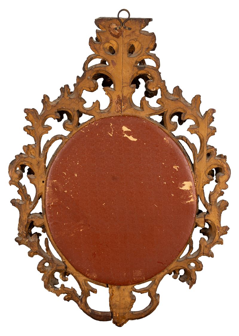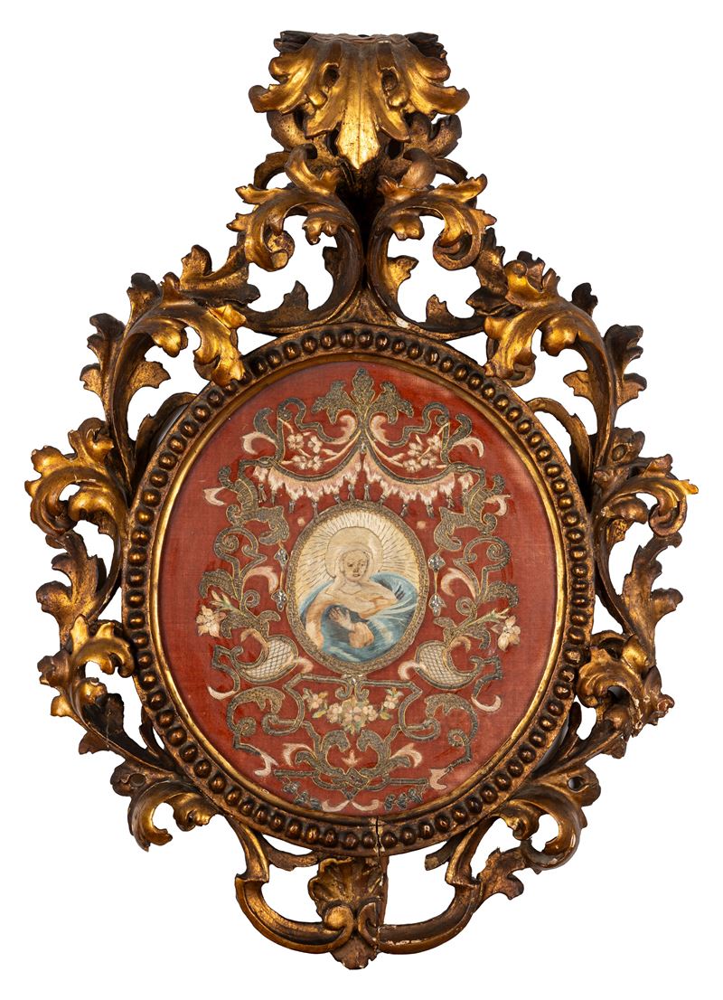 ricamo raffigurante Madonna orante entro clipeo e motivi a rocaille