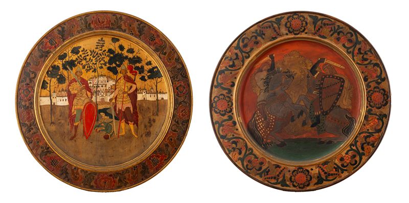 decorati nel cavetto con figure di cavalieri e nella tesa con motivi vegetali