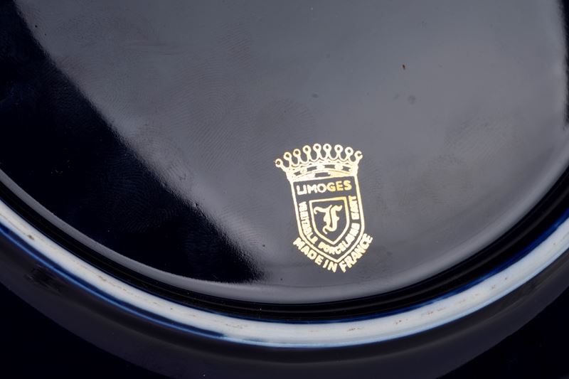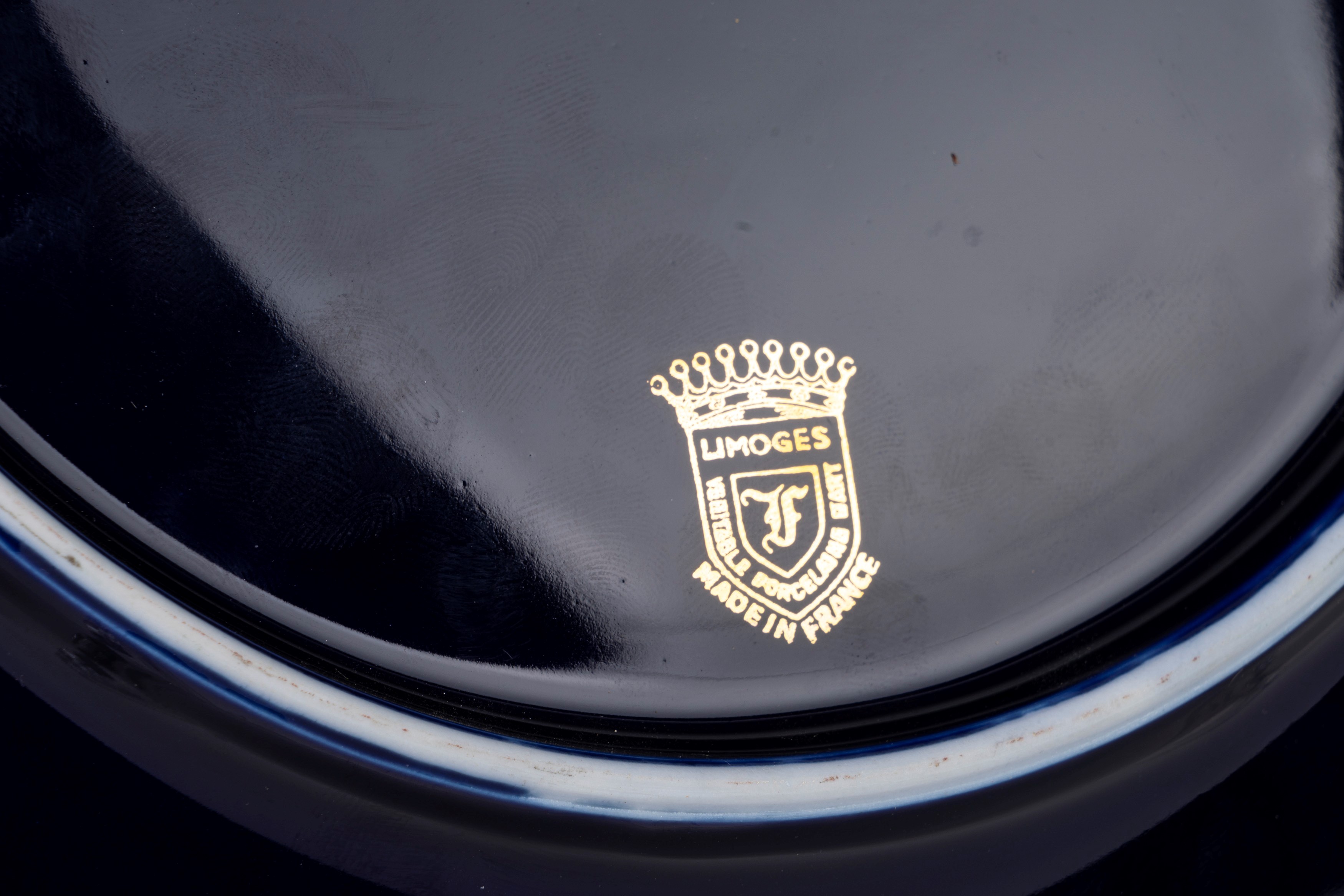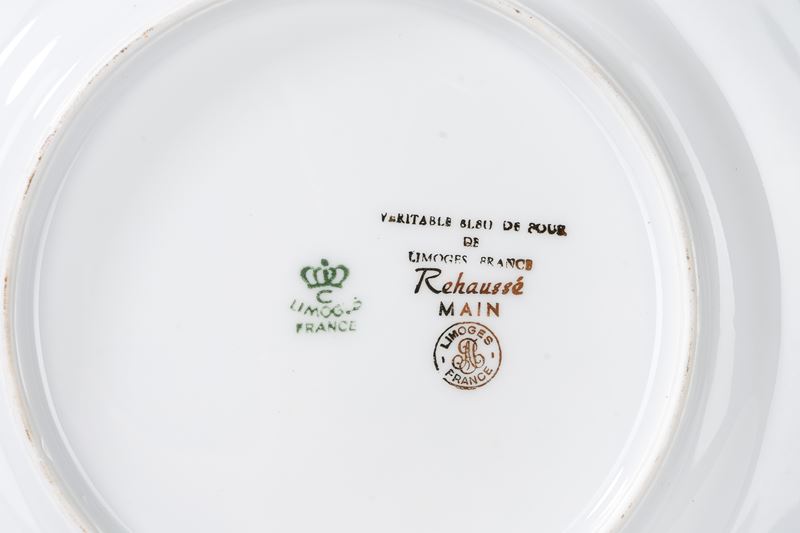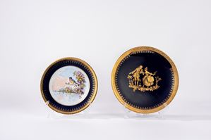 uno con scena galante e uno con uccellino su tralcio di more nel cavetto, decorati sulla tesa con motivo in oro. Entrambi con marchio sotto la base