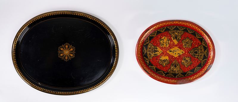 il più grande in lacca nera e oro con motivo floreale al centro; il più piccolo in lacca rossa, oro e nera