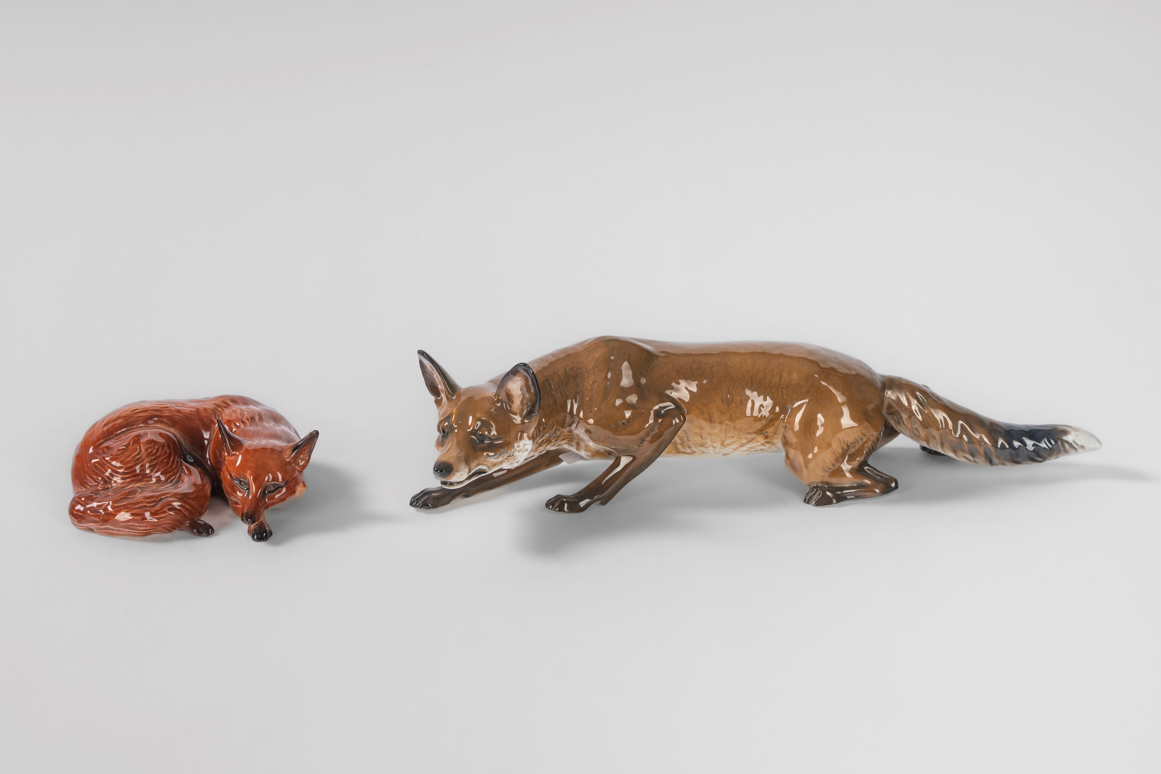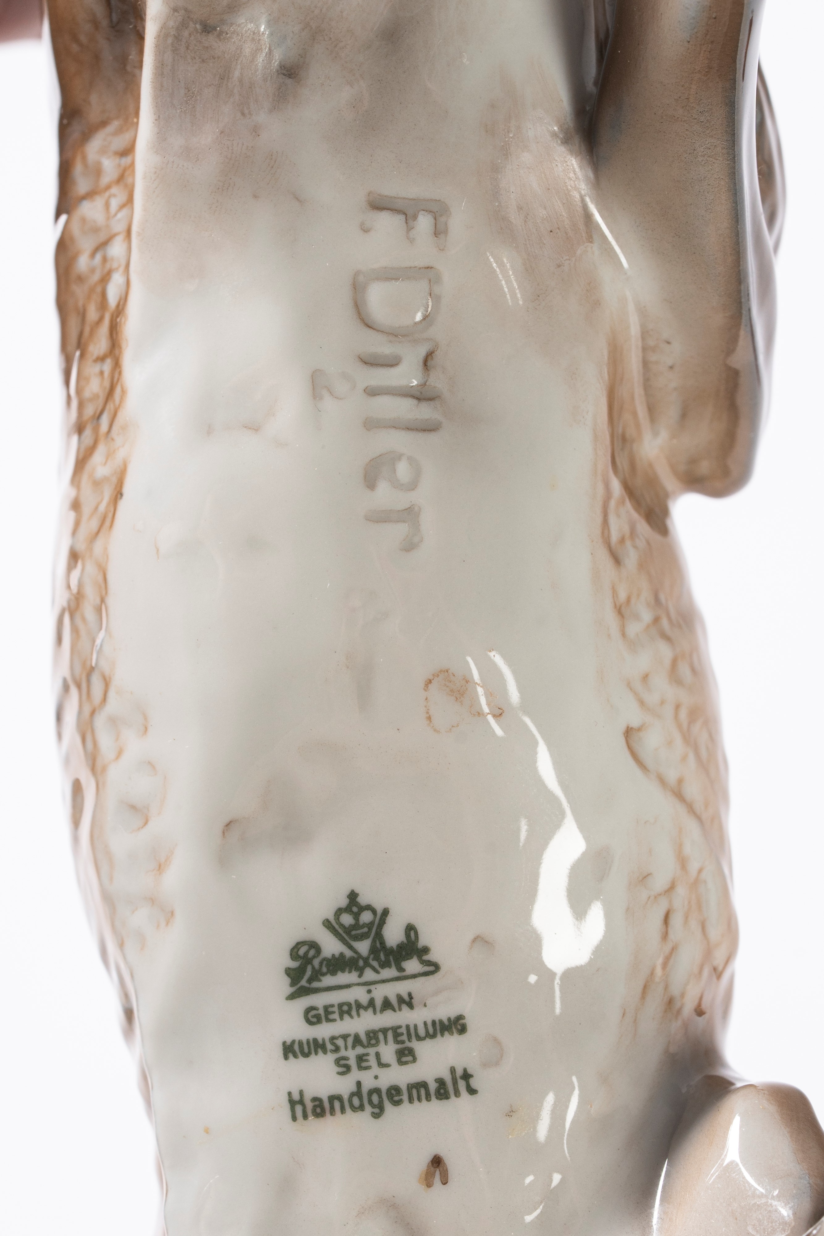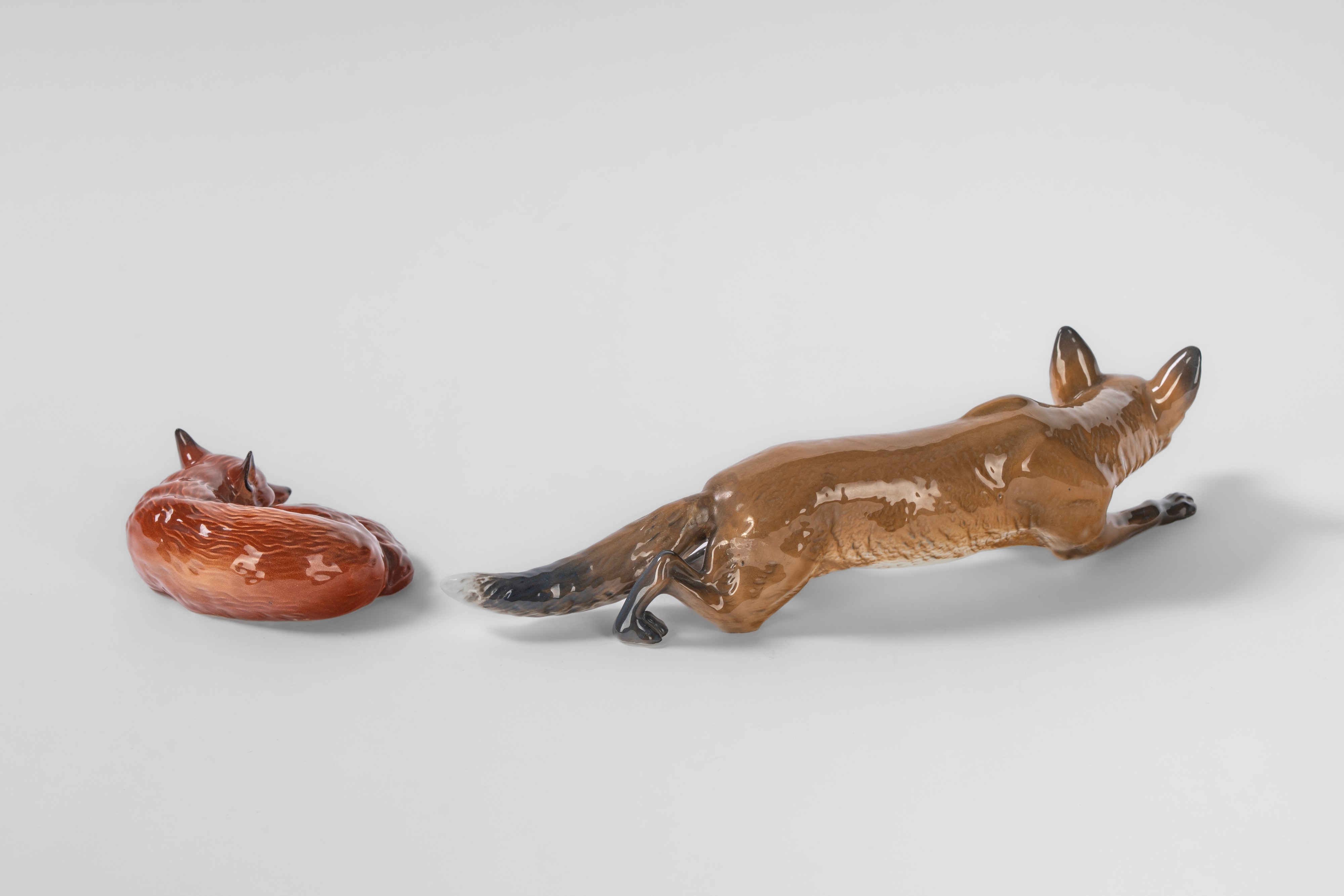 Marcate sotto la base. La volpe di dimensioni maggiori con firma impressa F. Diller (Fritz Diller, 1875-1946) e lieve sbeccatura alla zampa posteriore.