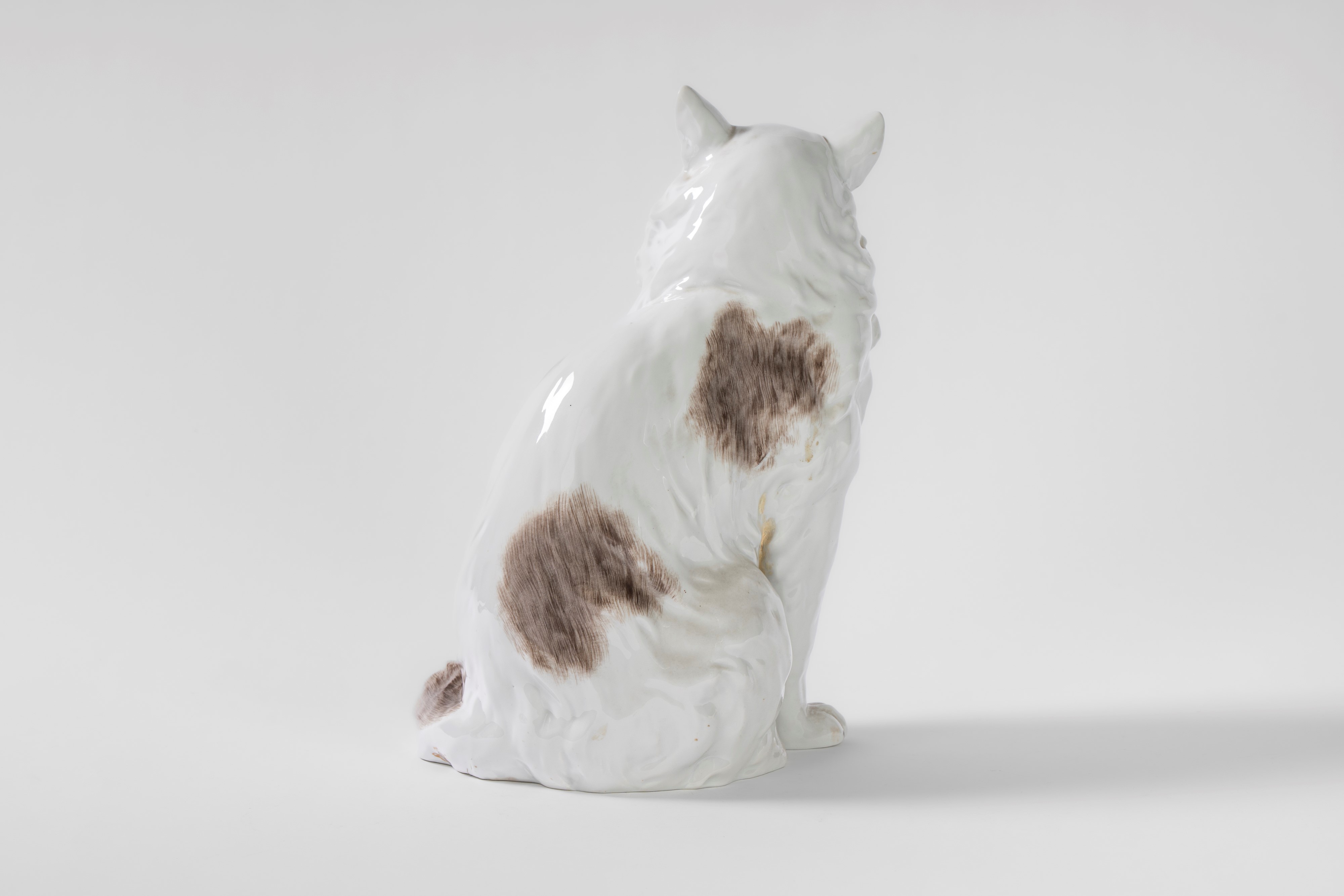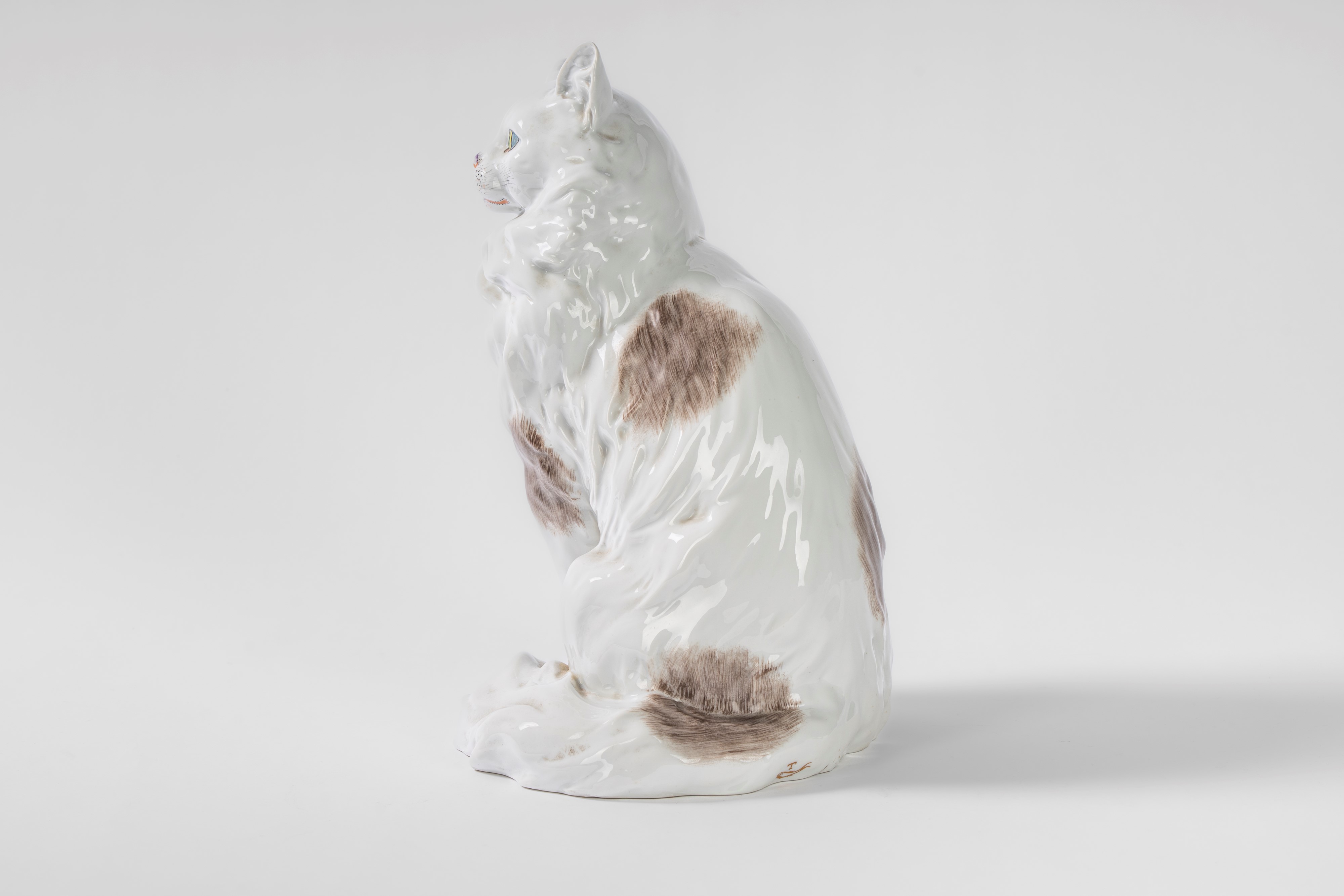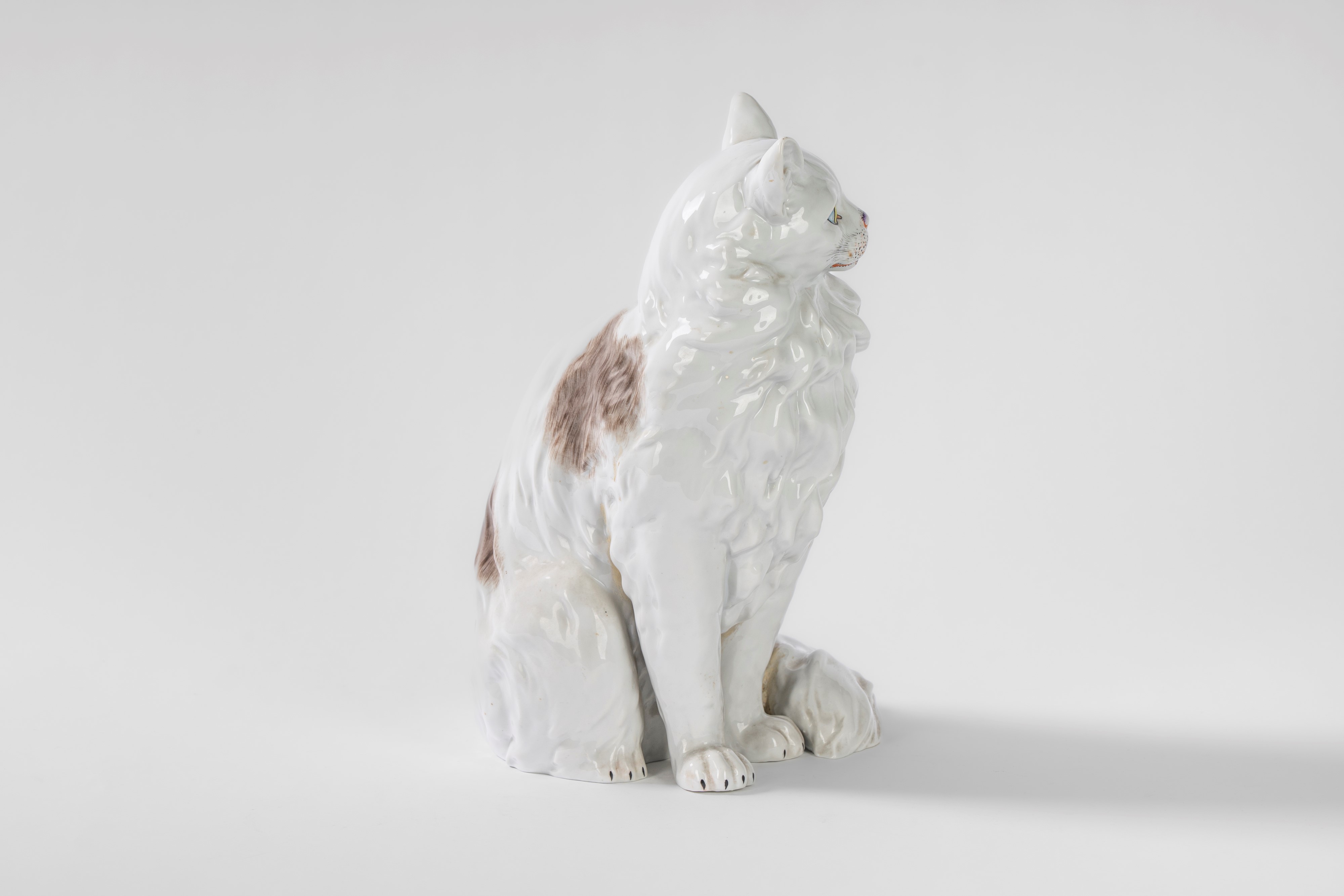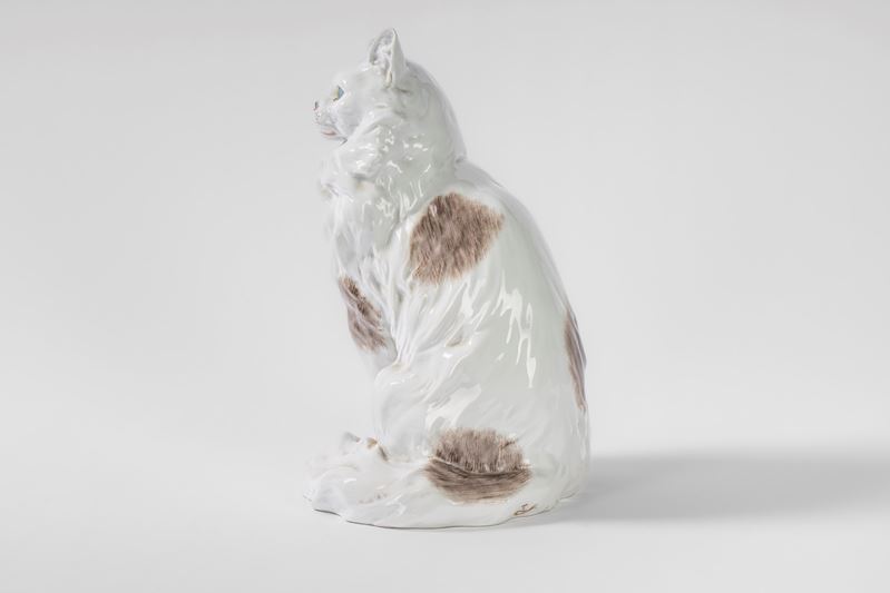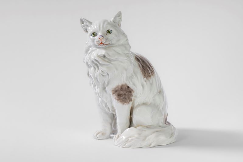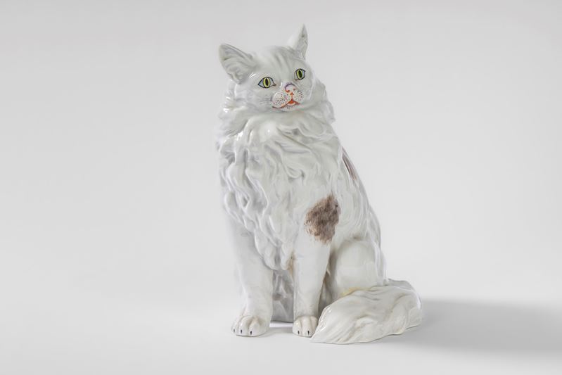 Gatto a grandezza naturale in porcellana bianca e policroma. Carl Thieme, Potschappel, Dresda, 1864-1888