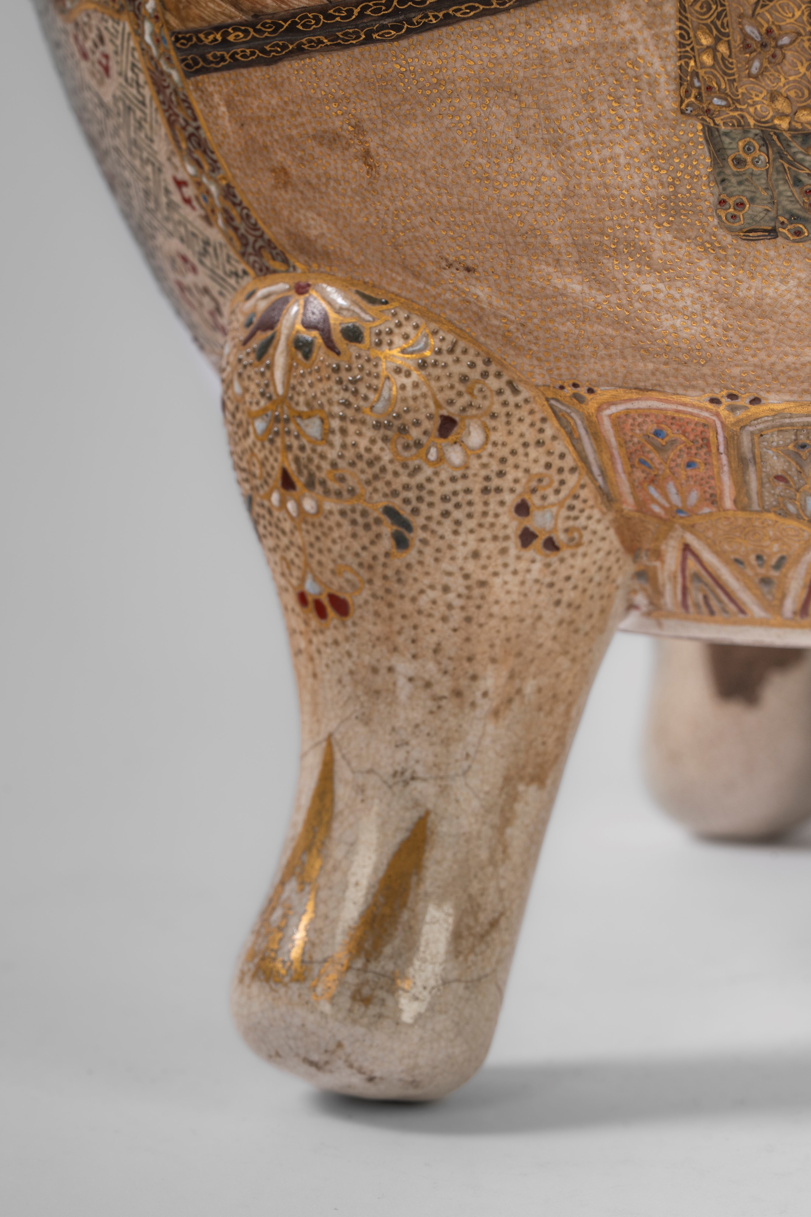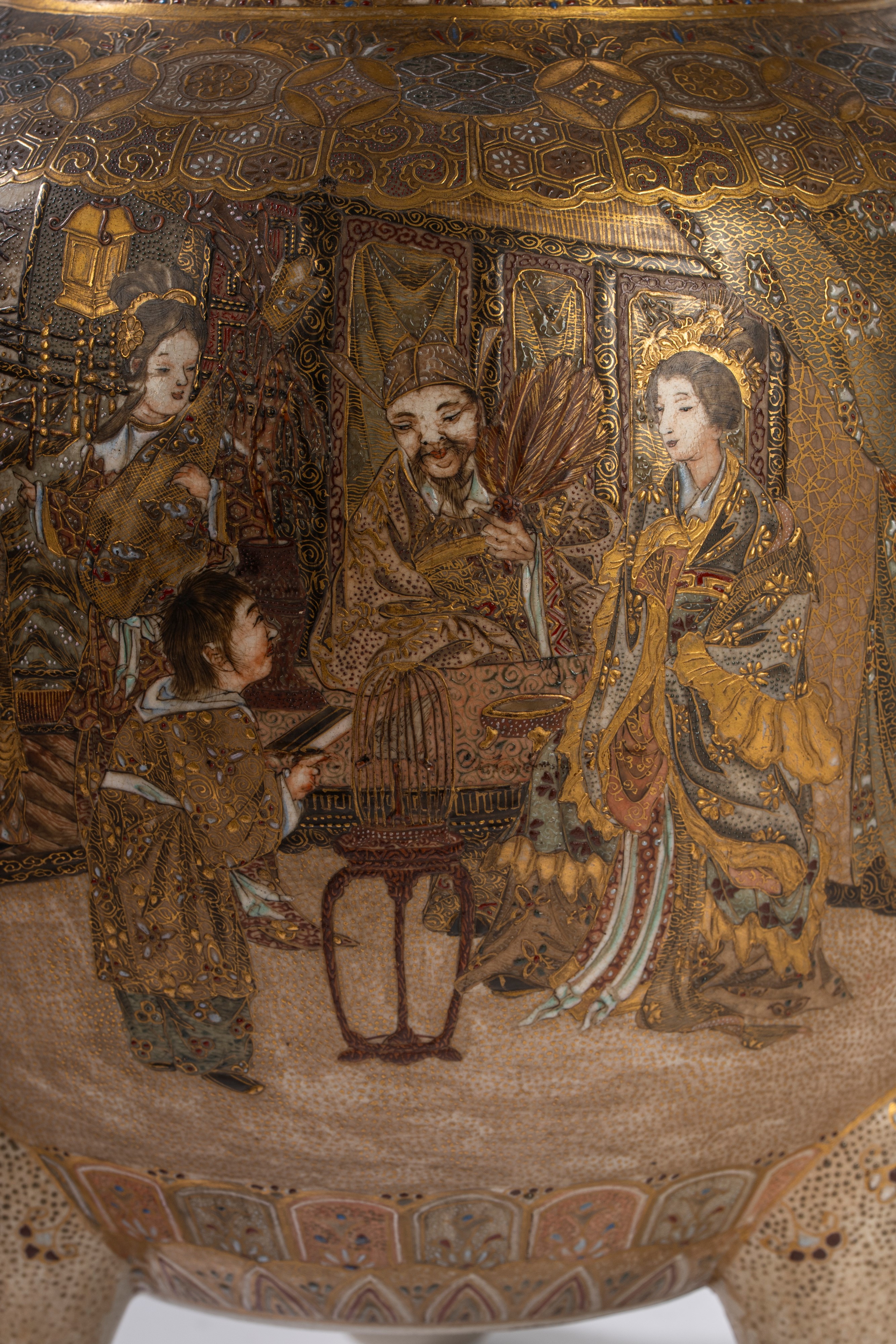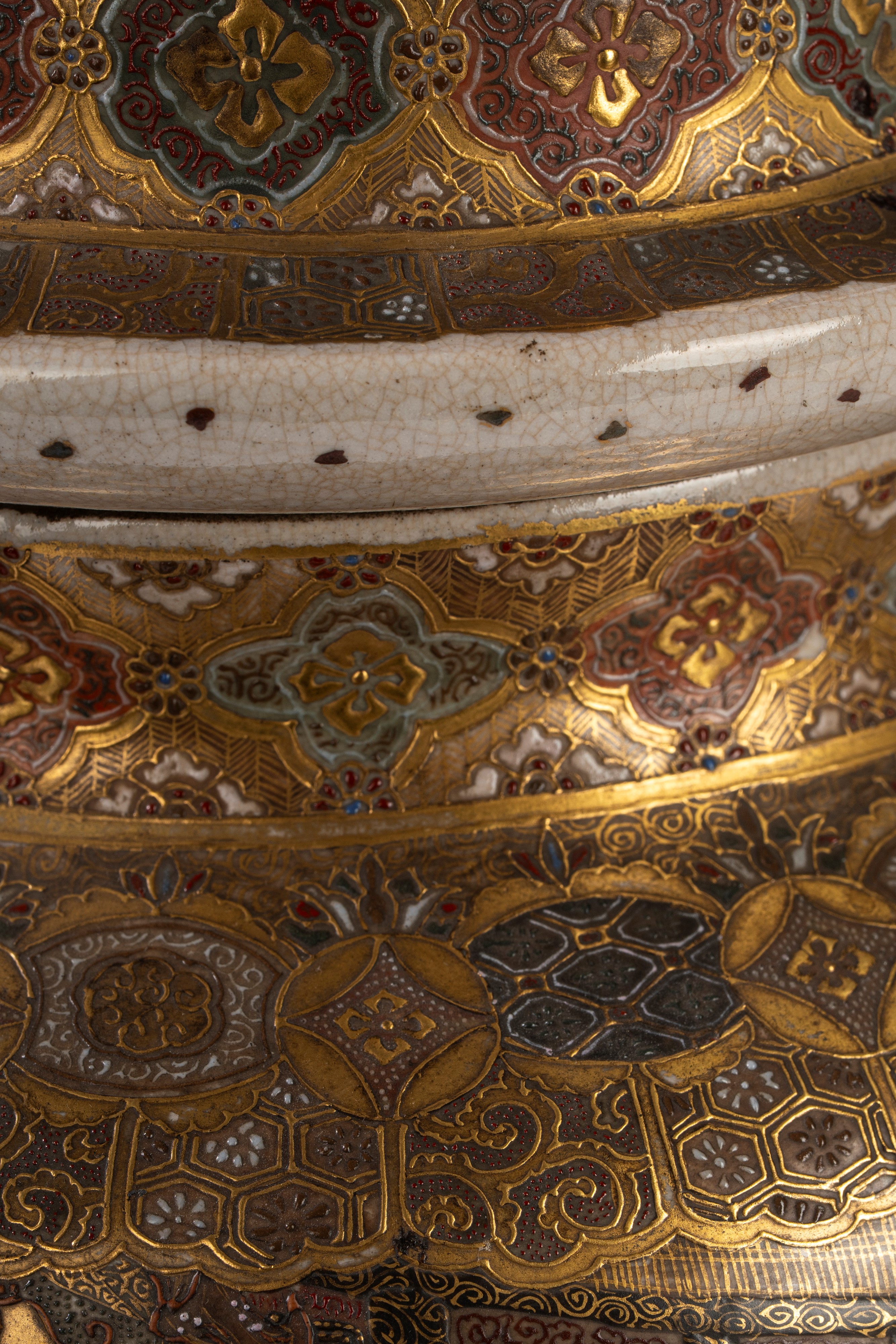 Grande incensiere in ceramica Satsuma; dipinto con scene di corte entro pannelli, il coperchio con un cane shishi, Giappone, epoca Meiji
