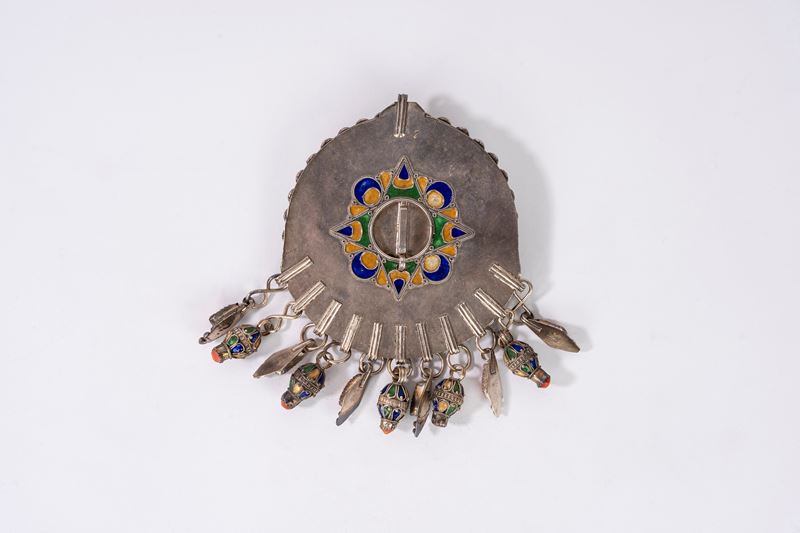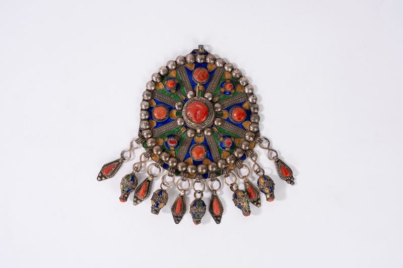 Grande pendente berbero in metallo argentato, corallo e smalti policromi, Cabilia, Algeria inizi secolo XX