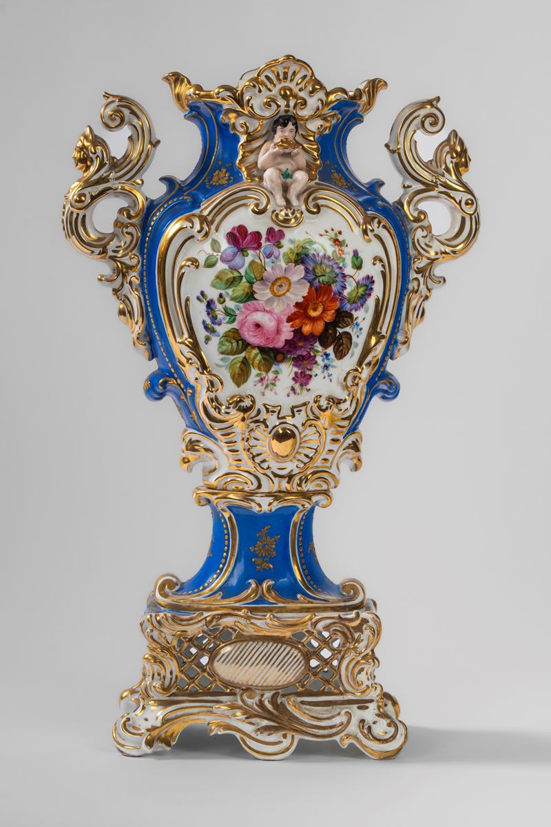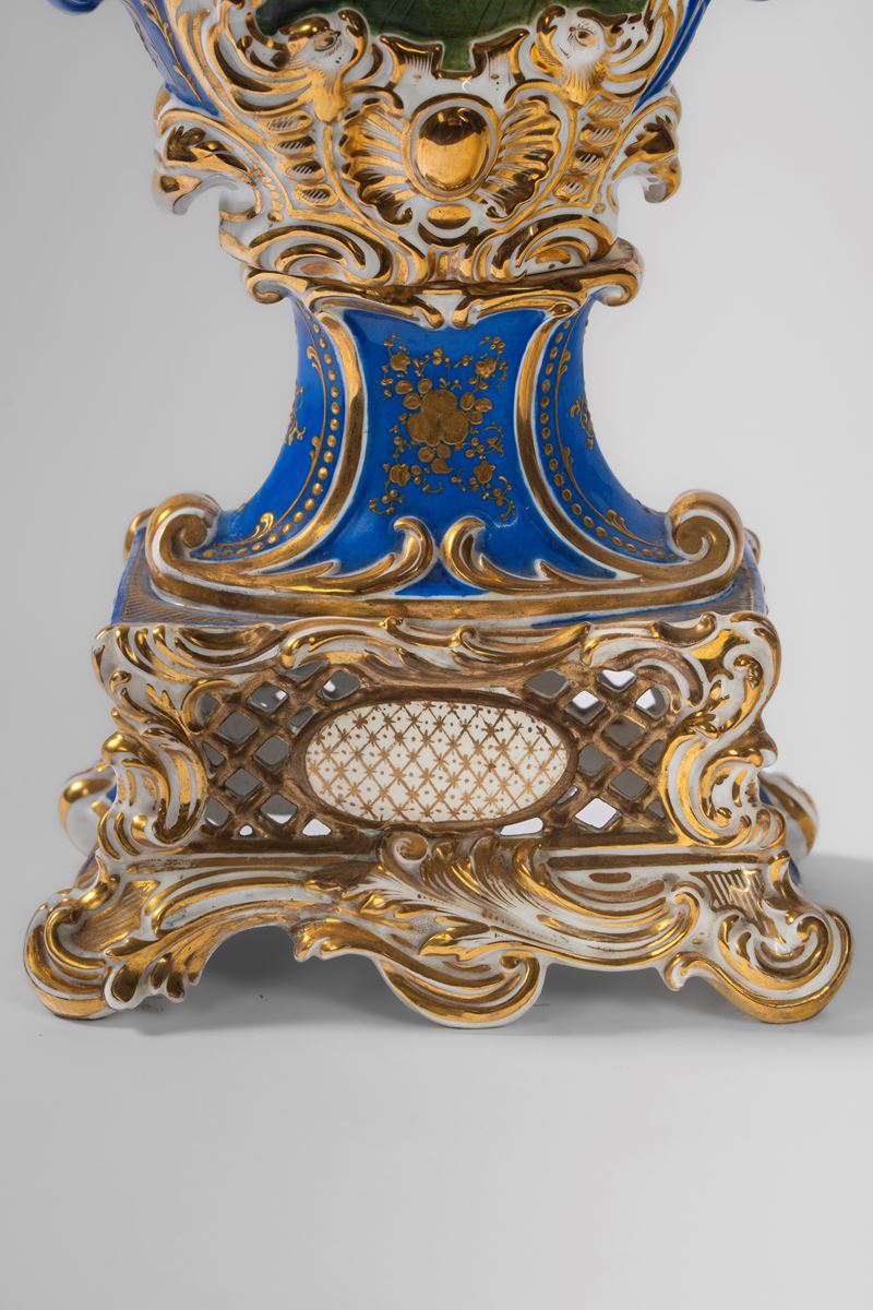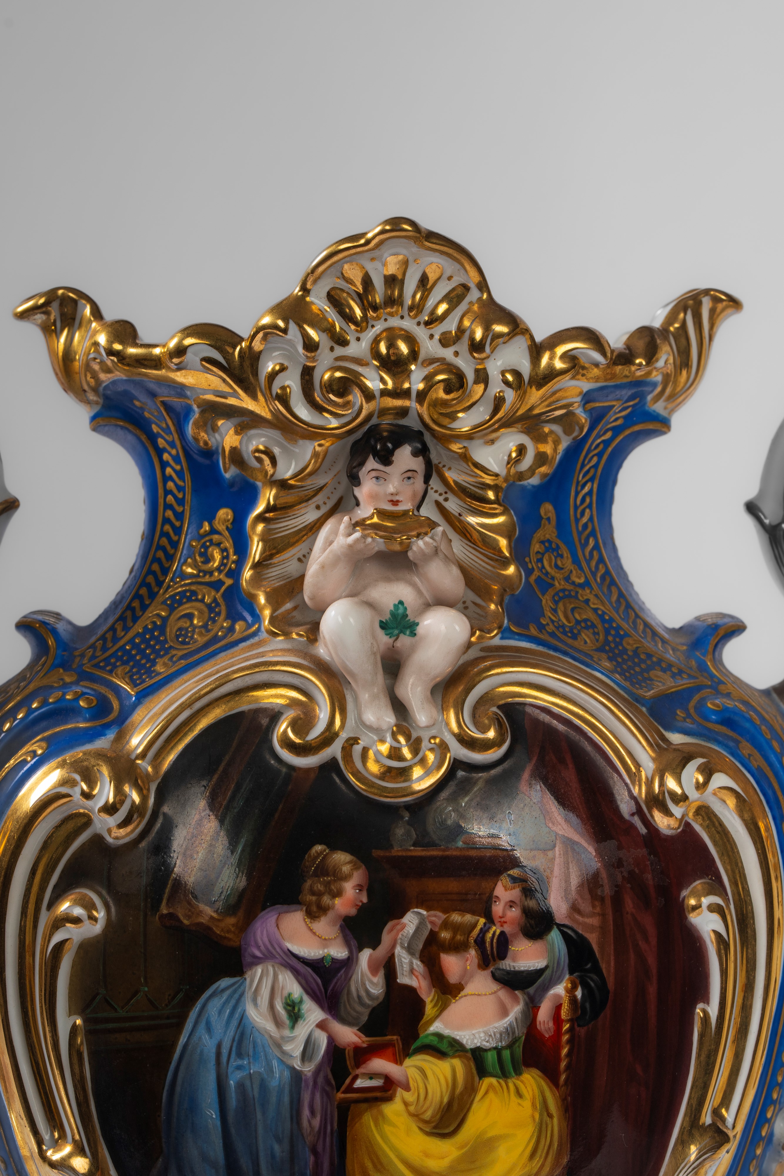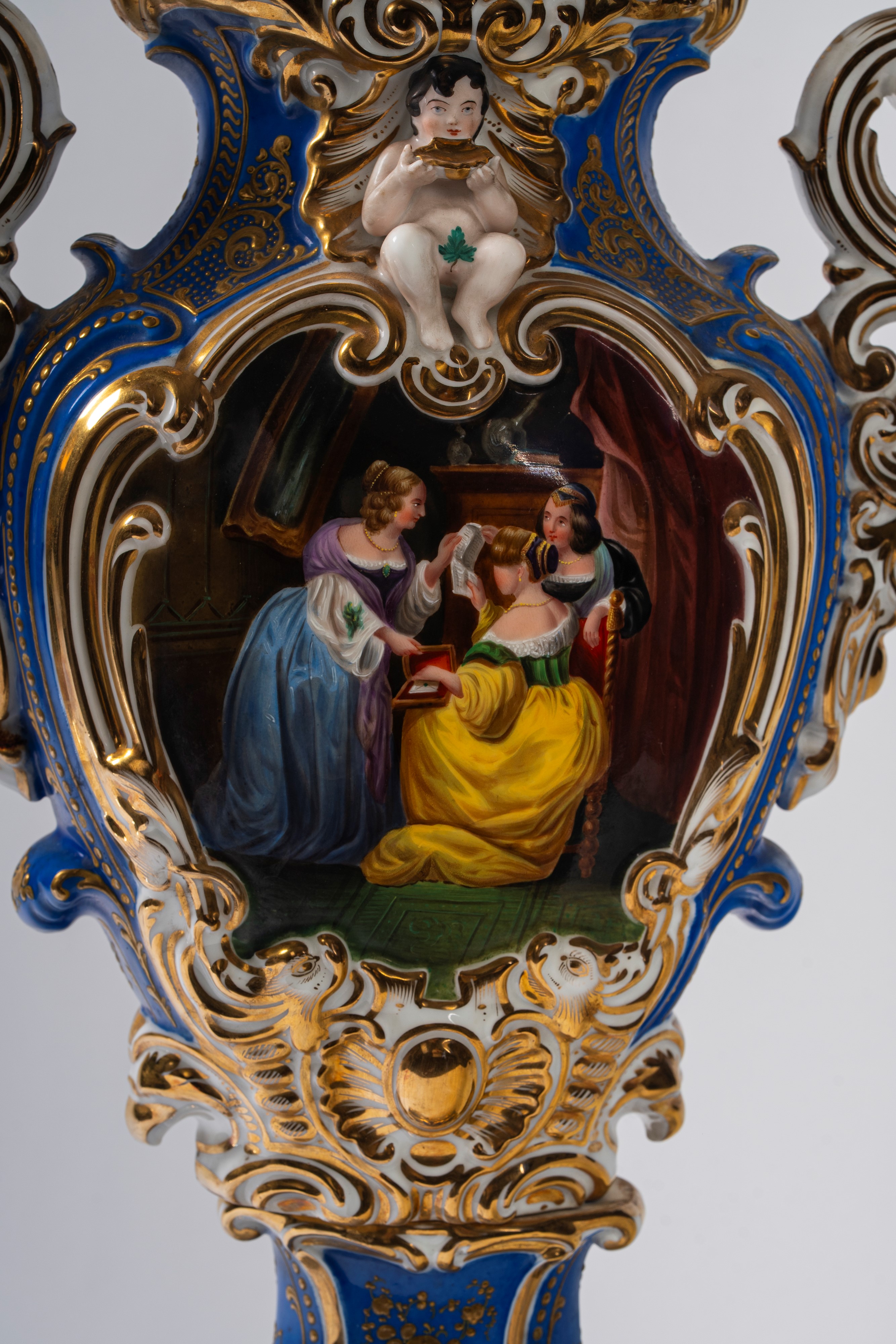 Su base a plinto a rocaille con motivo traforato a graticcio, anse mosse a volute. Il corpo decorato sul fronte da scena di interno con tre dame intente nella lettura di una missiva, il retro da bouquet di fiori entro cartella dorata e a rilievo sormontata da putto con conchiglia.
