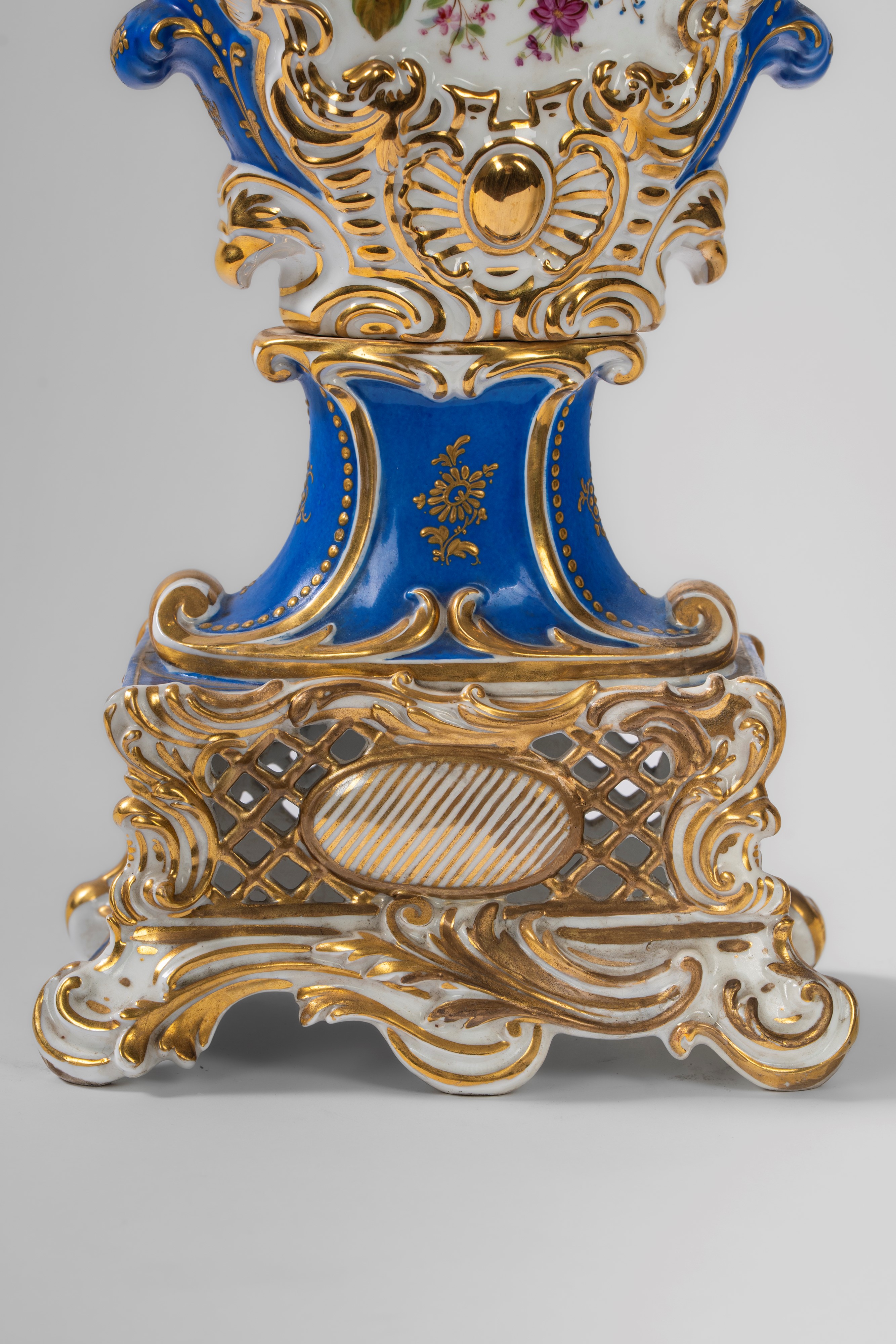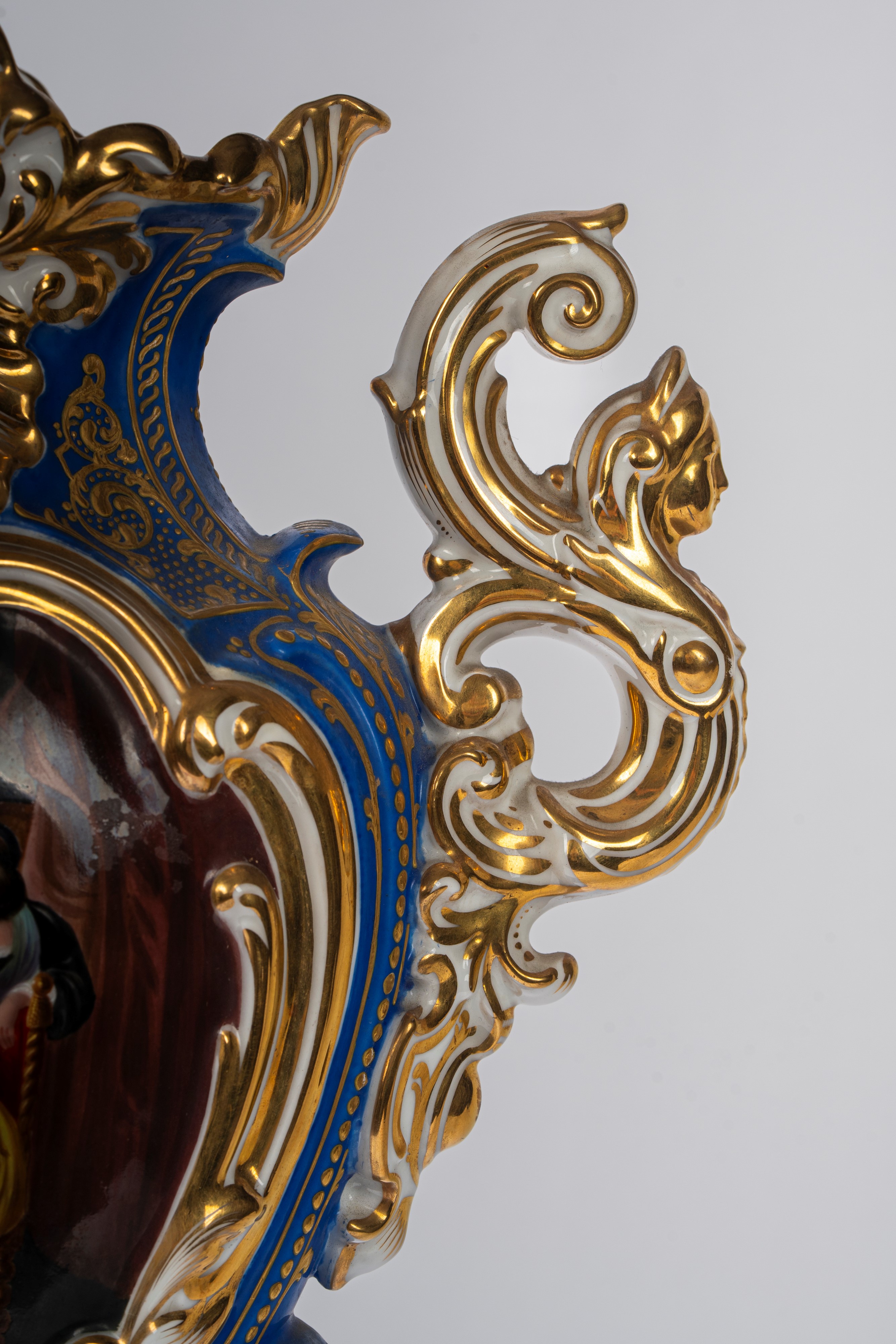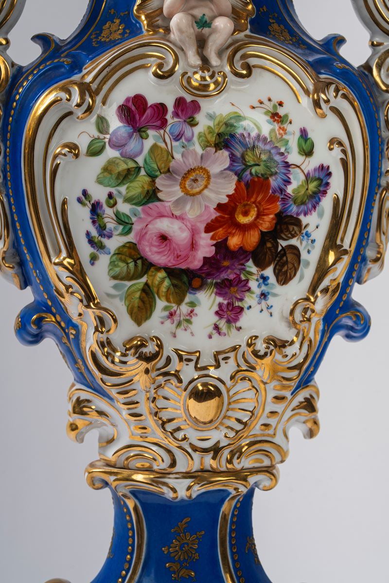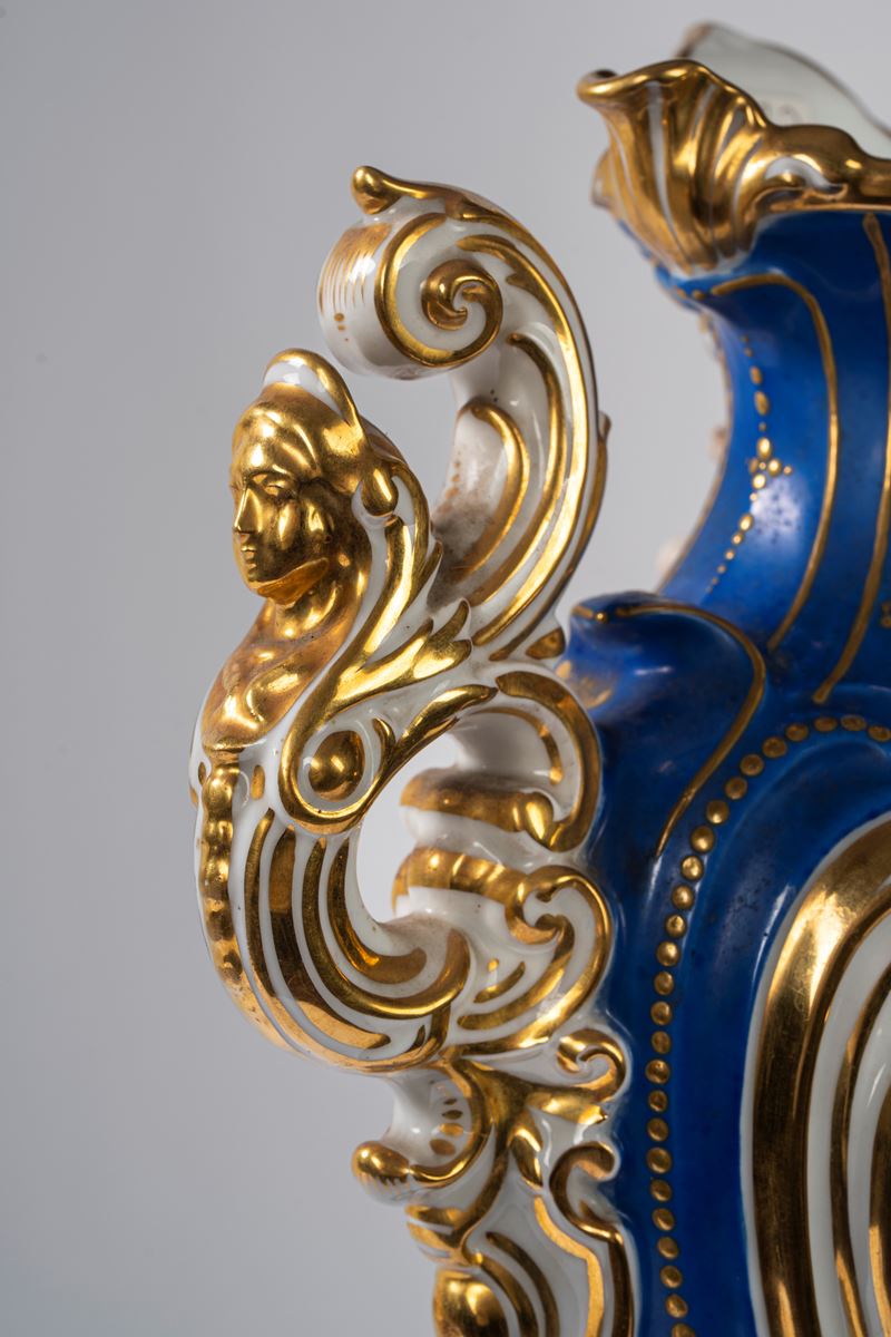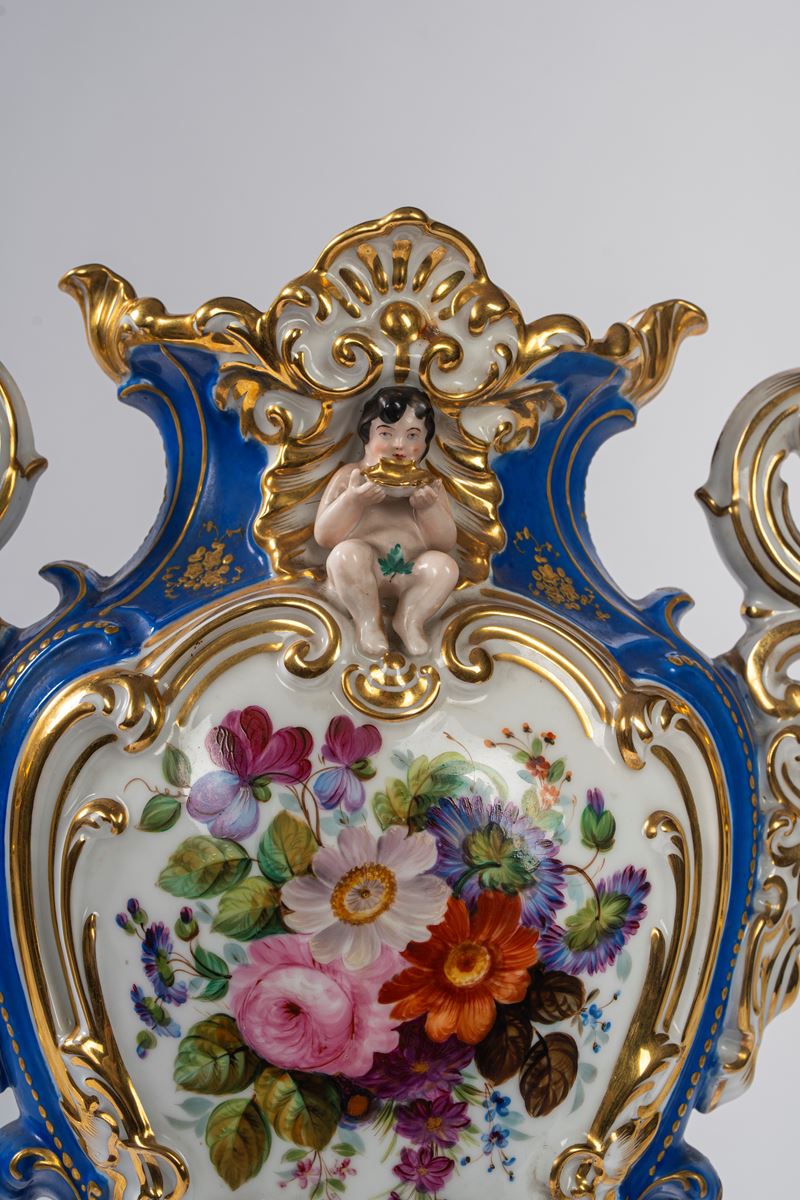 Su base a plinto a rocaille con motivo traforato a graticcio, anse mosse a volute. Il corpo decorato sul fronte da scena di interno con tre dame intente nella lettura di una missiva, il retro da bouquet di fiori entro cartella dorata e a rilievo sormontata da putto con conchiglia.