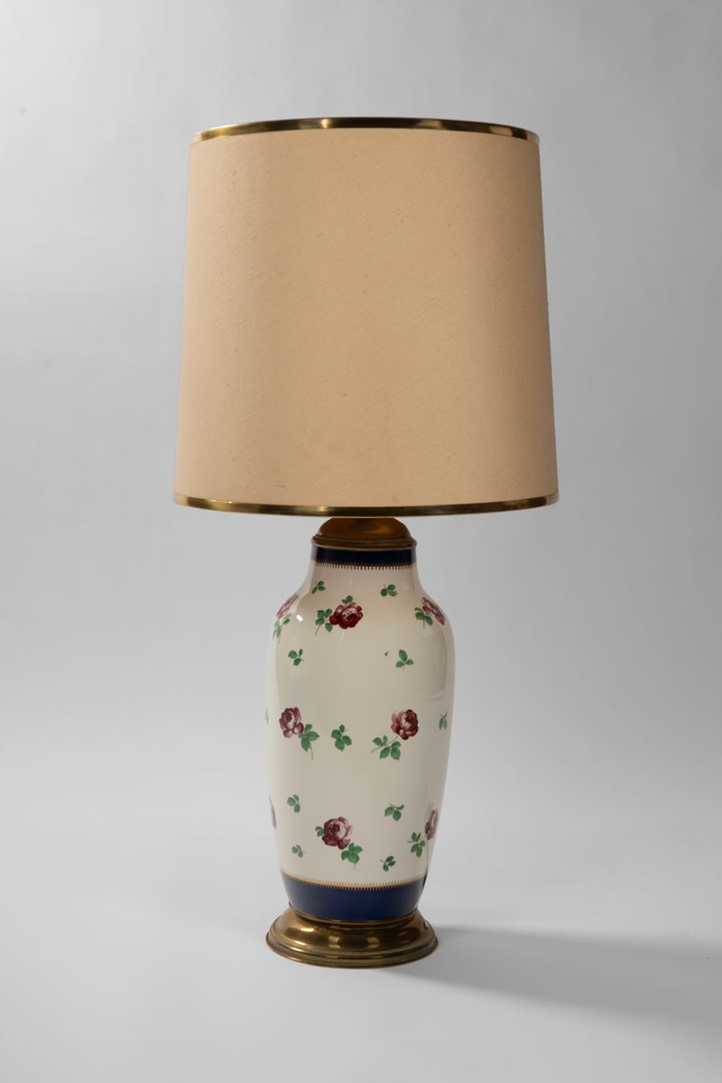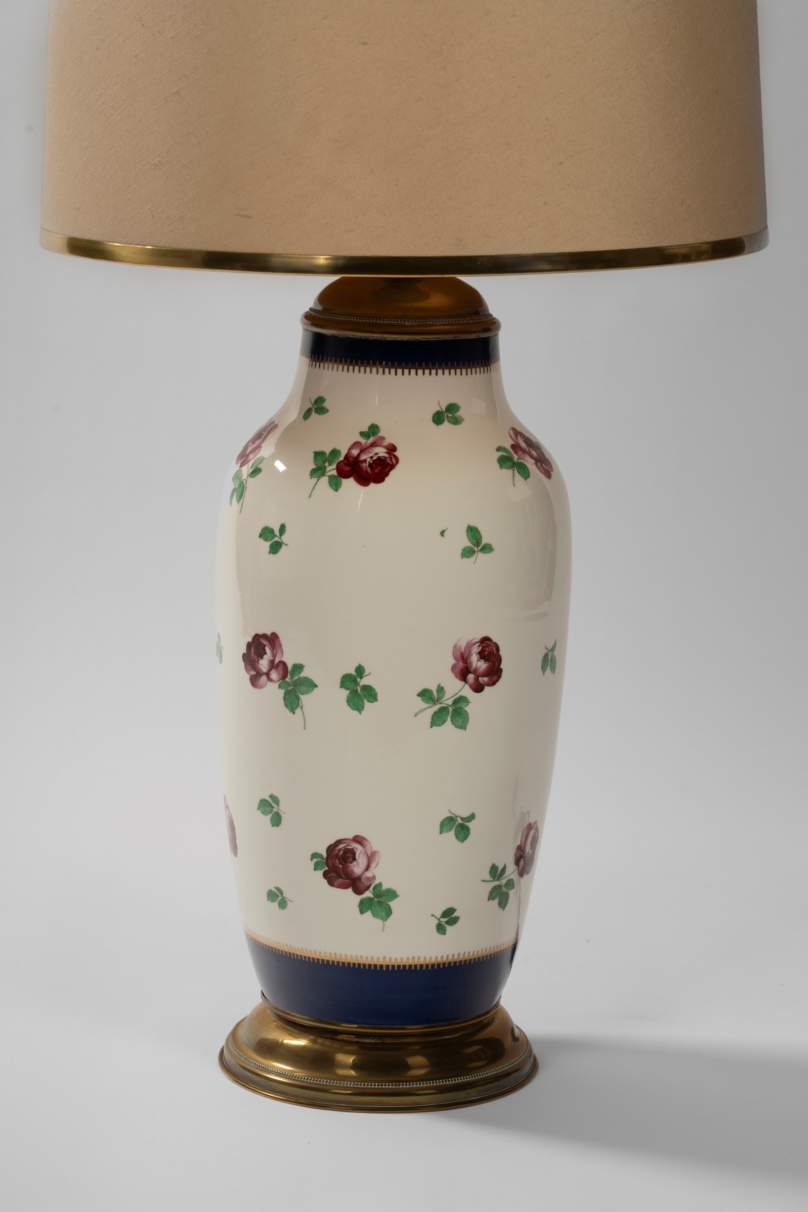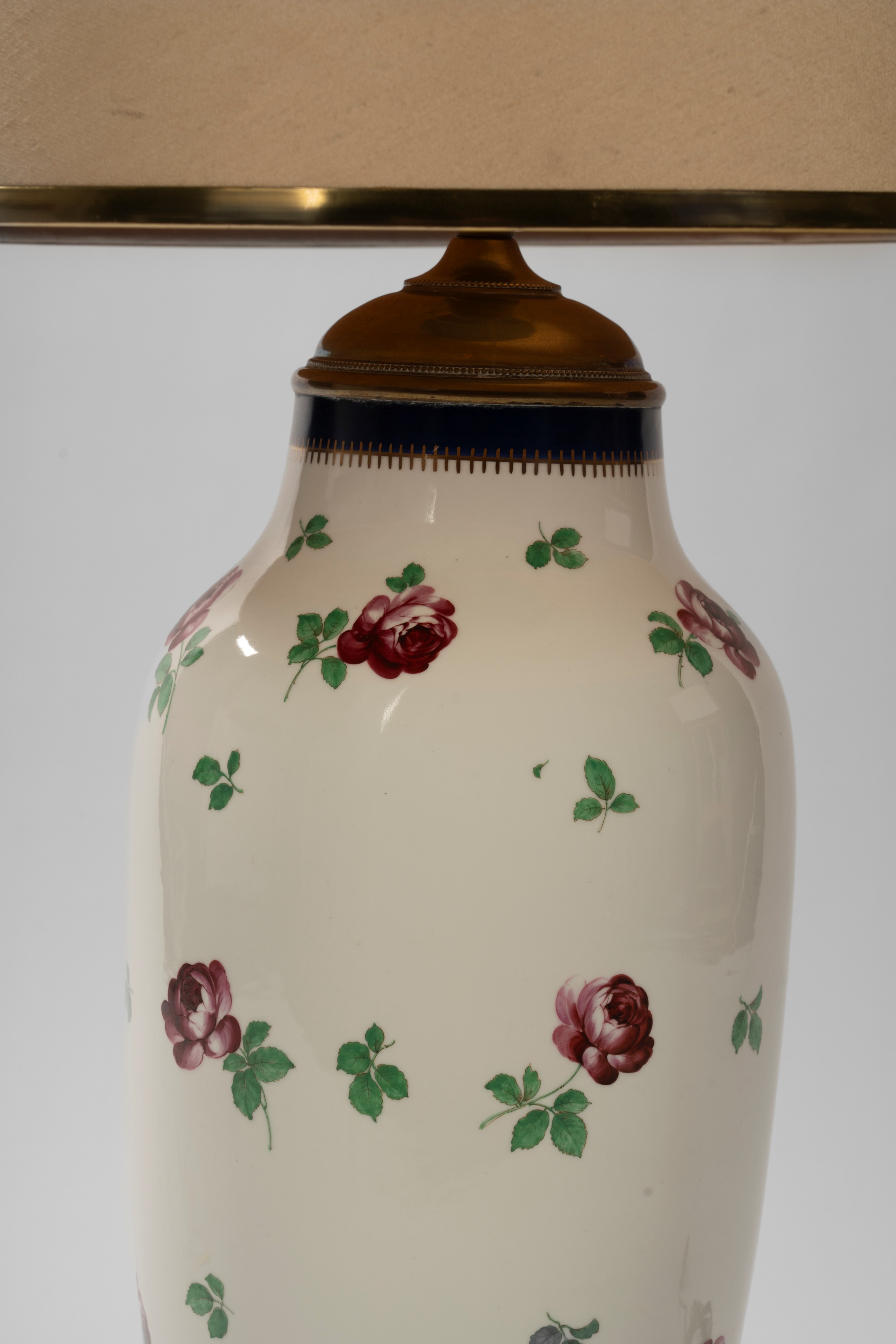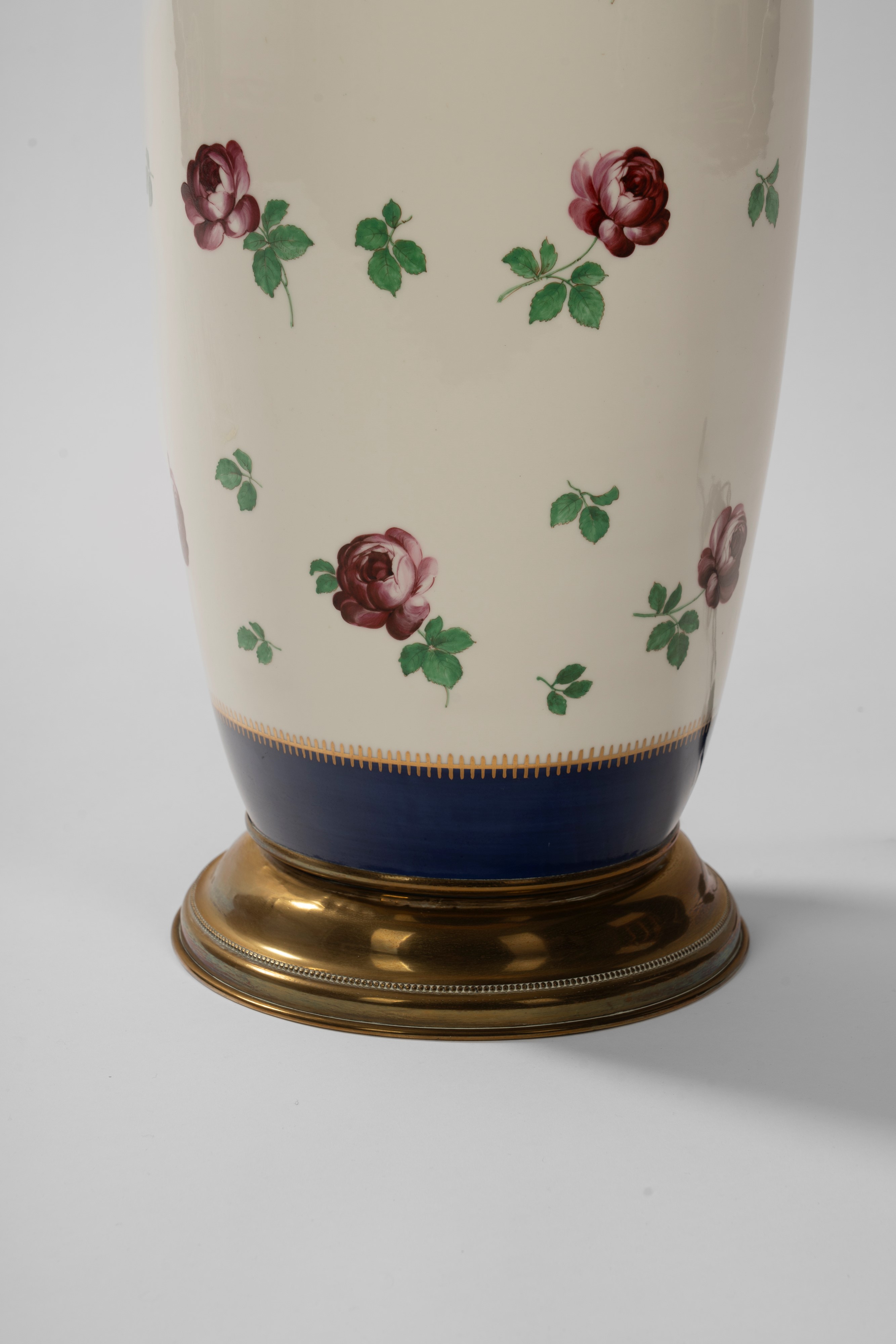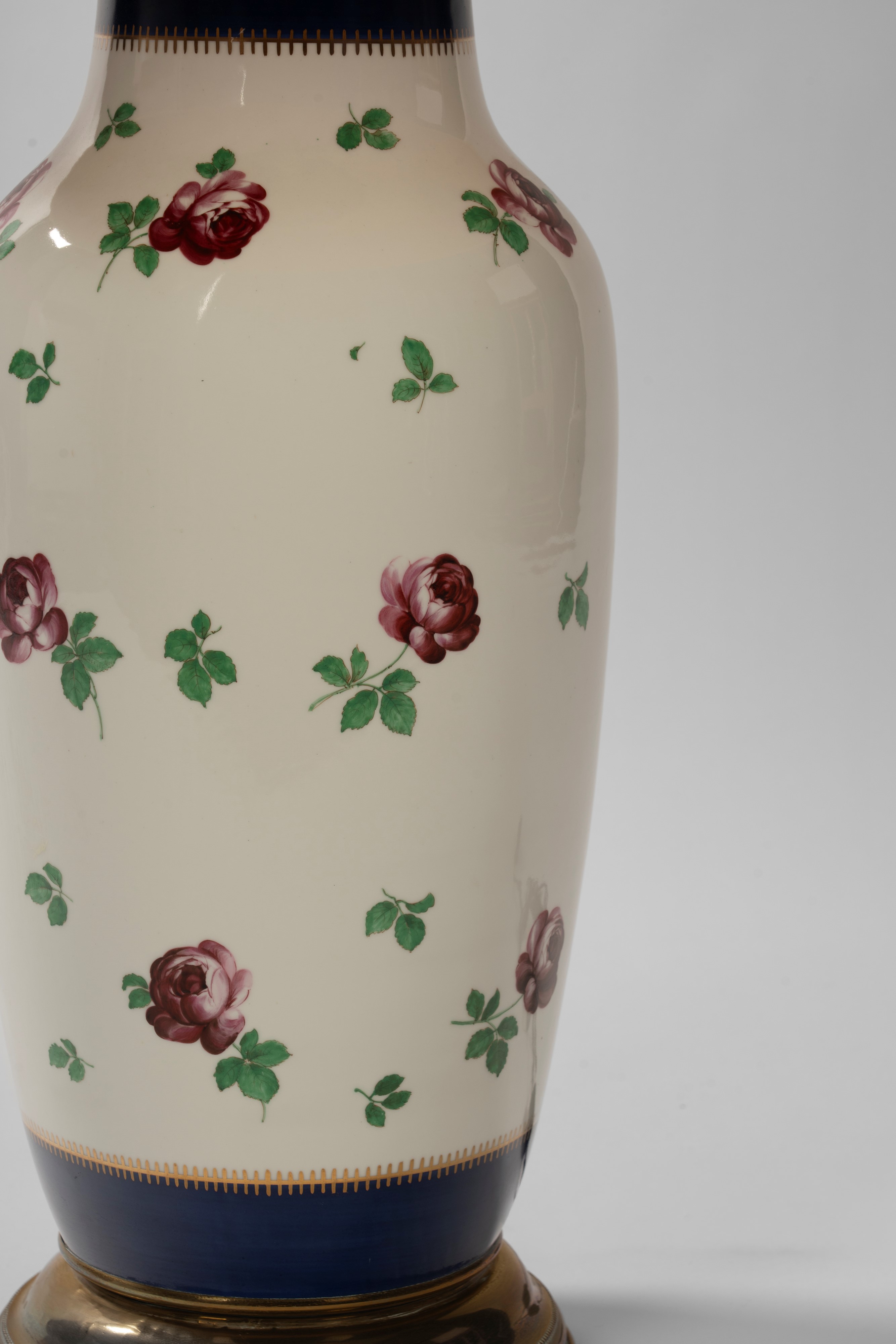 decorato a rose con foglie sparse su tutta la superficie, profili in blu cobalto con dorature.