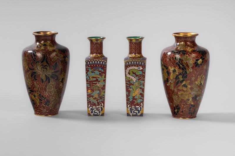 一组掐丝珐琅器,包括一对深红色花卉纹瓶及一对方形掐丝珐琅小瓶,饰凤纹与龙纹,红地,中国