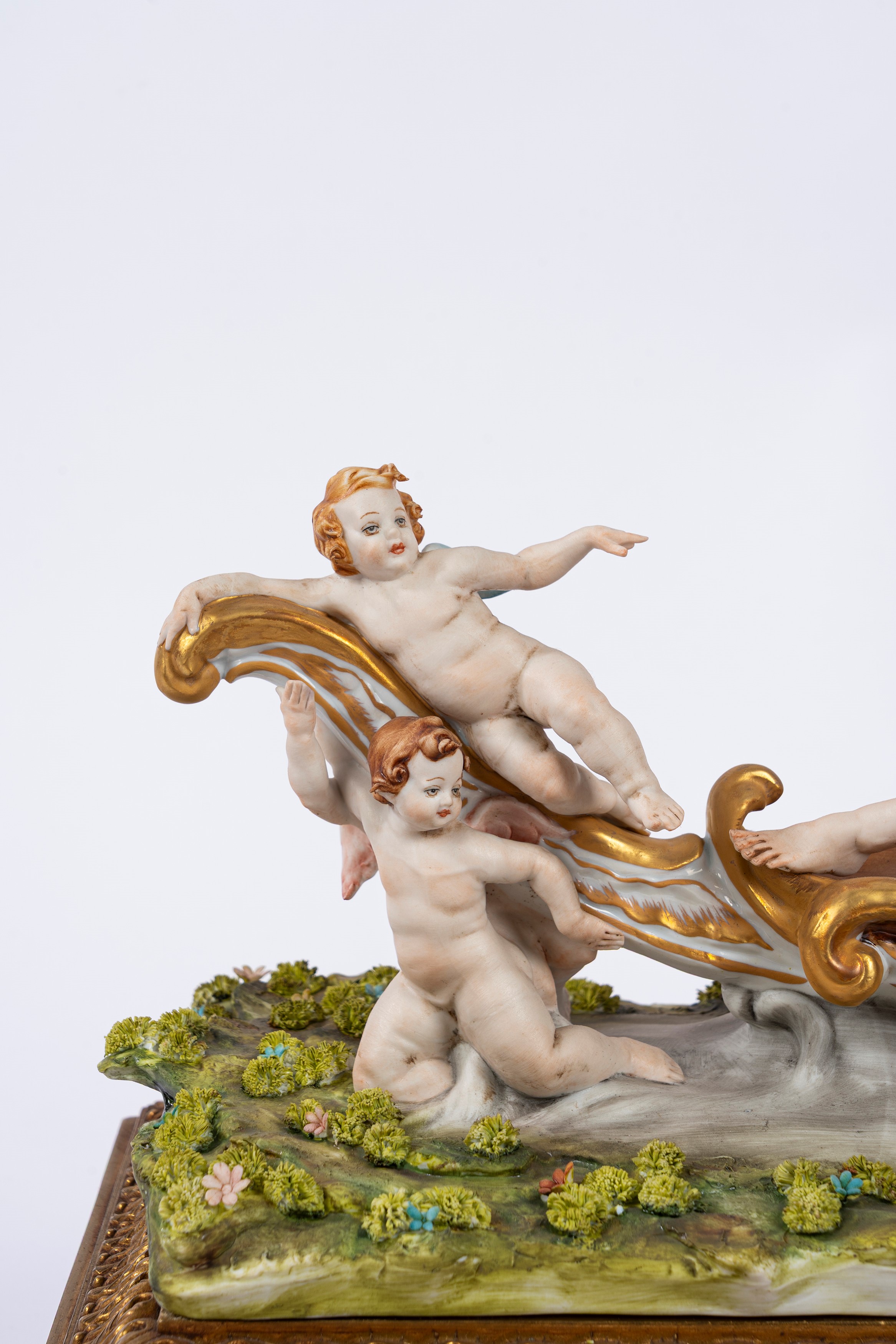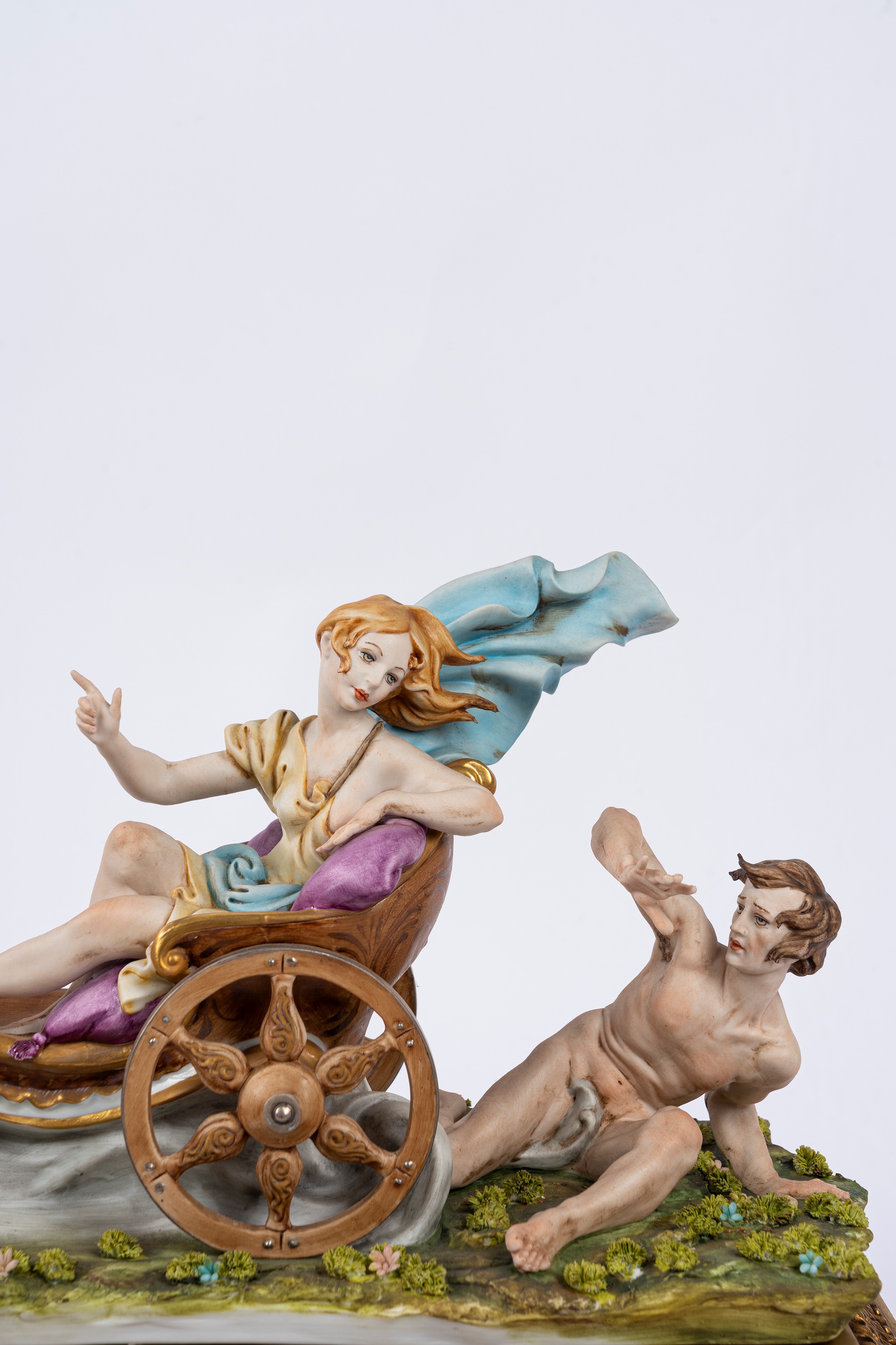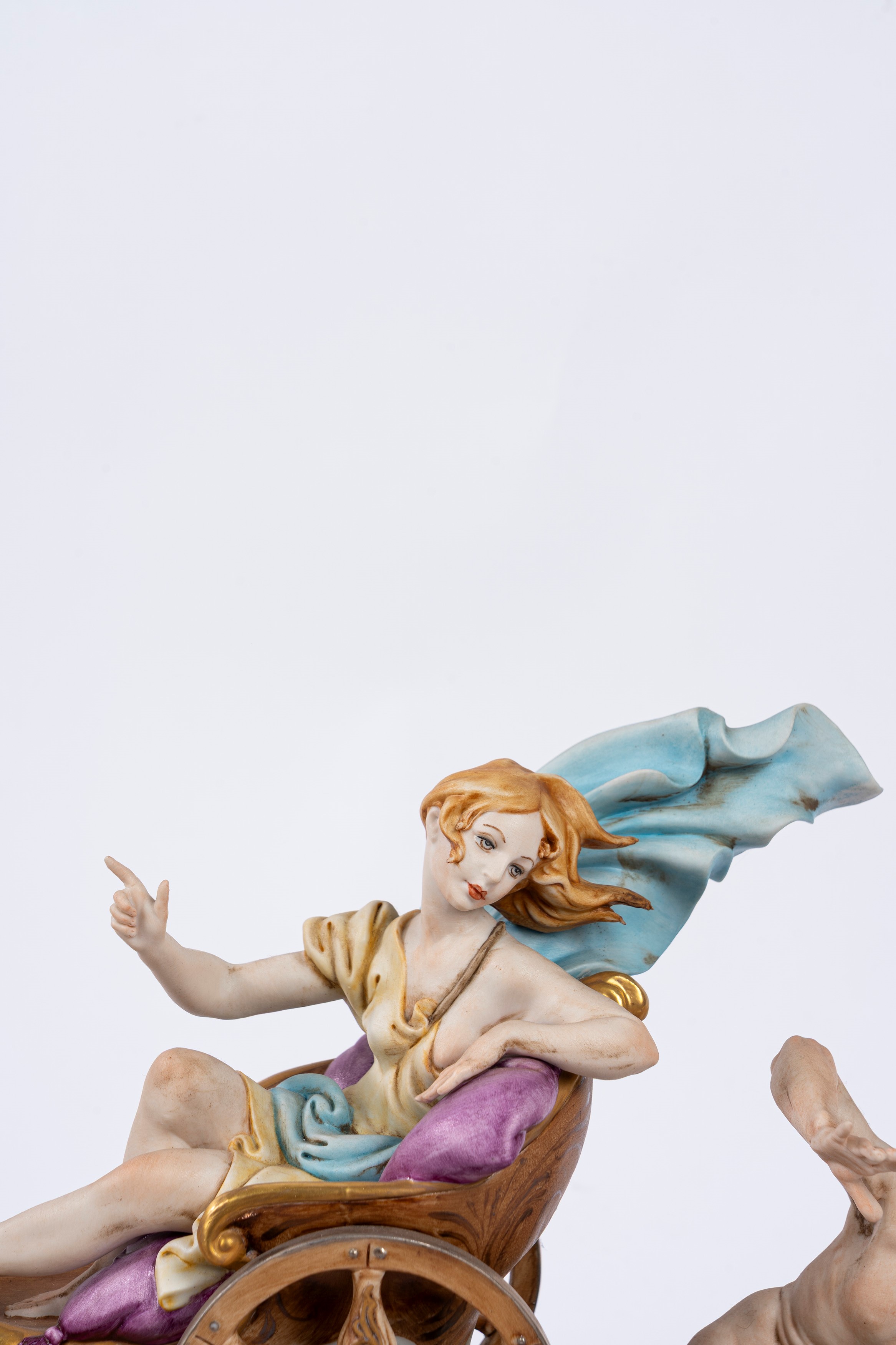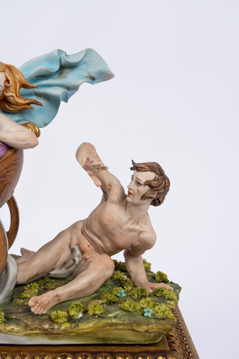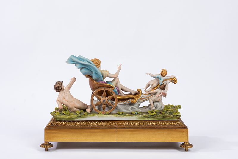 Gruppo in biscuit decorato in policromia, raffigurante il carro di Aurora