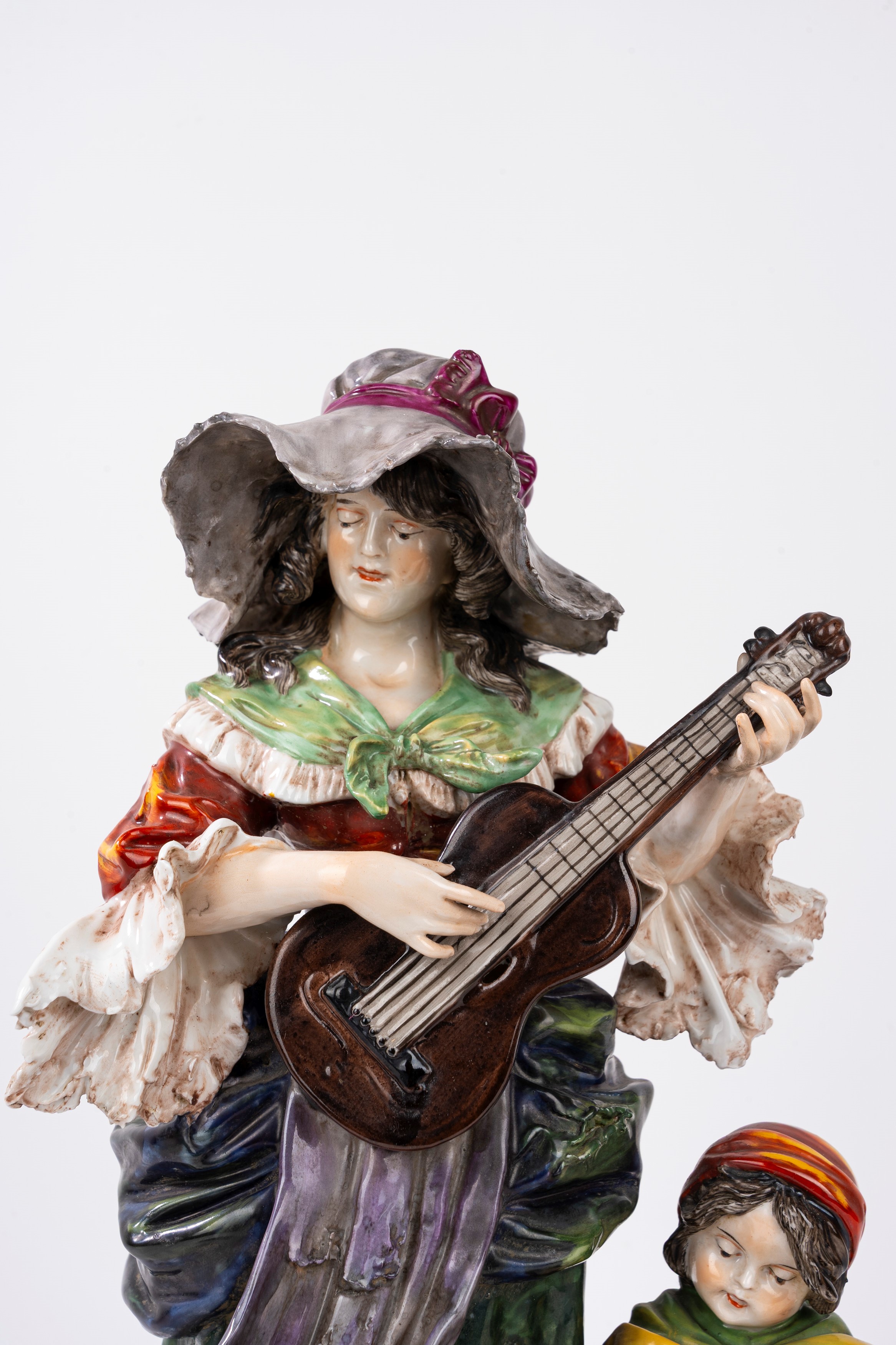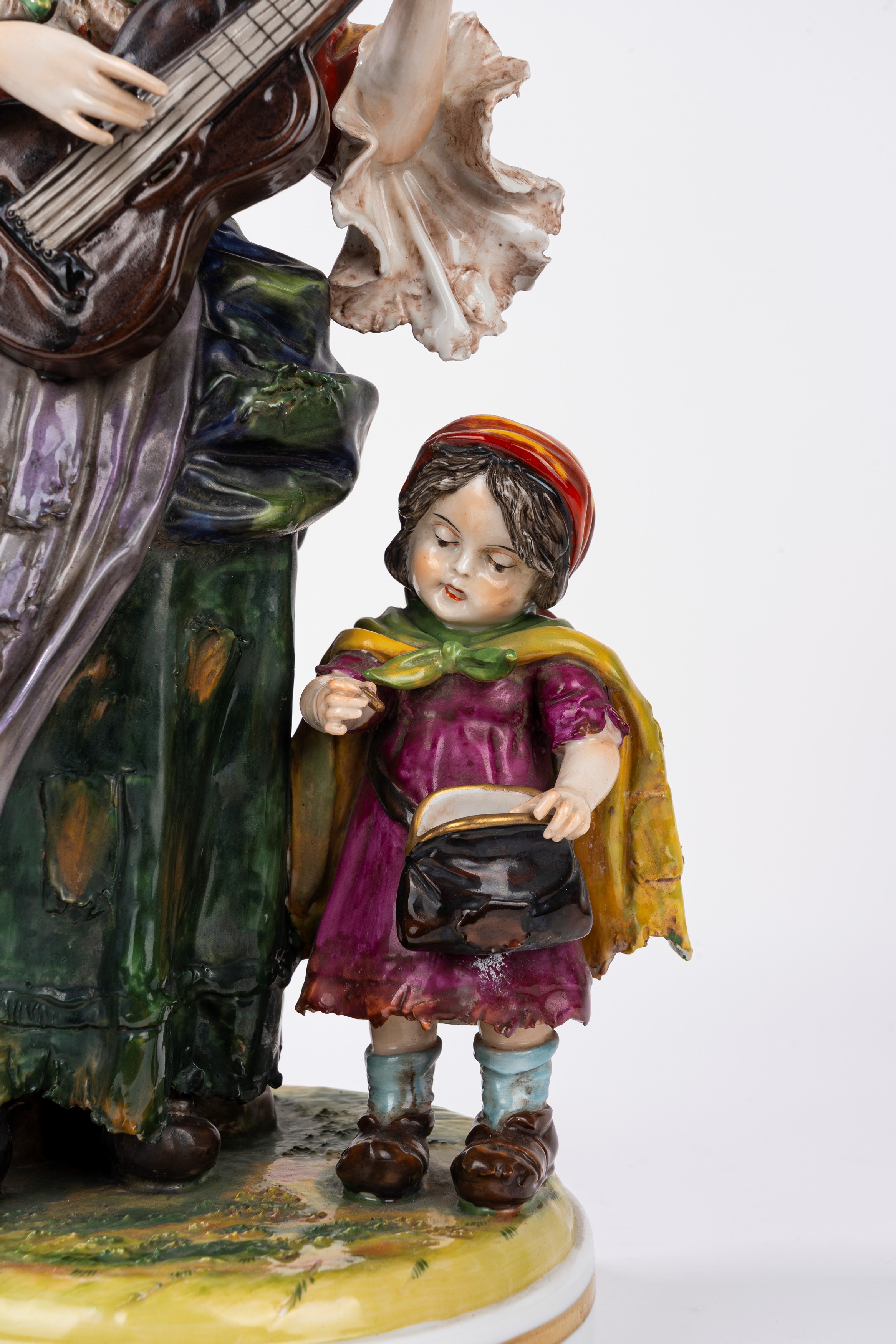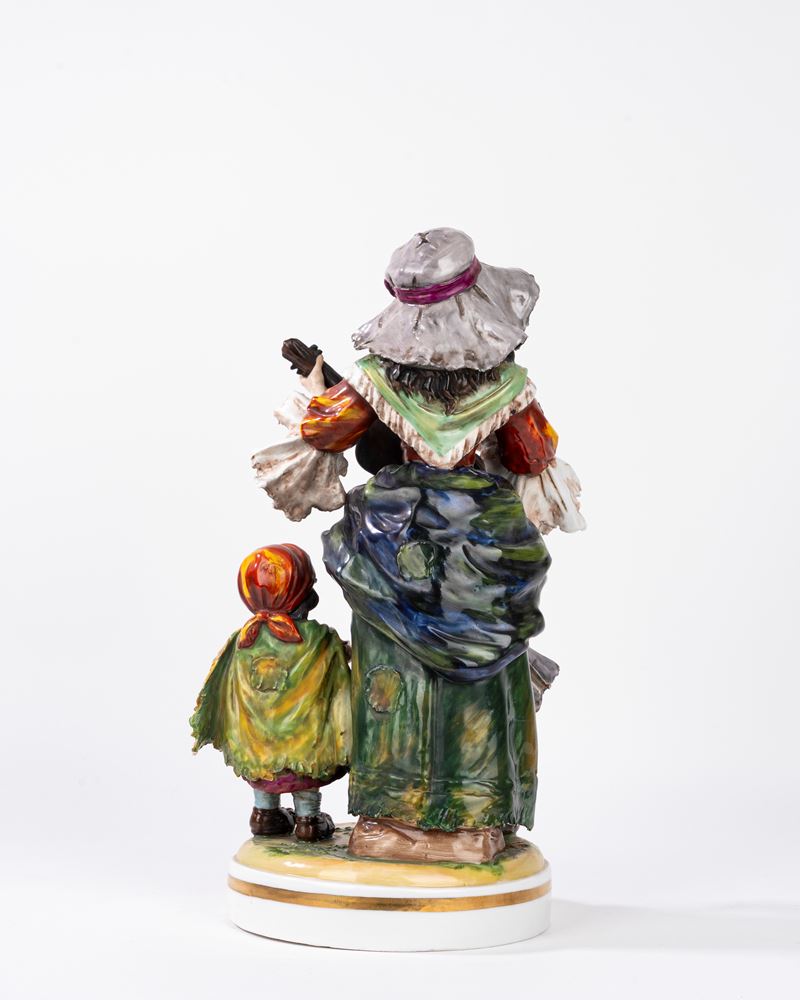 Gruppo scultoreo in porcellana policroma Capodimonte, raffigurante suonatrice e piccola mendicante, secolo XX