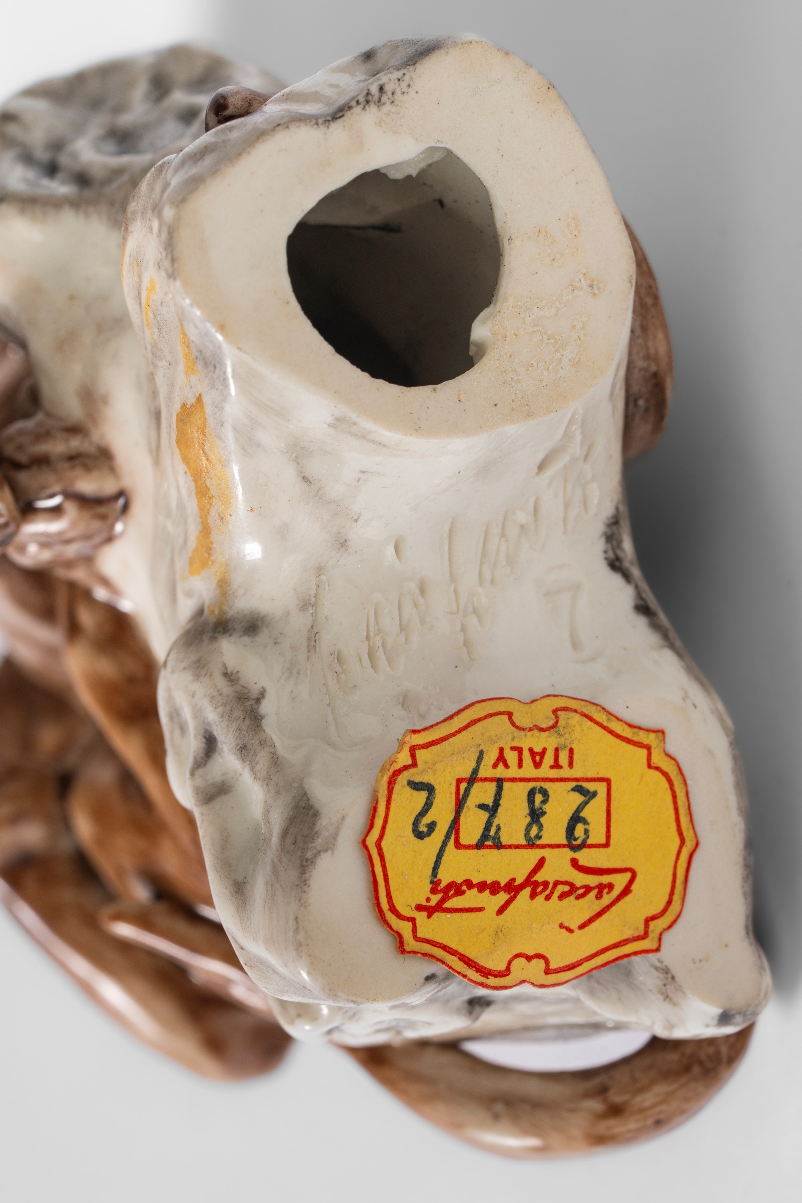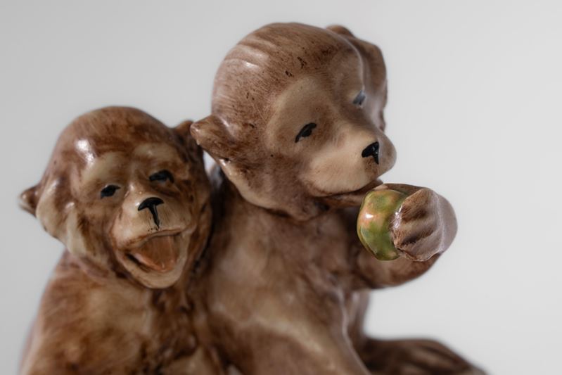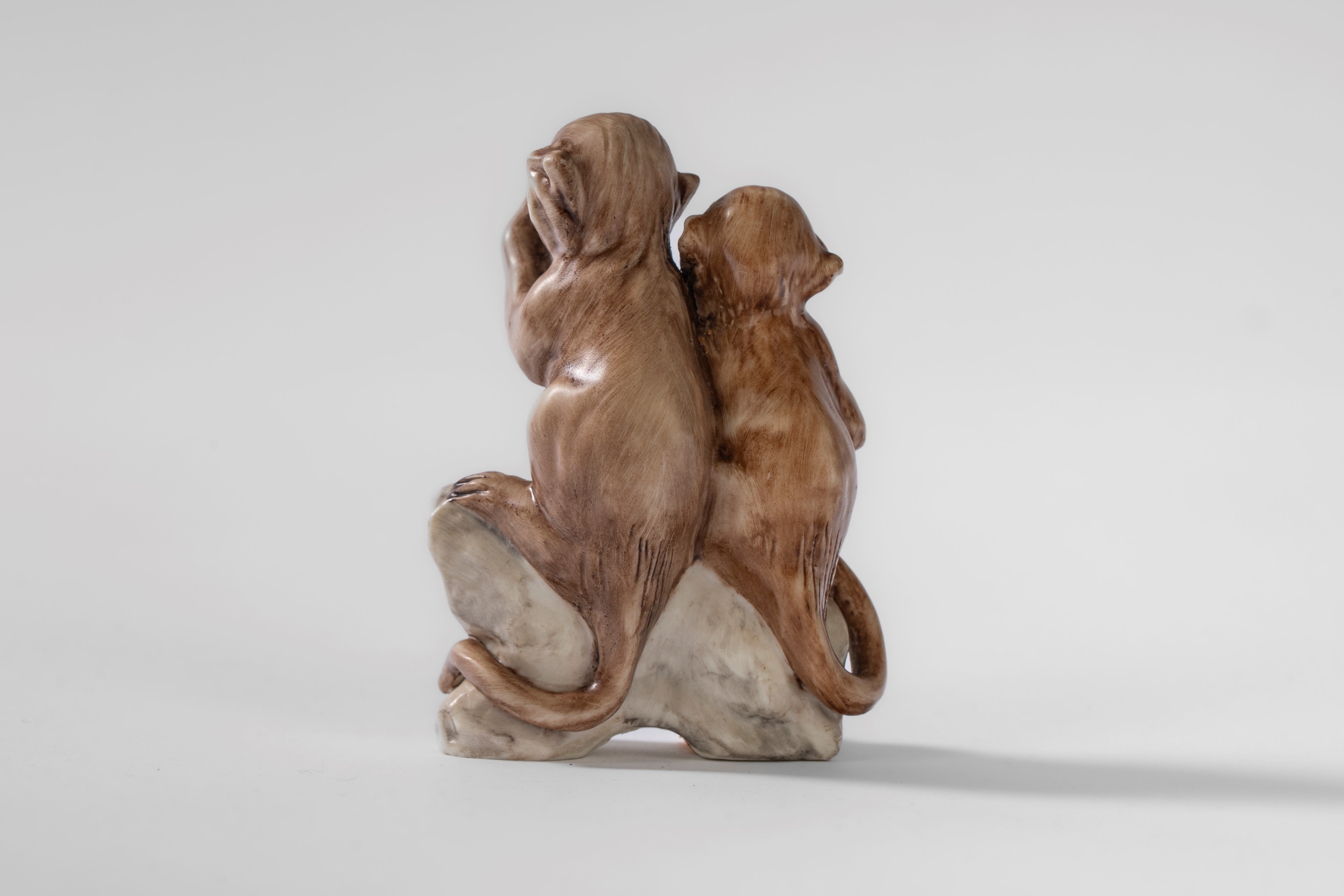 Due scimmiette sedute su un tronco, piccolo gruppo in porcellana policroma.