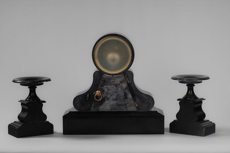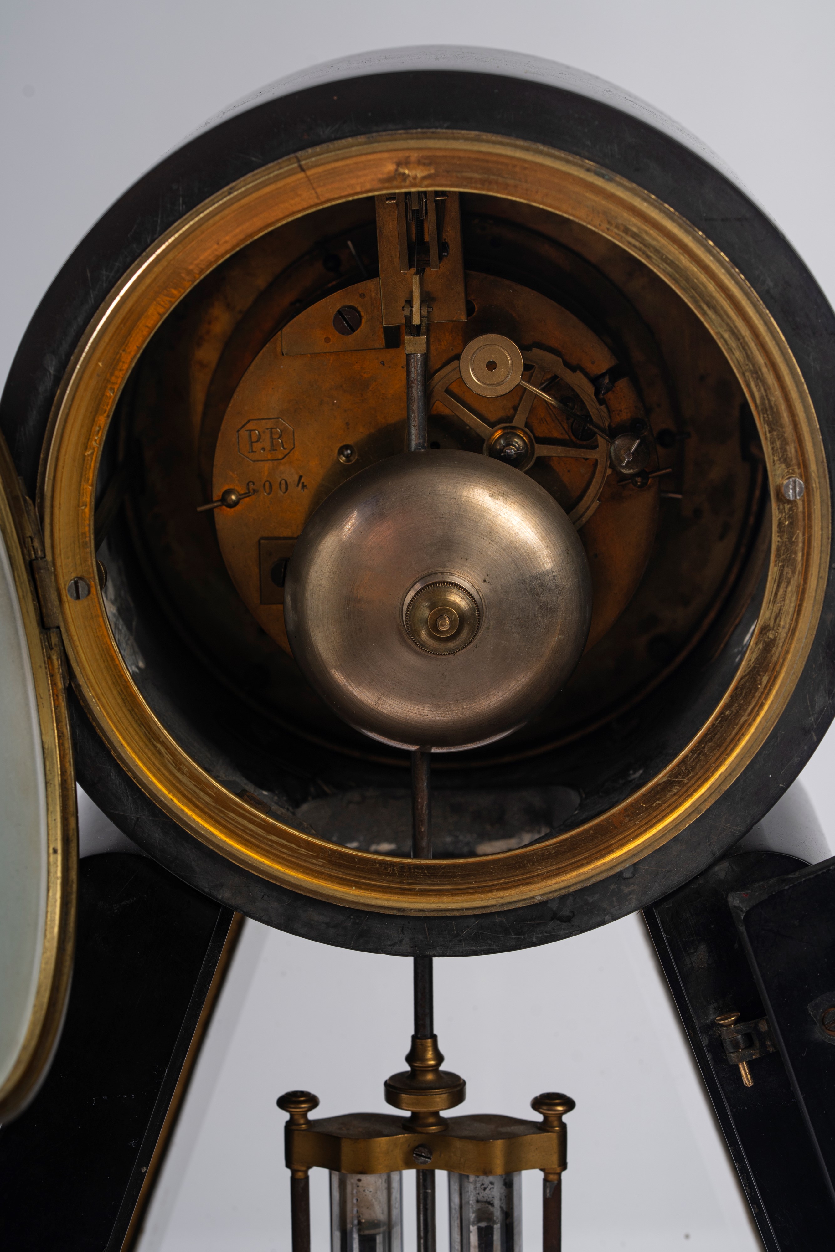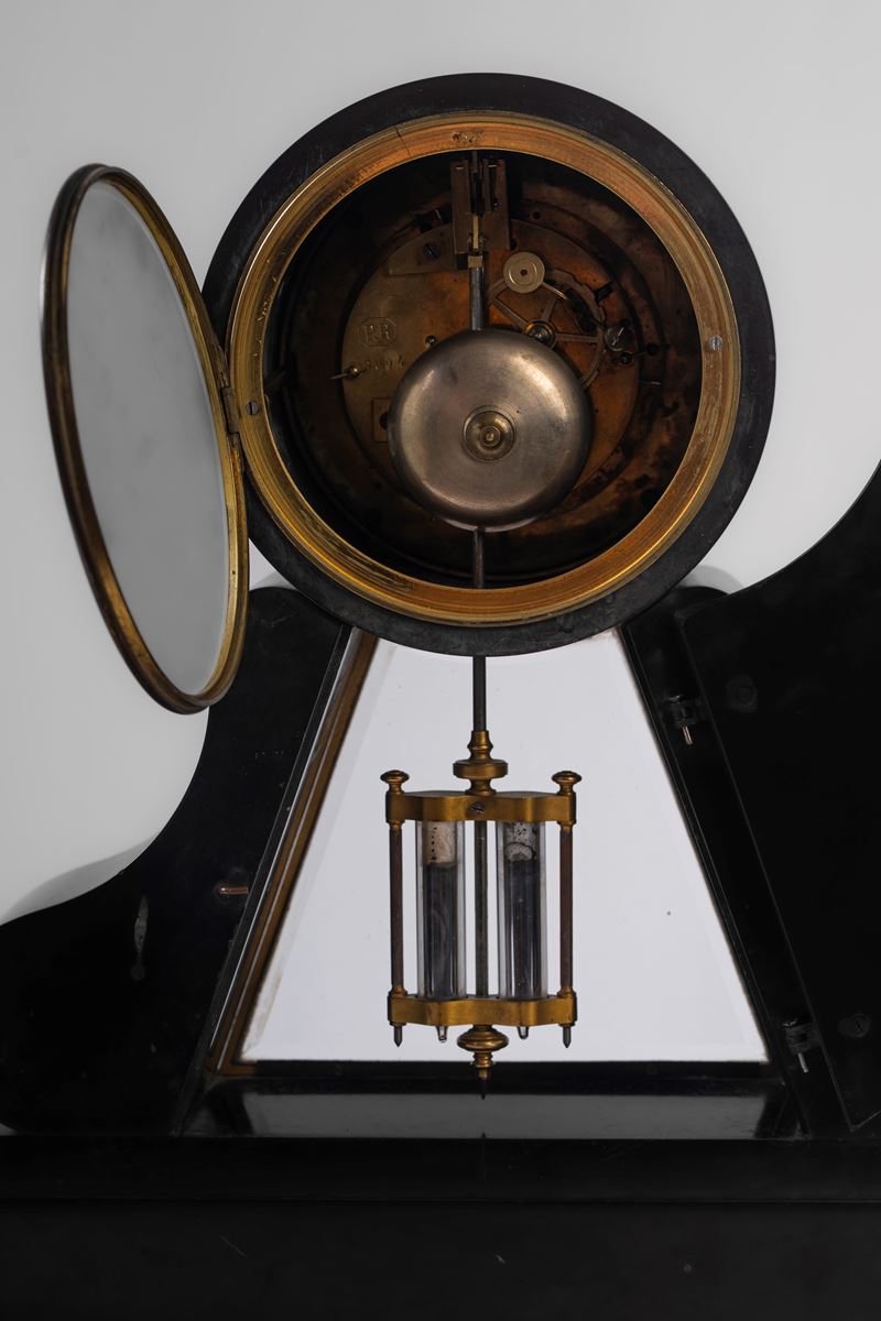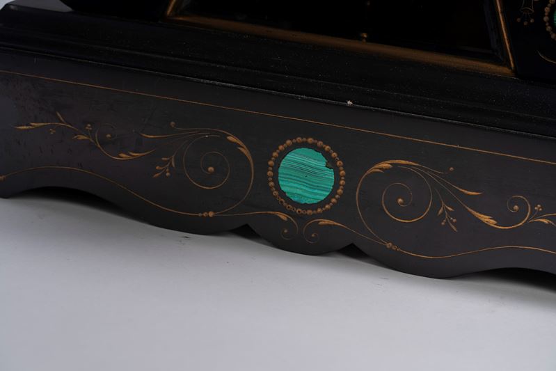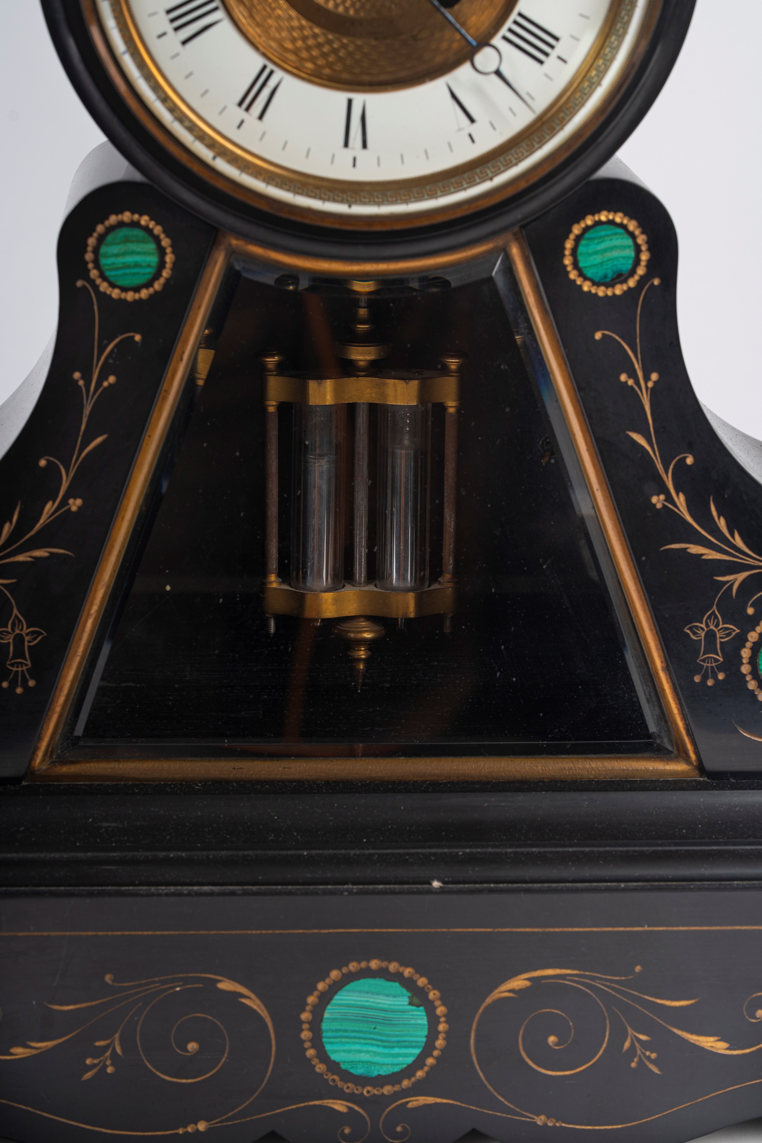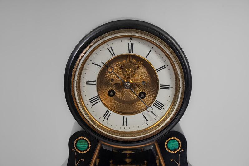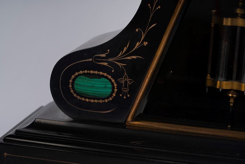 pendola con due alzate di forma architettonica in marmo nero del Belgio con inserti in malachite e filettature a volute fogliate. Quadrante a fascia in smalto bianco con numeri romani per le ore con scappamento "Brocot", lancette in metallo brunito. Pendolo a vista con ampolle in mercurio.