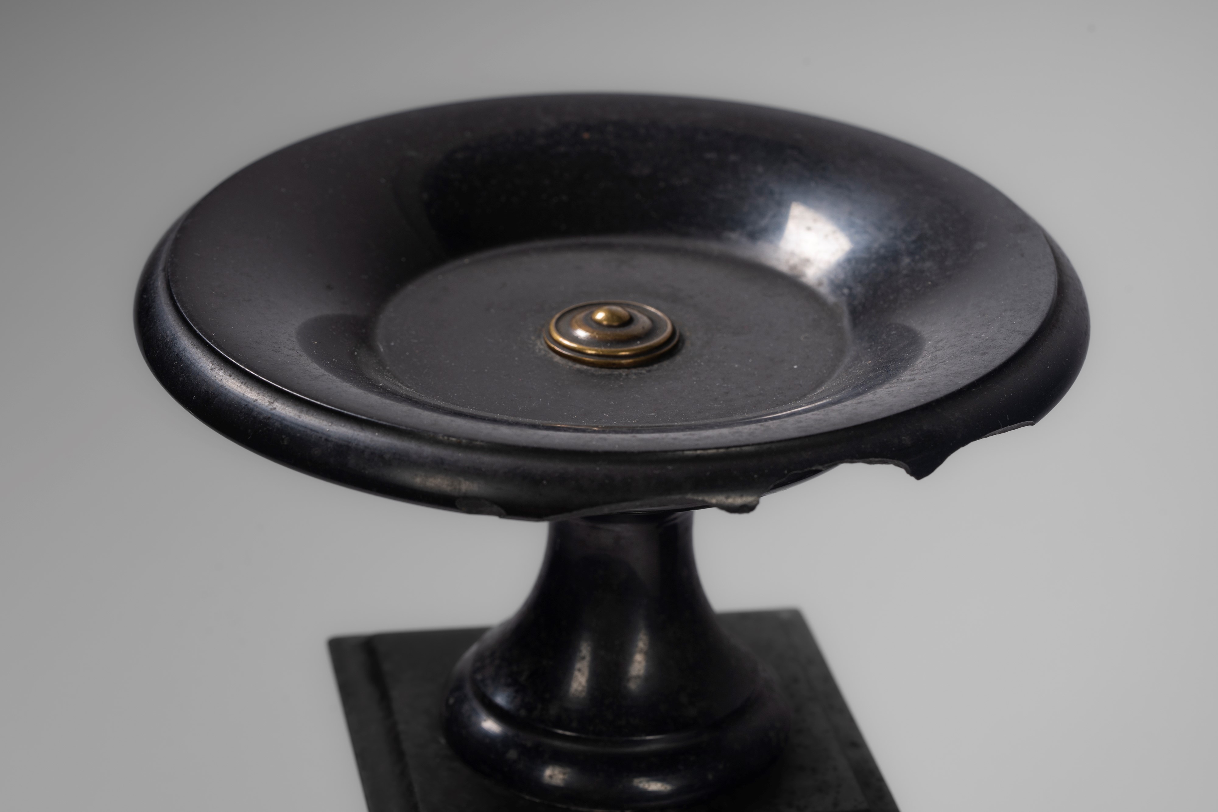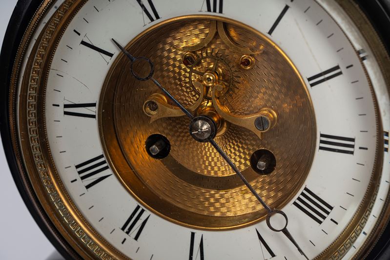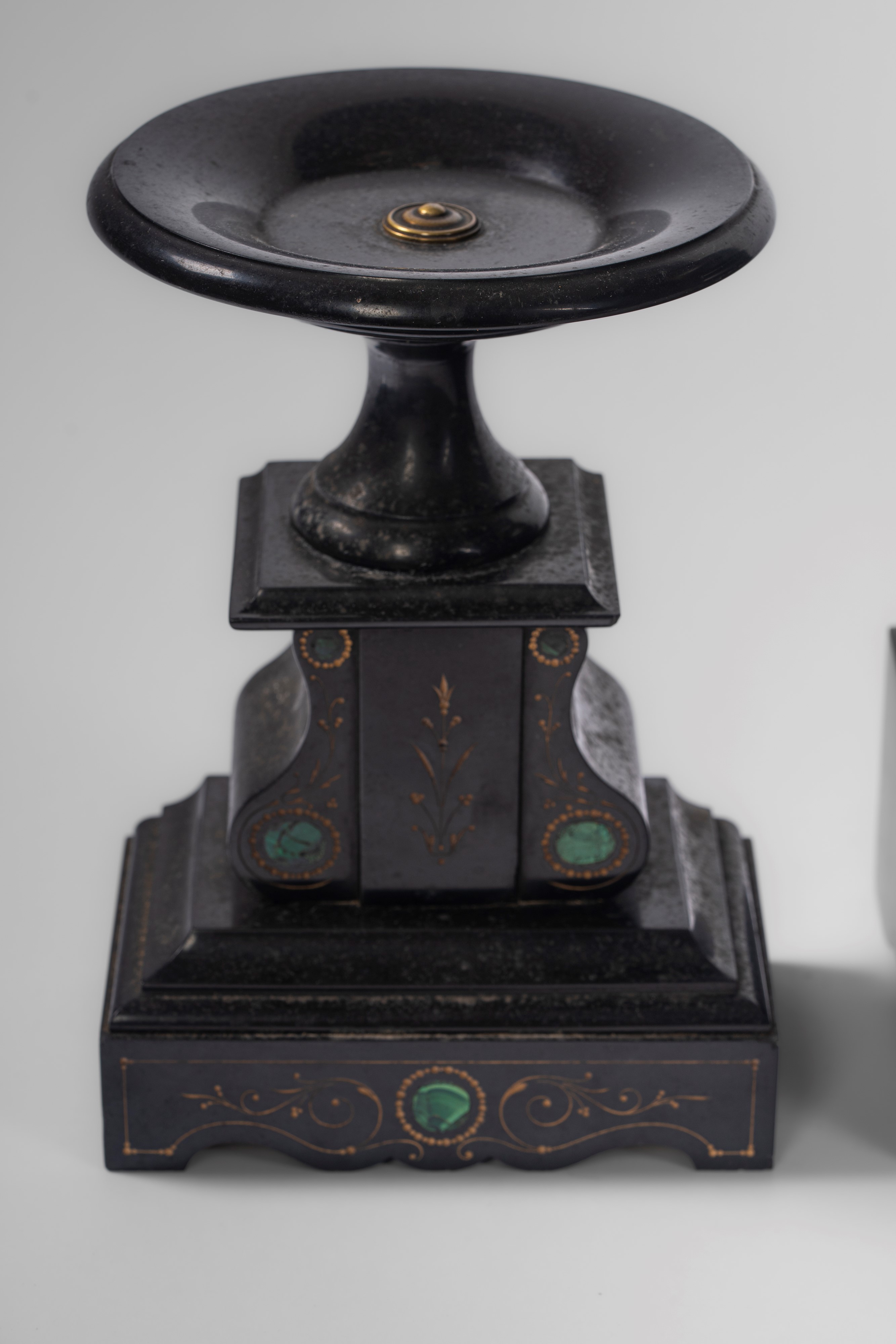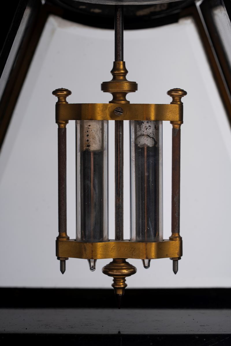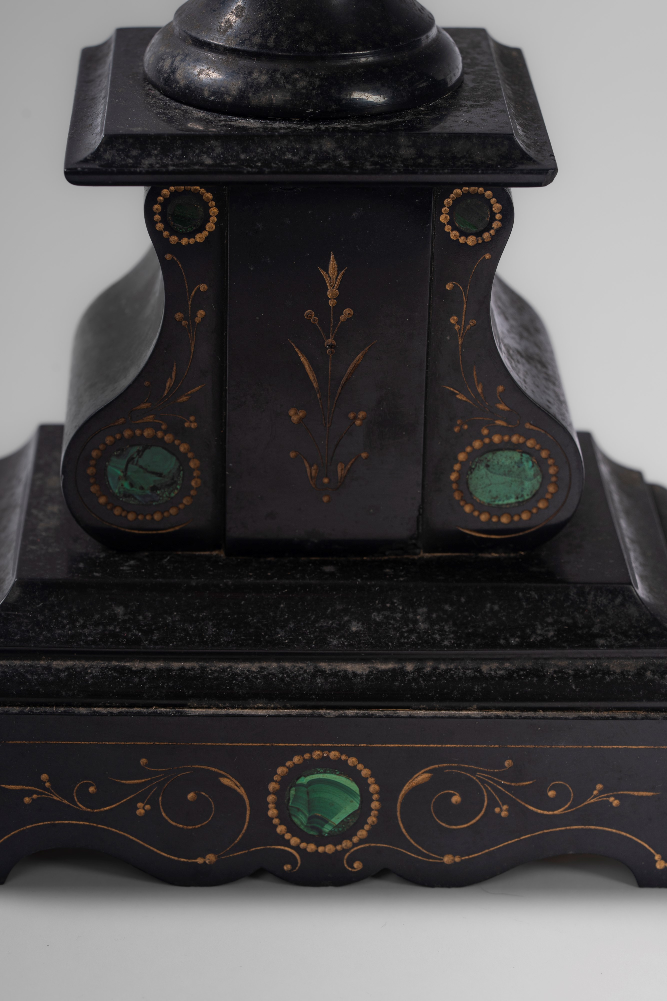 pendola con due alzate di forma architettonica in marmo nero del Belgio con inserti in malachite e filettature a volute fogliate. Quadrante a fascia in smalto bianco con numeri romani per le ore con scappamento "Brocot", lancette in metallo brunito. Pendolo a vista con ampolle in mercurio.
