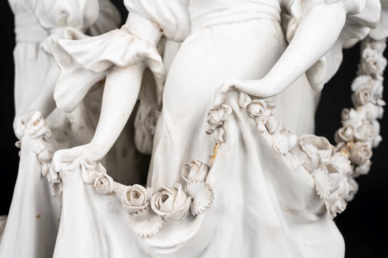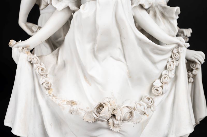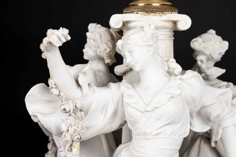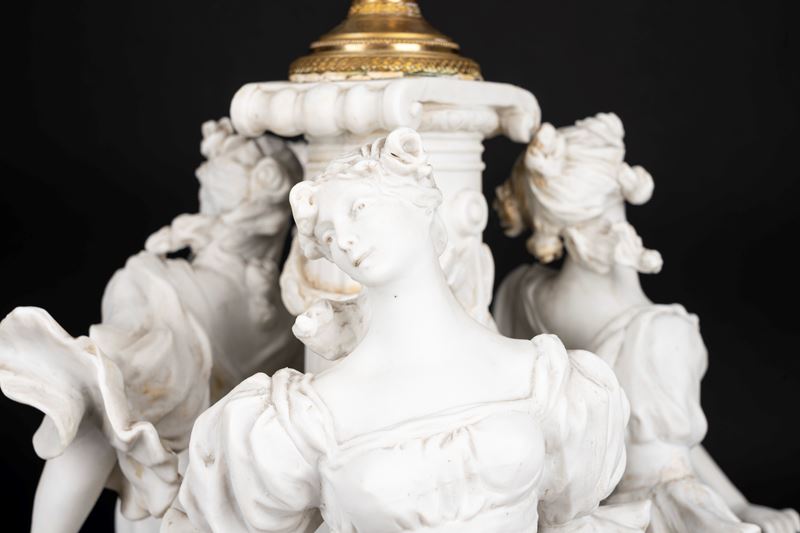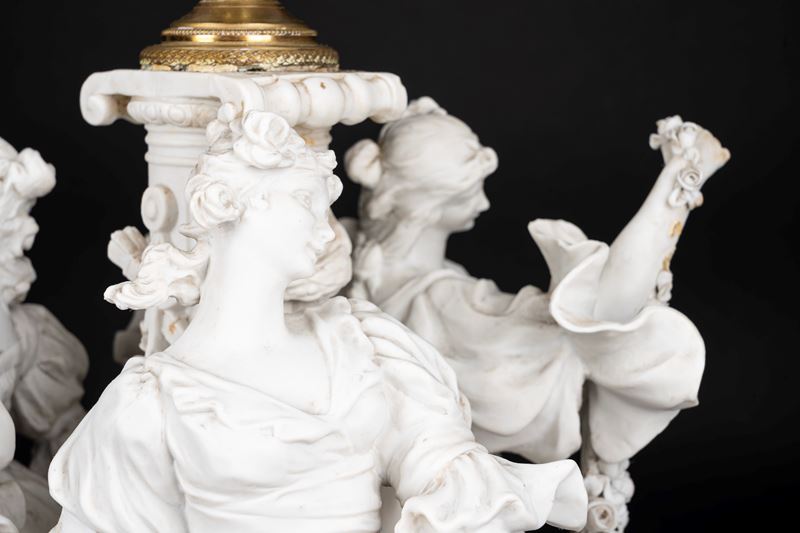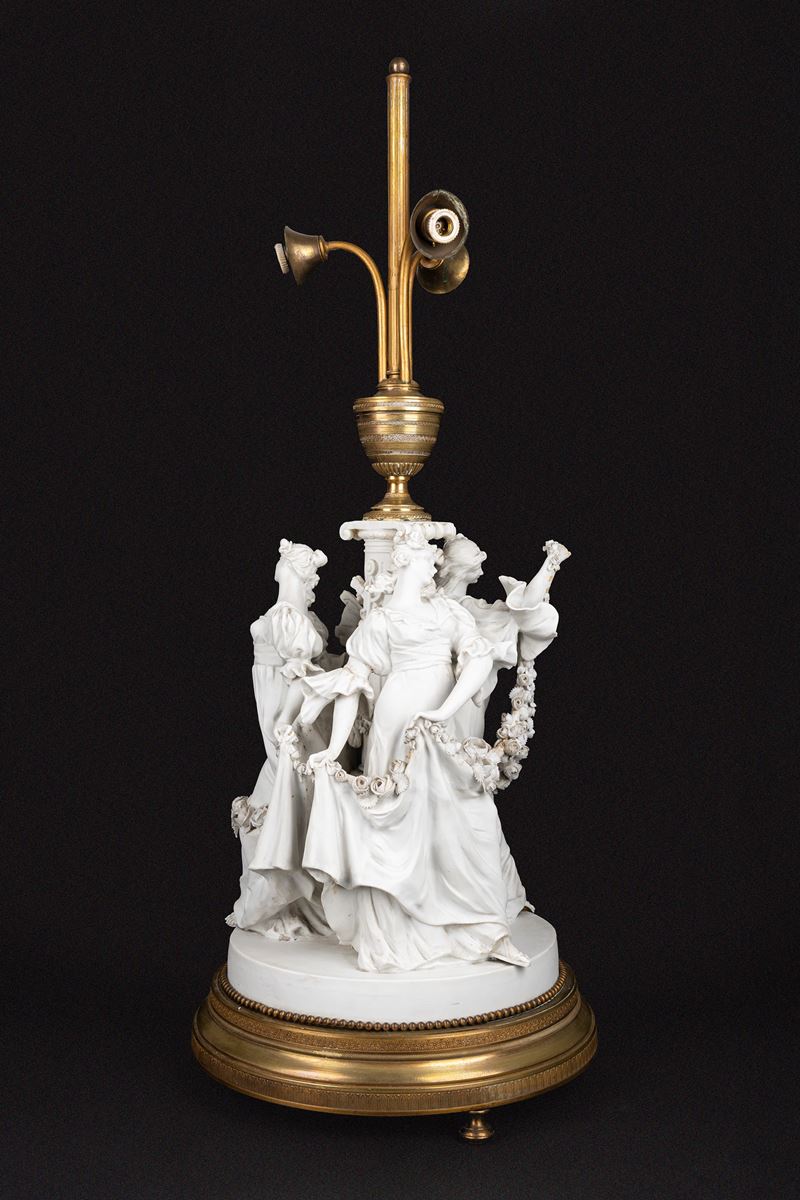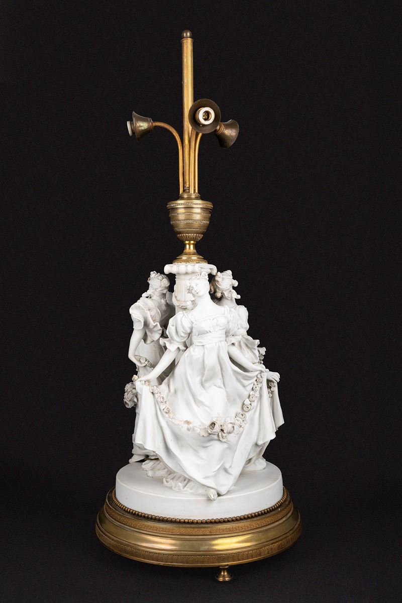 Lampada da tavolo in biscuit e bronzo dorato, con fusto con tre fanciulle danzanti e ghirlande di rose, inizi secolo XX