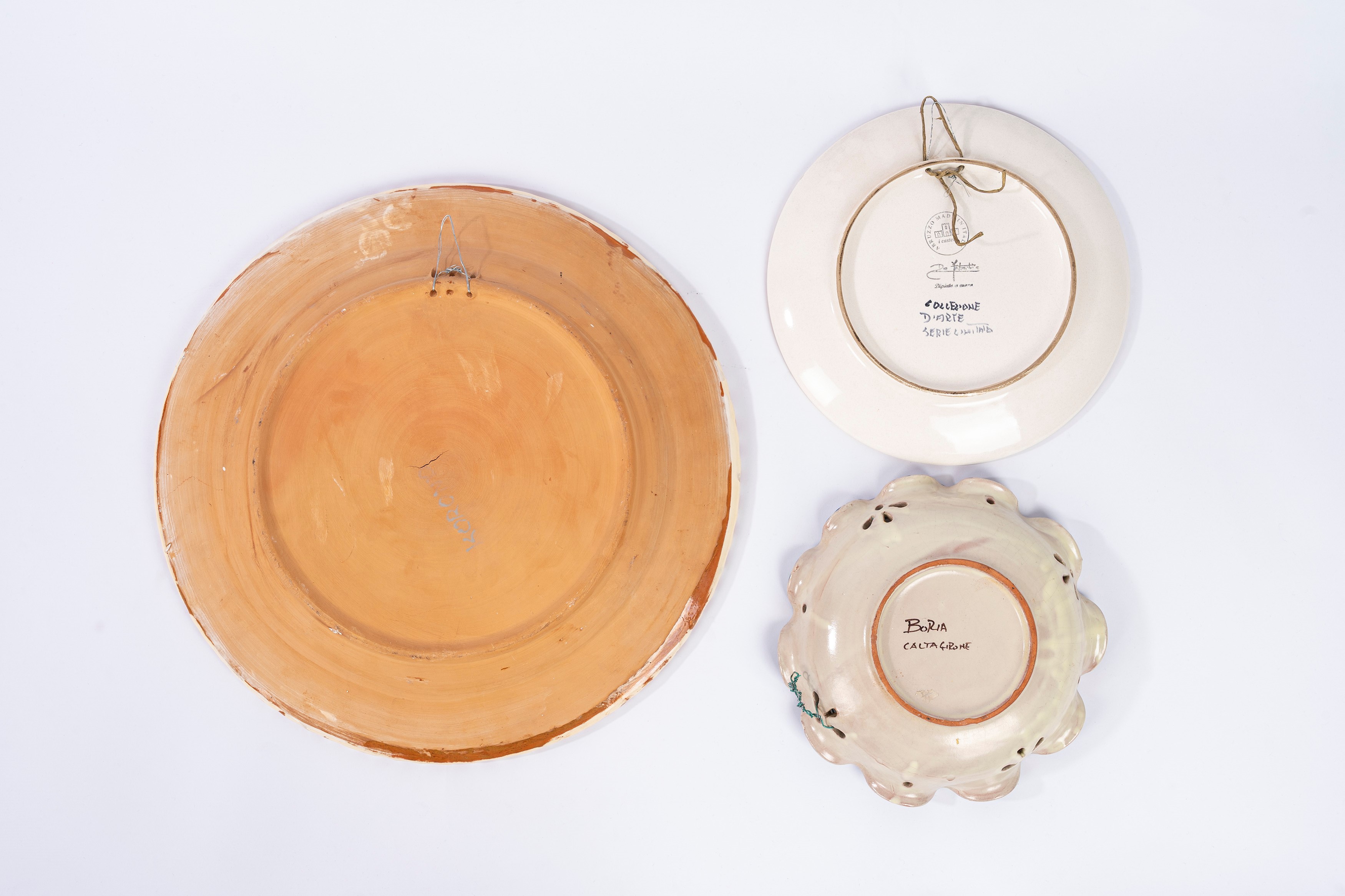 Lotto composto da 3 piatti in maiolica di manifatture differenti: Caltagirone, Koronos e Castelli