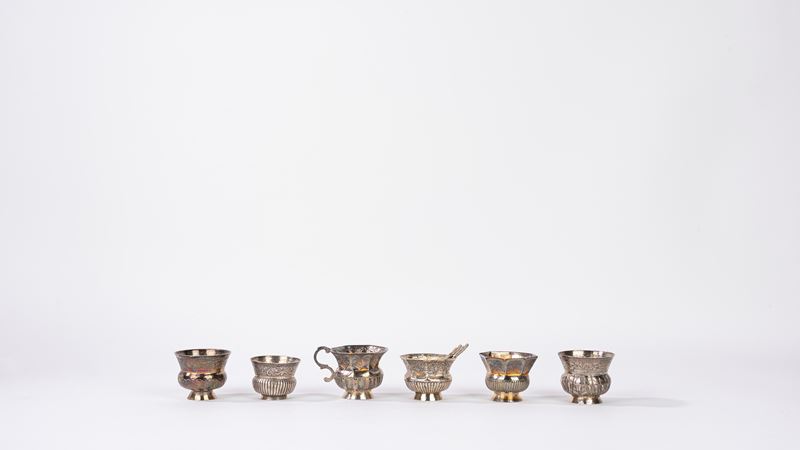 Lotto composto da cinque bicchierini e una tazzina in argento, Russia secolo XIX