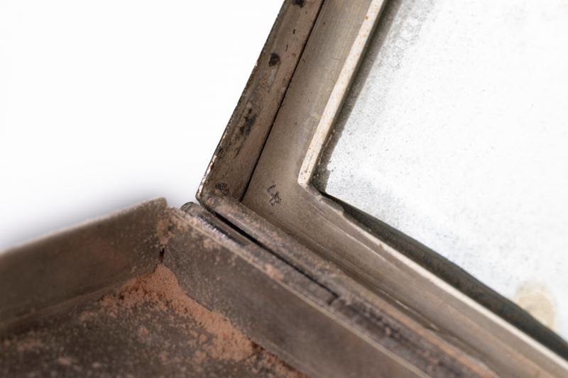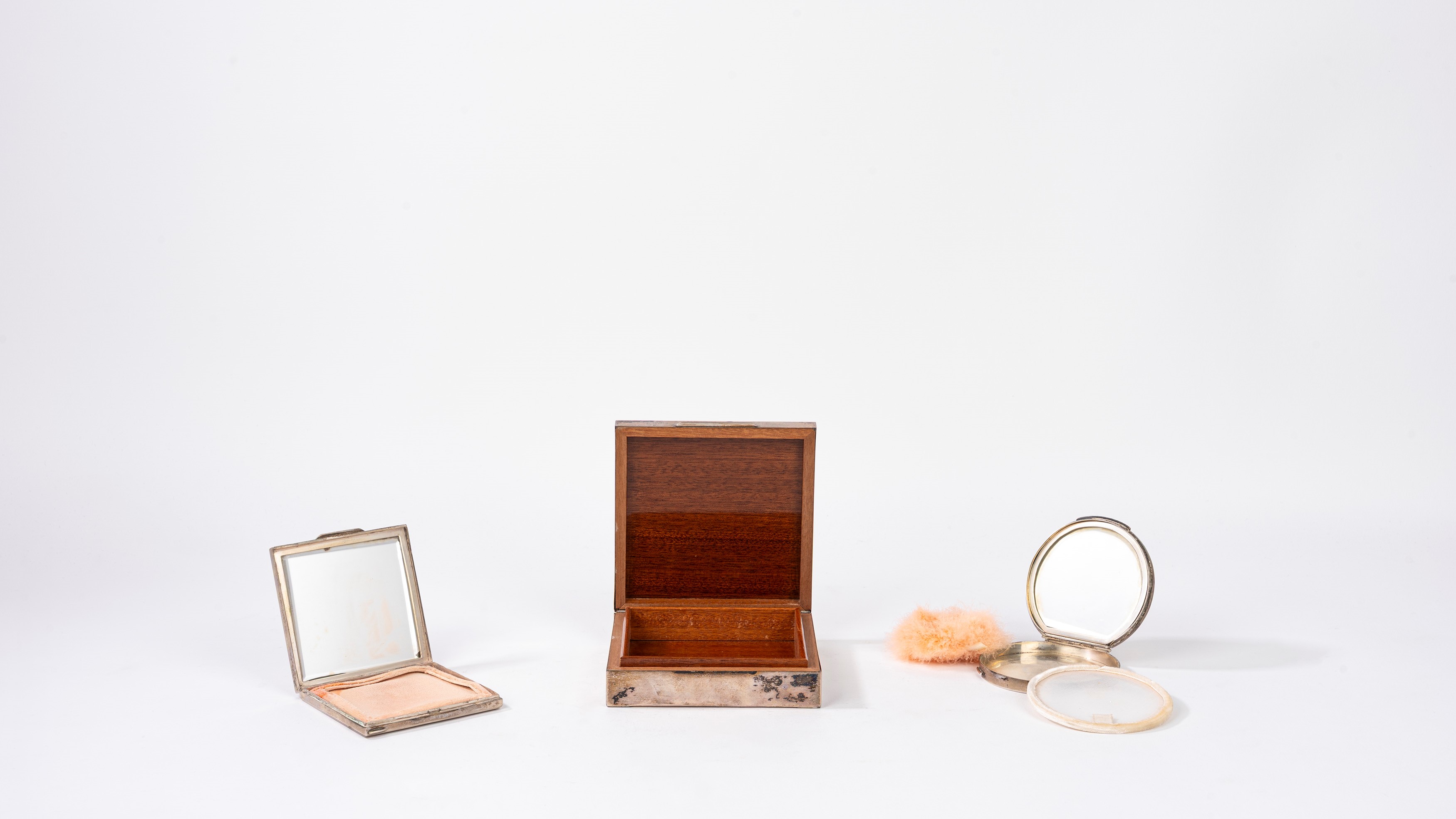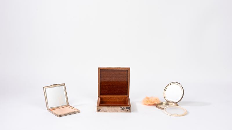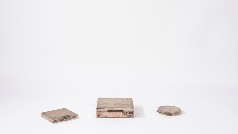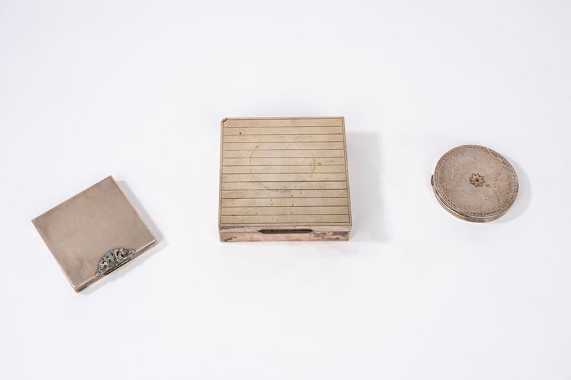 Lotto composto da due portacipria in argento 800 e una scatola portasigarette rivestita in lamina d'argento