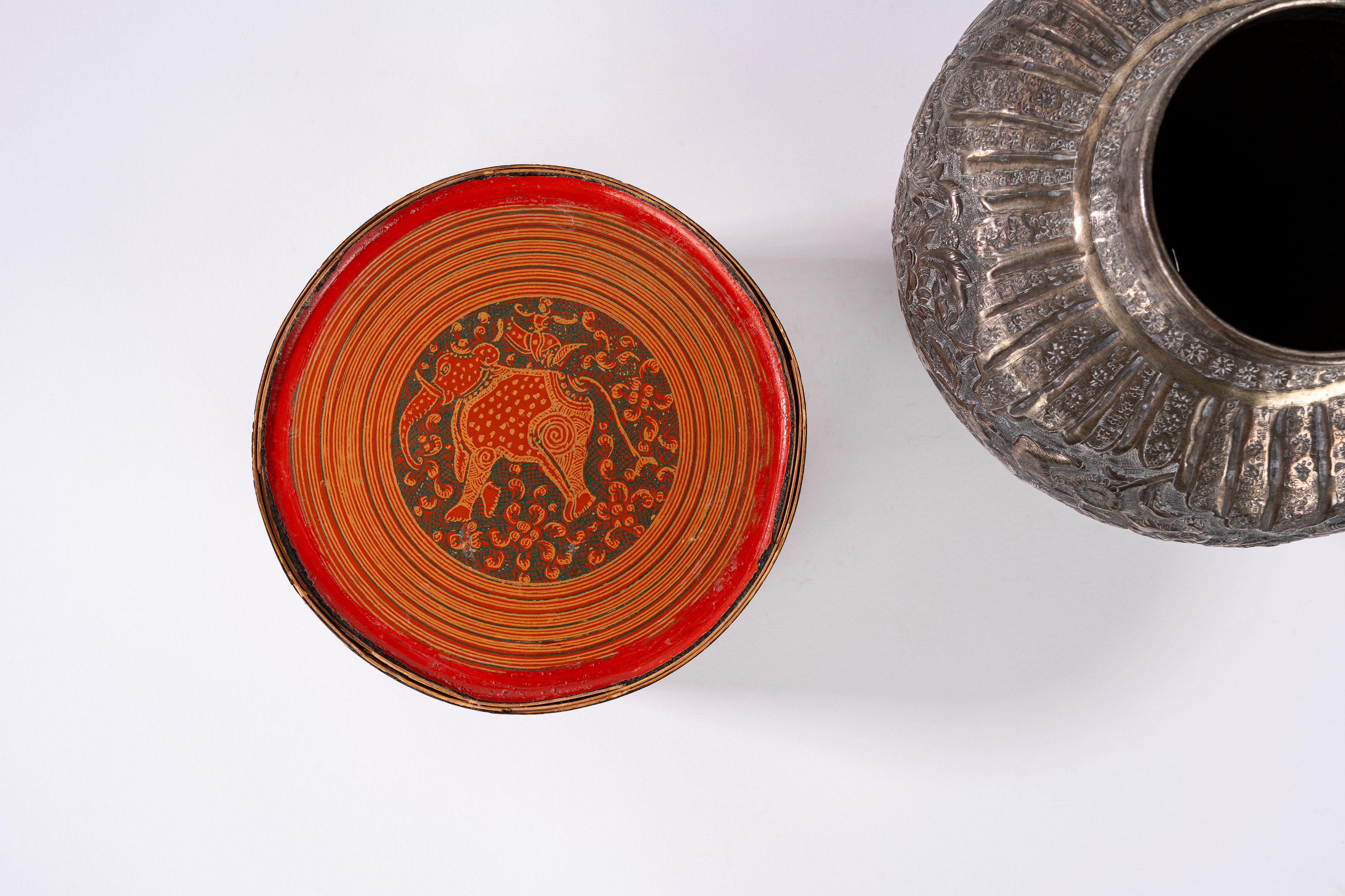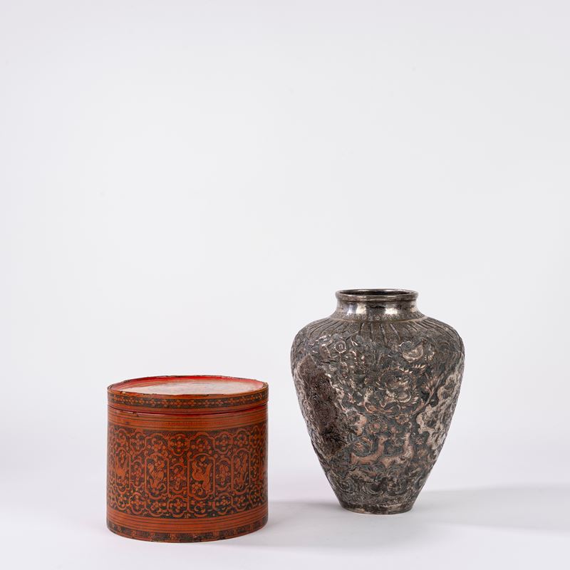 Lotto composto da scatola cilindrica in lacca, India, e un vaso in metallo argentato, Persia