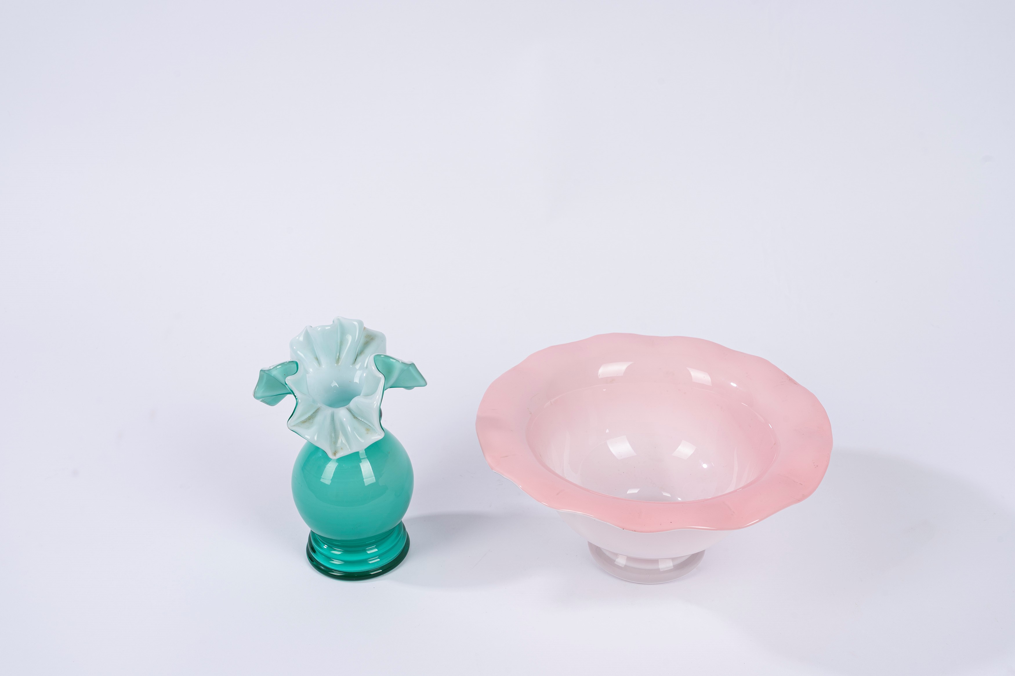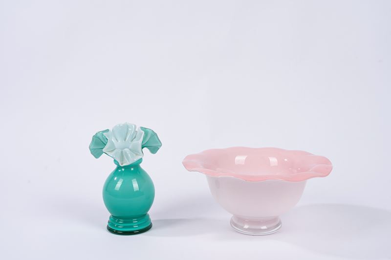 la ciotola in vetro incamiciato rosa, il vasetto in vetro incamiciato in acquamarina con bordo a fazzoletto