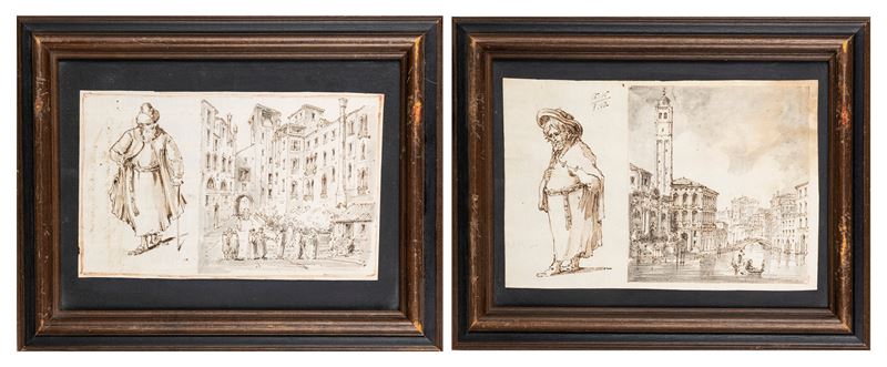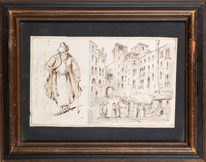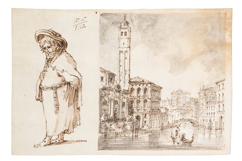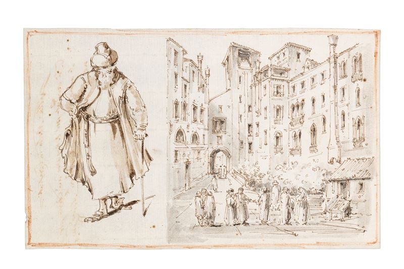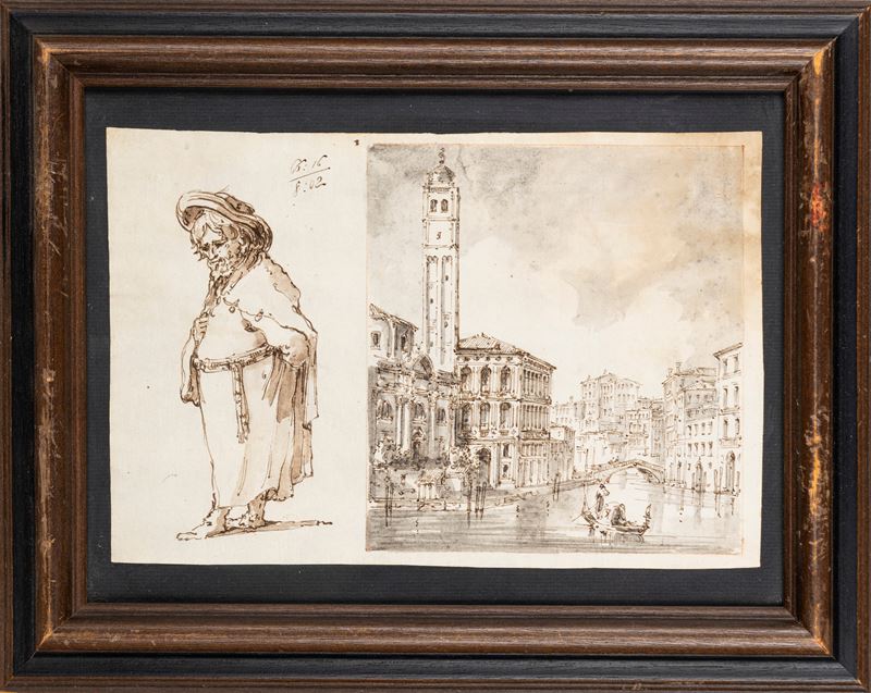 Due disegni con vedute di Venezia e studi di personaggi