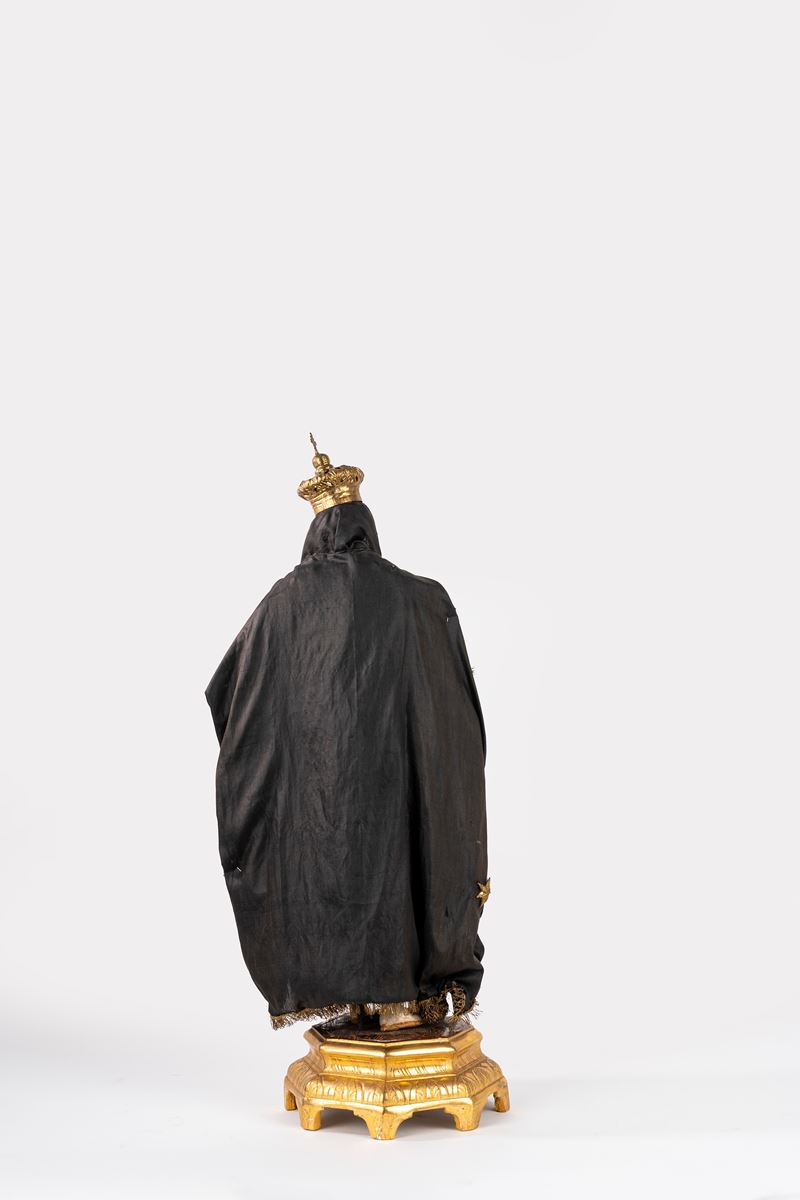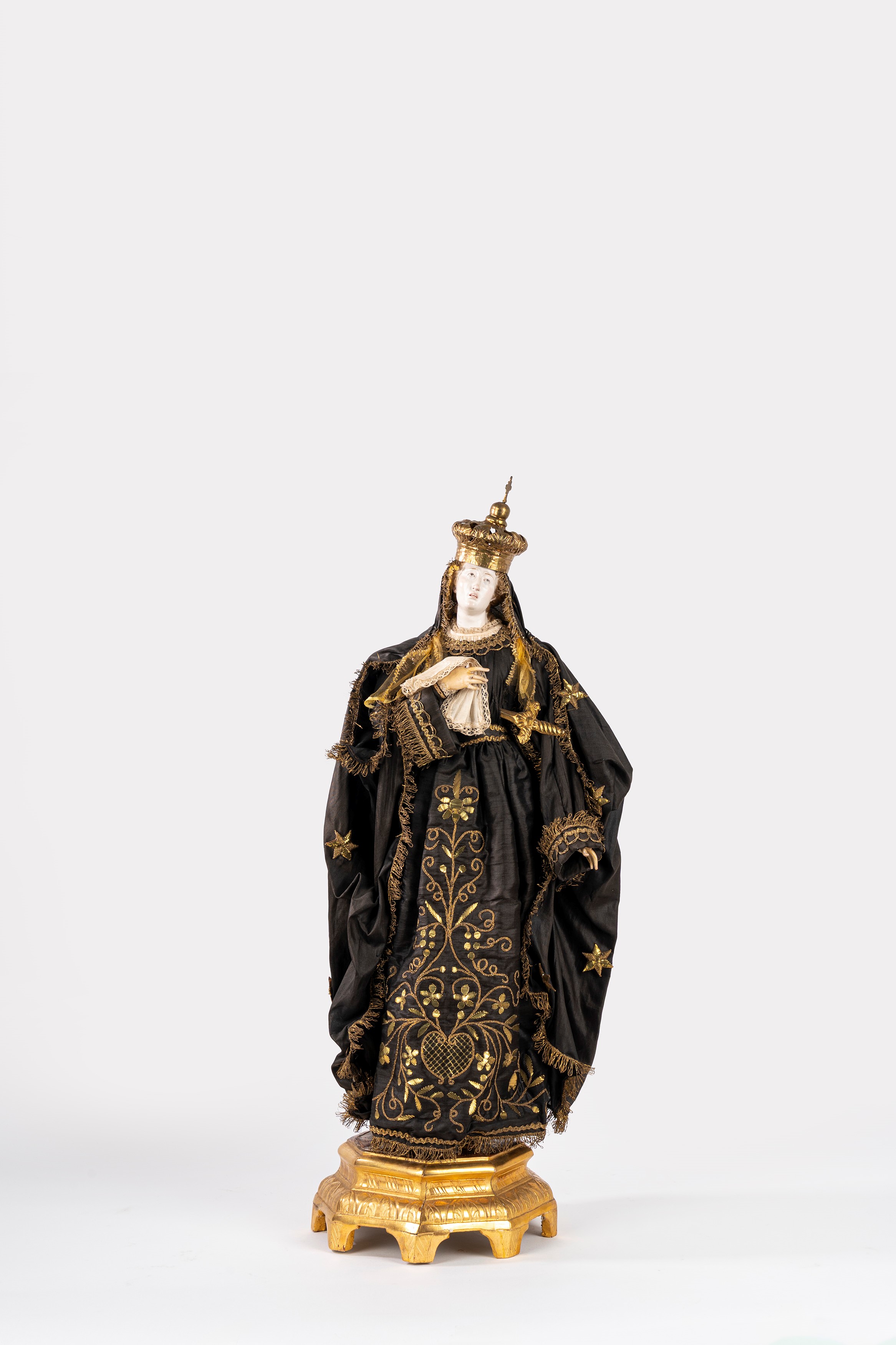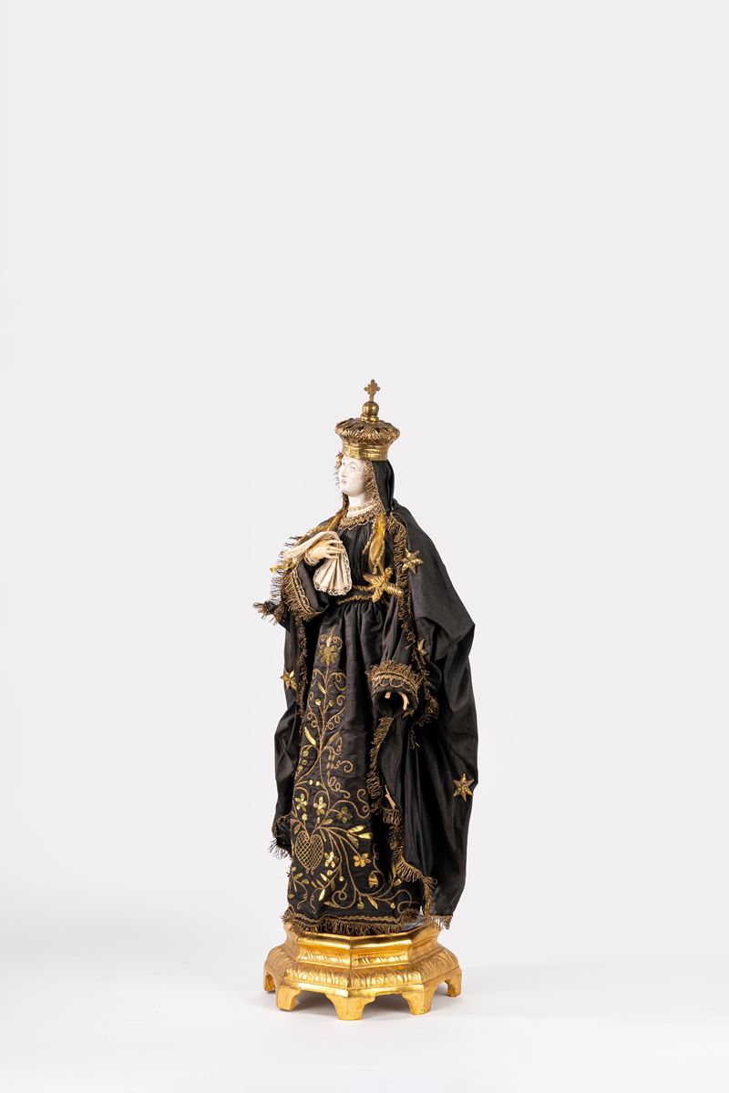 Antica scultura in legno intagliato e policromo raffigurante Madonna orante. Manifattura portoghese