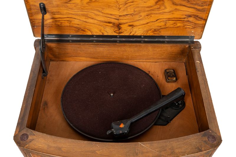 con piano apribile e giradischi all'interno, libretto originale per memorizzare le stazioni e scatolina con puntine di ricambio