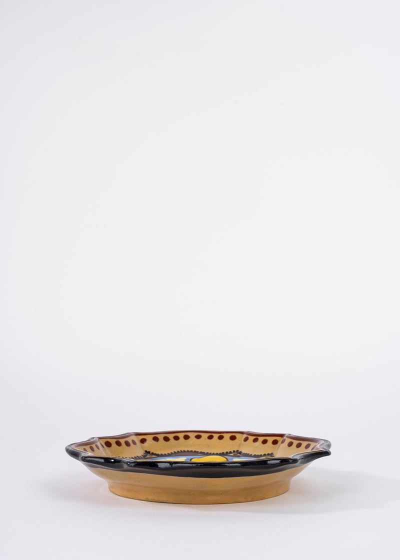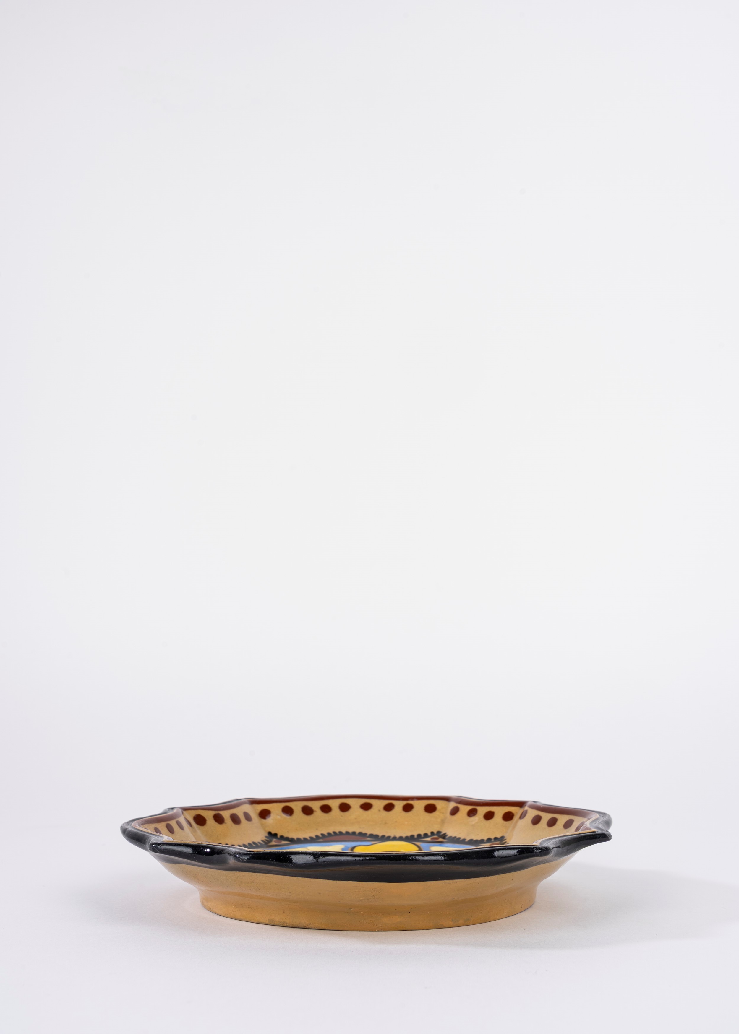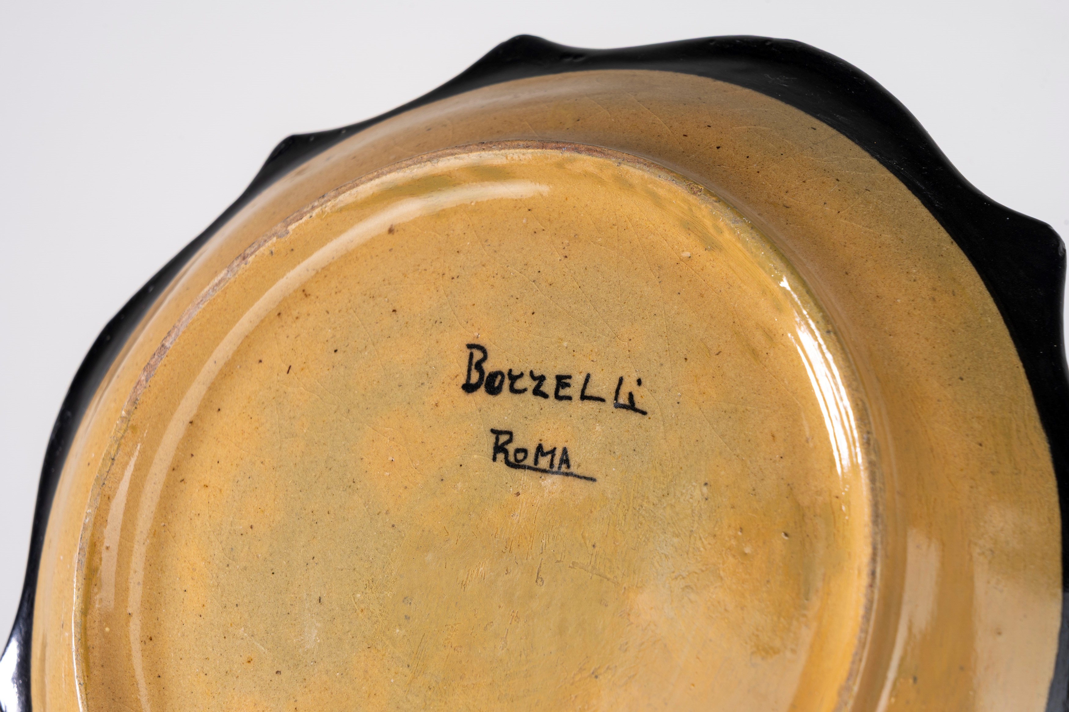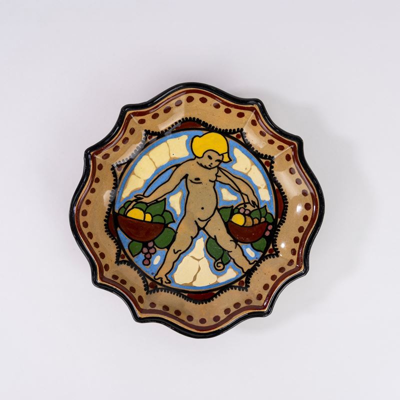 con profilo mistilineo, decorato nel cavetto con bimba con cesti di frutta