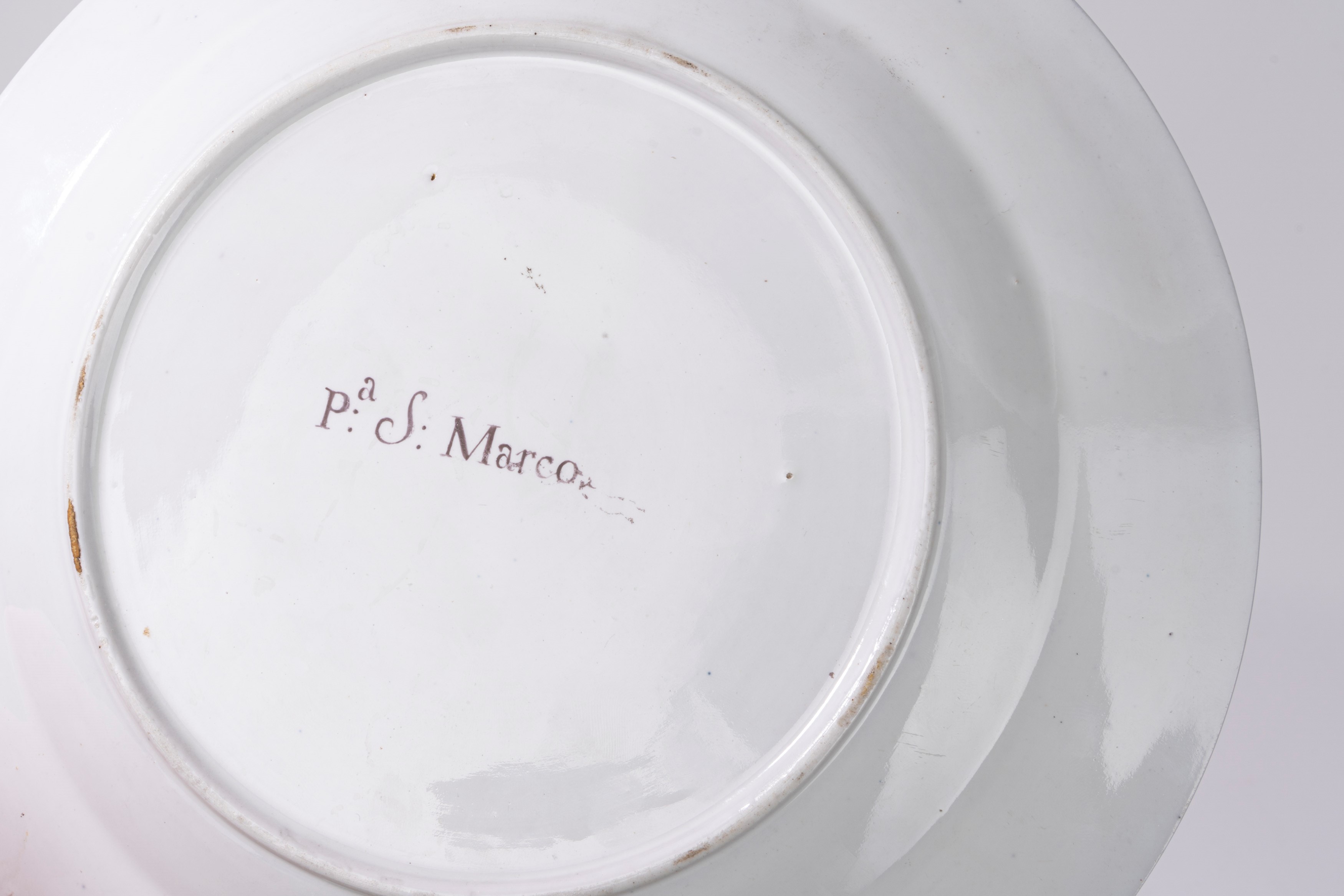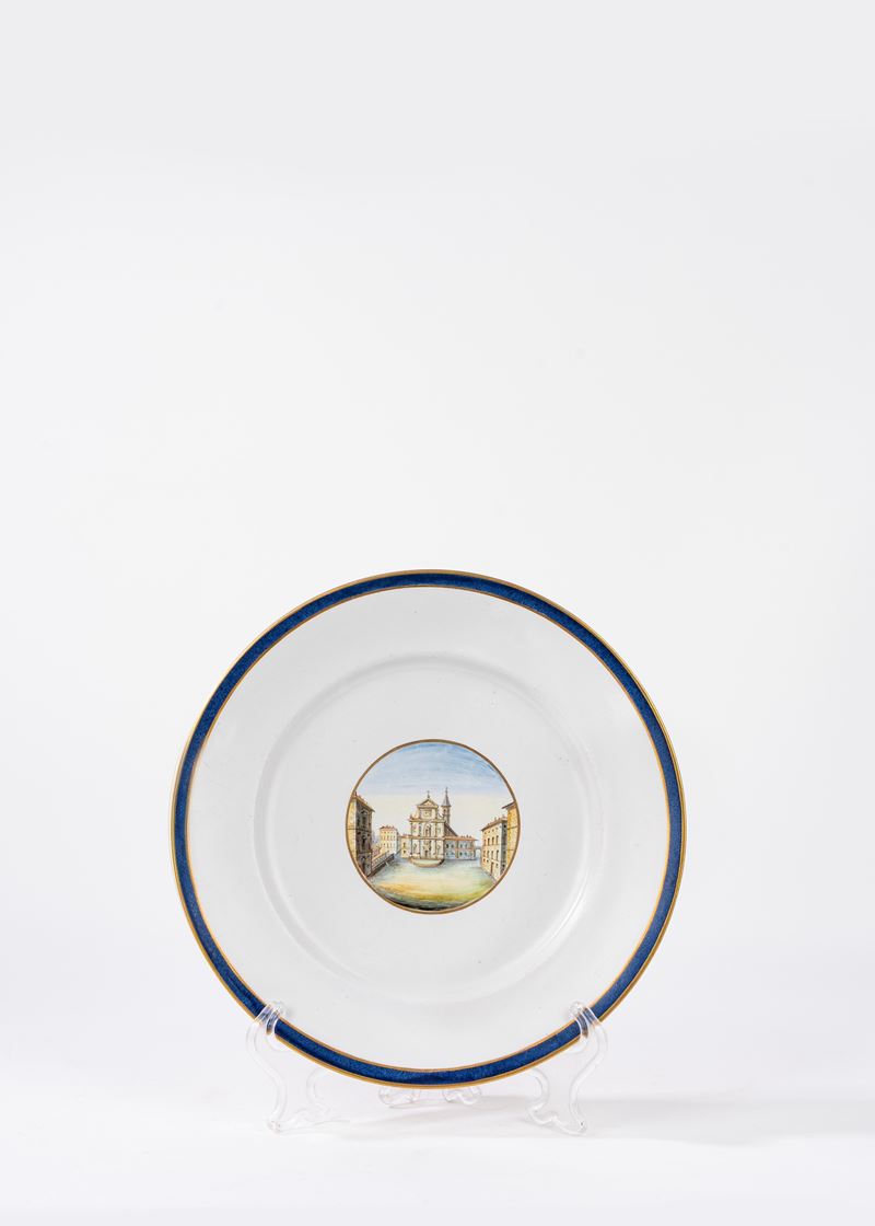Questo piatto appartiene alla serie "a vedute", prodotta dalla manifattura Ginori tra il 1792 e il 1837, sotto la direzione di Carlo Leopoldo Ginori. Questo tipo di decorazione era tipica del pittore Ferdinando Ammannati, attivo a Doccia dal 1808 al 1823.