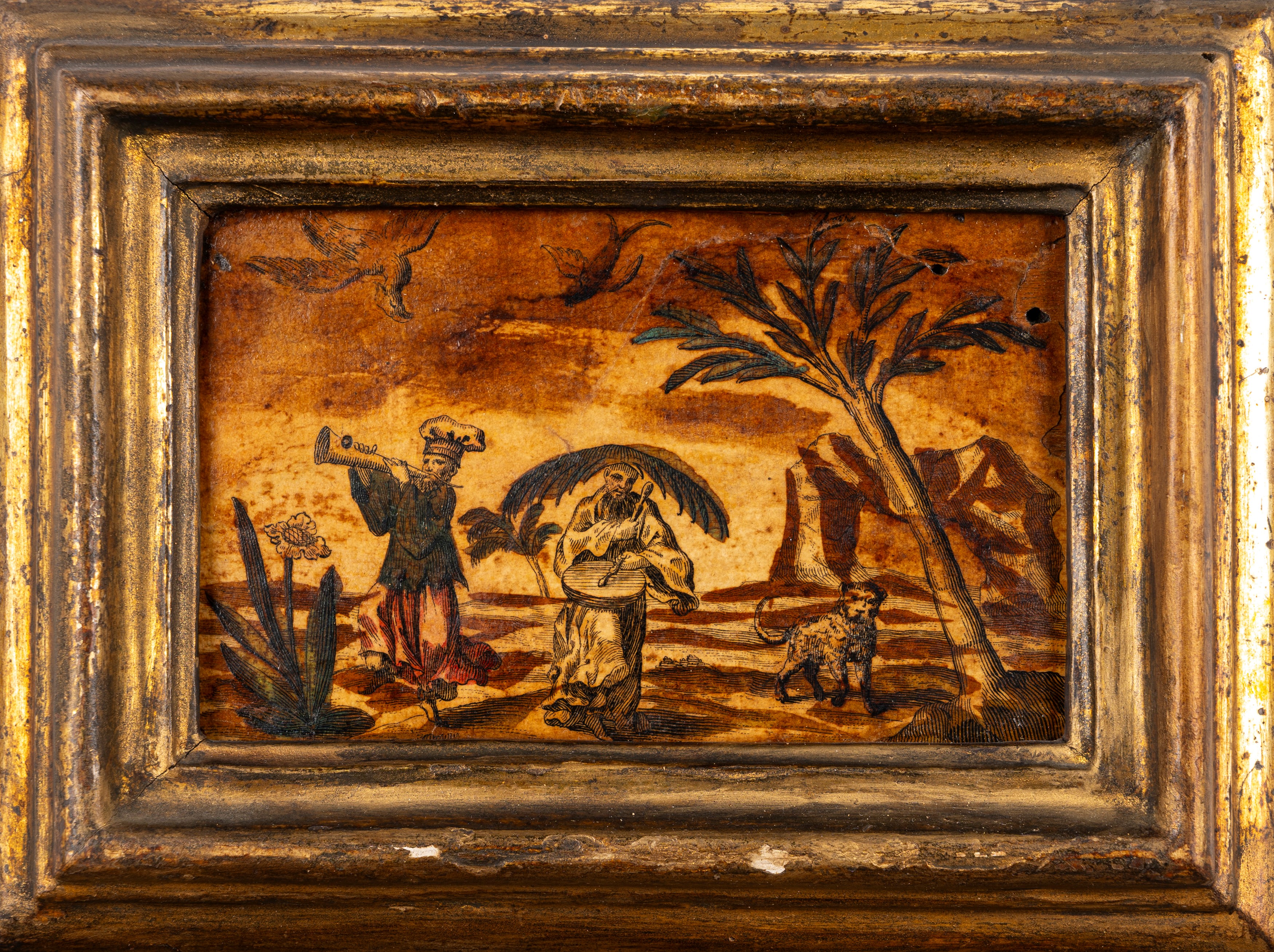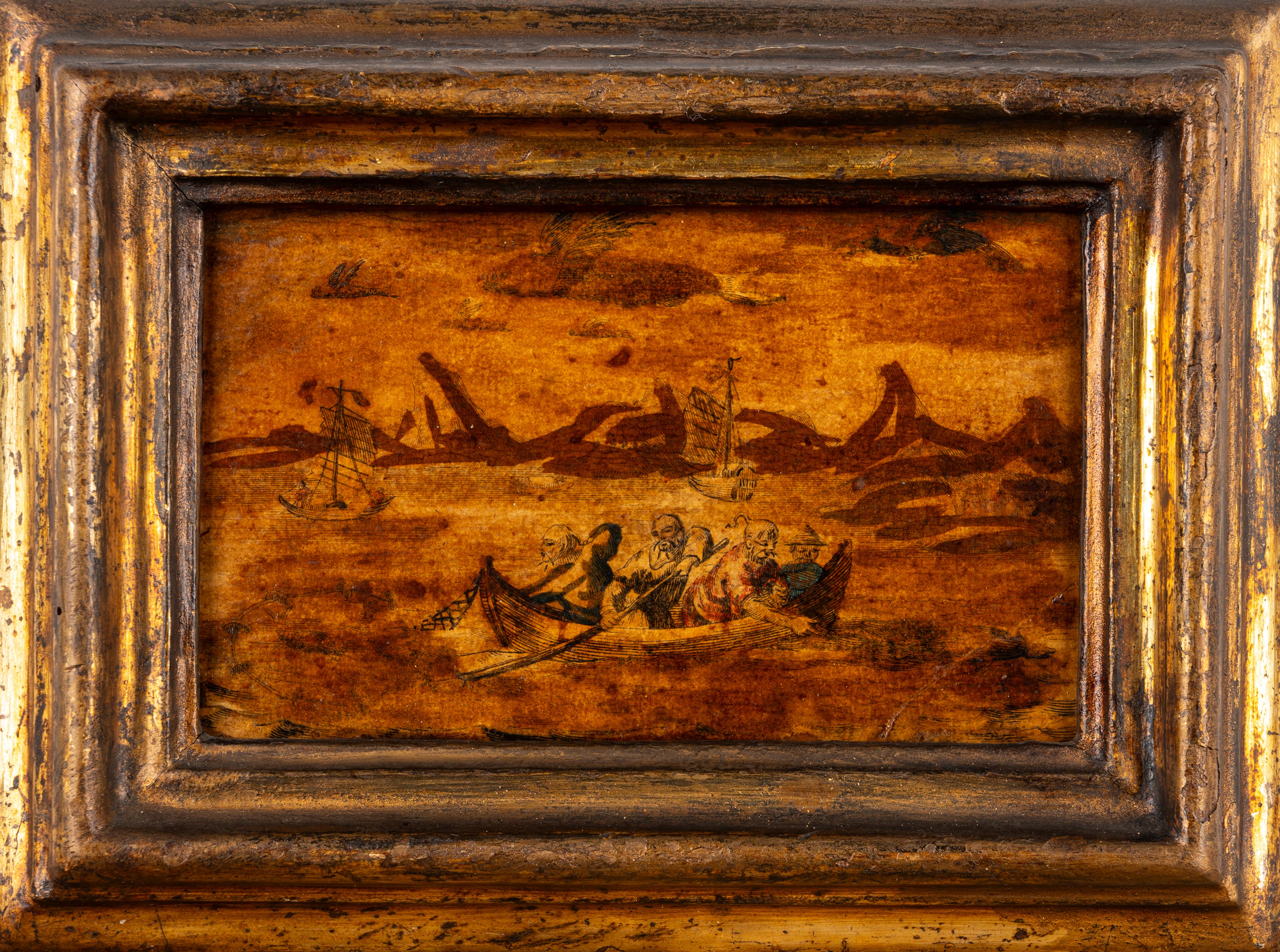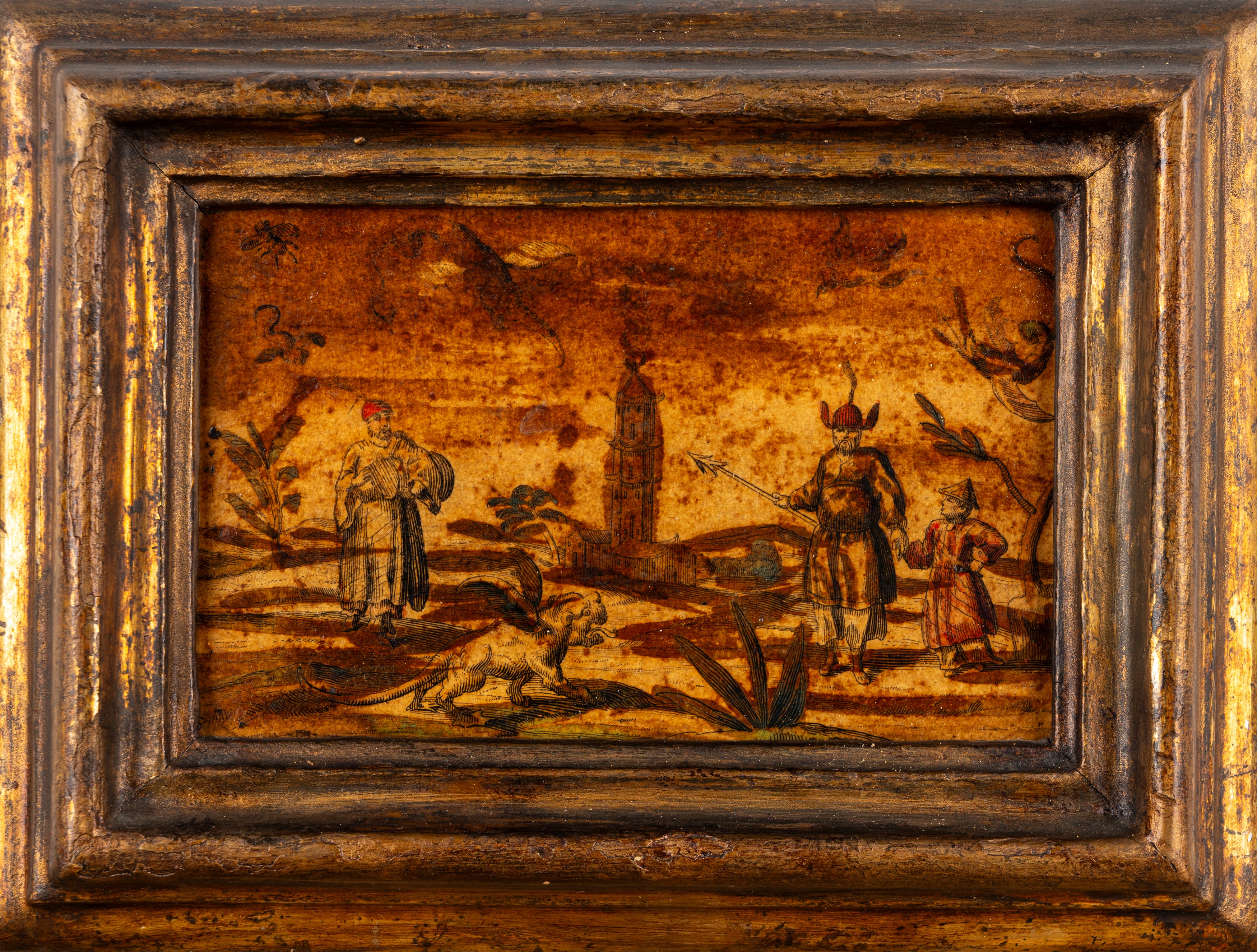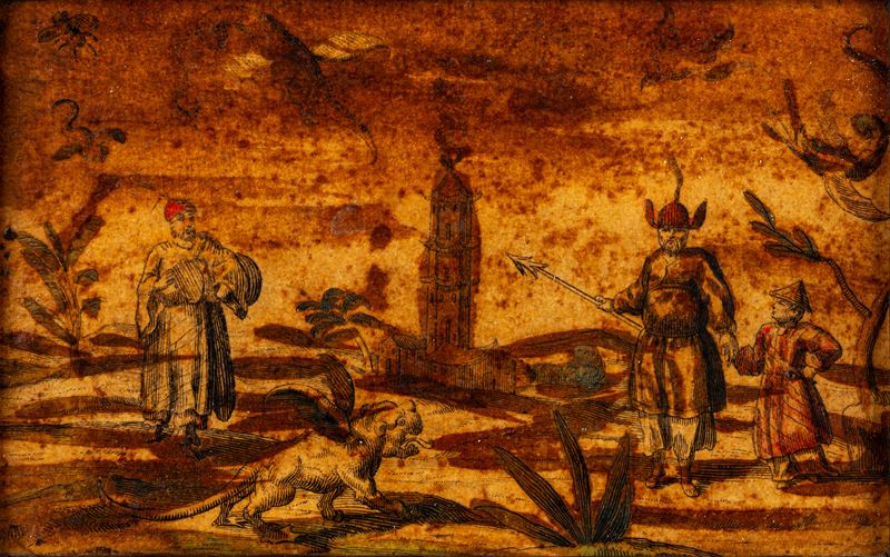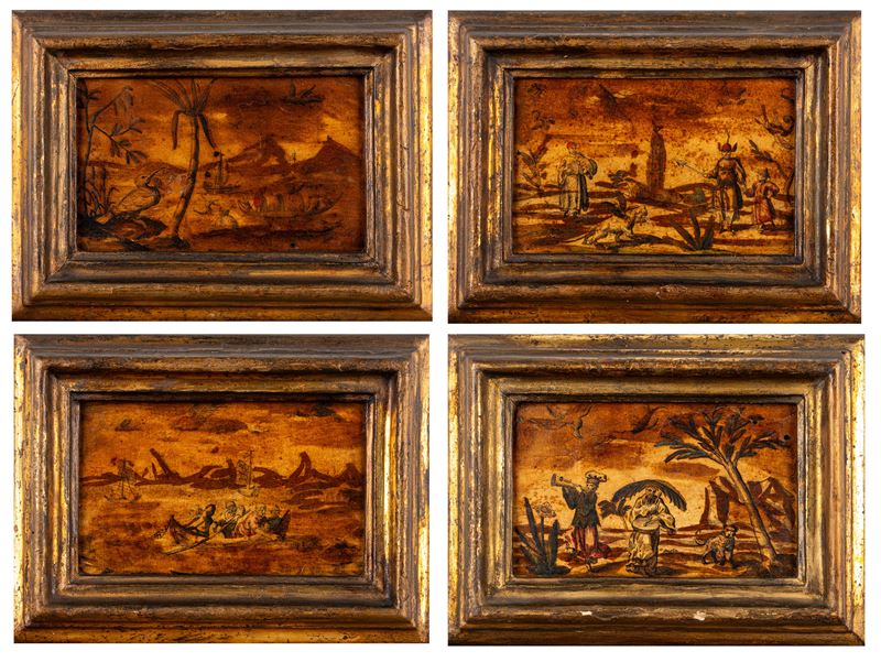 Quattro incisioni colorate a mano applicate su tavola con motivi a chinoiserie, secolo XIX