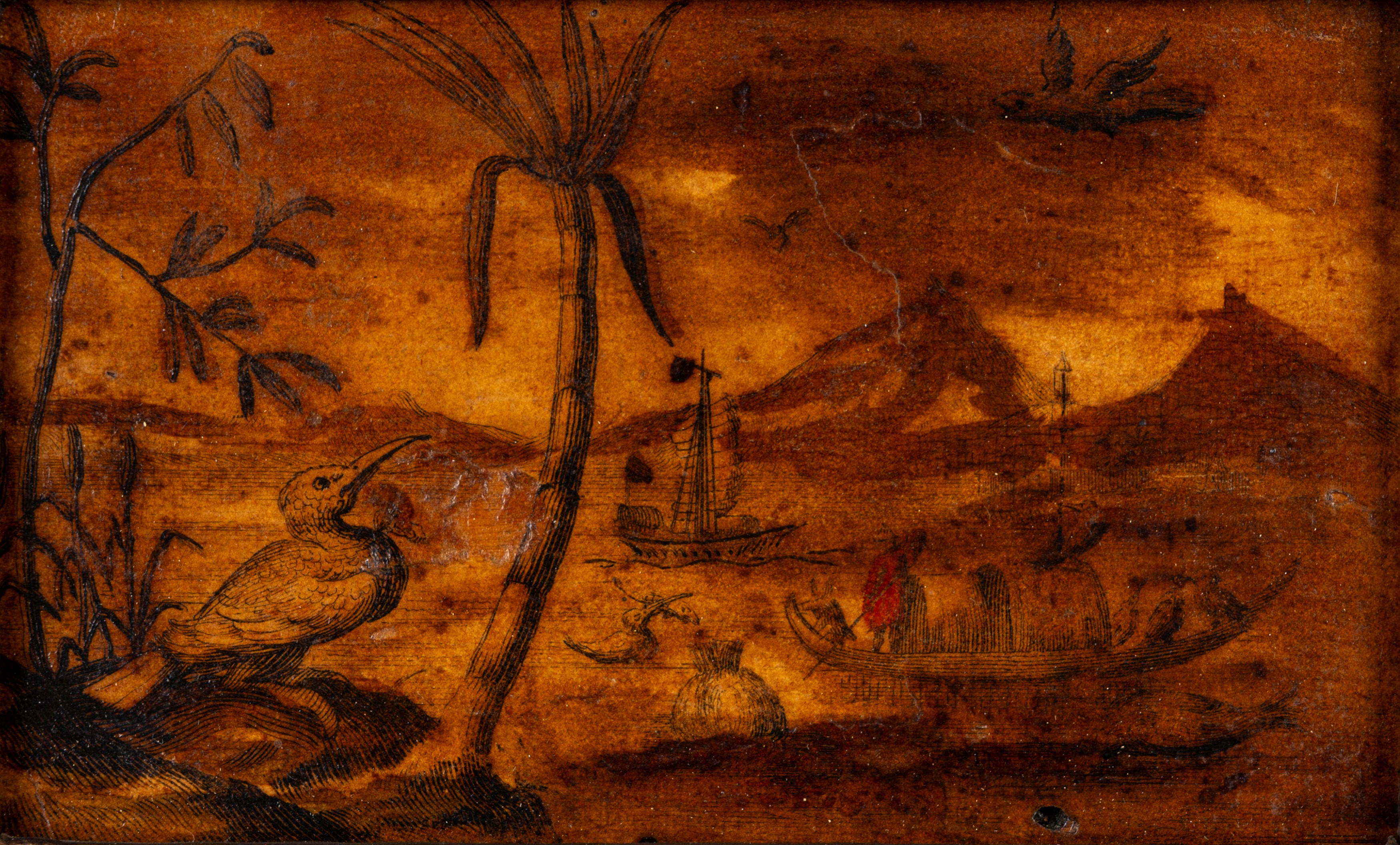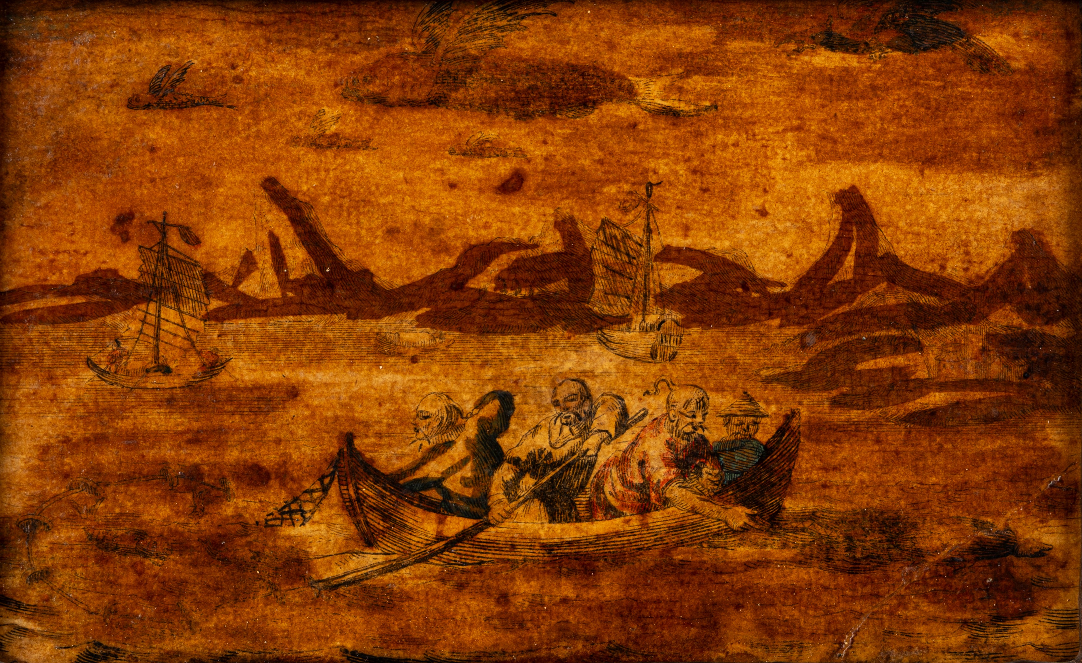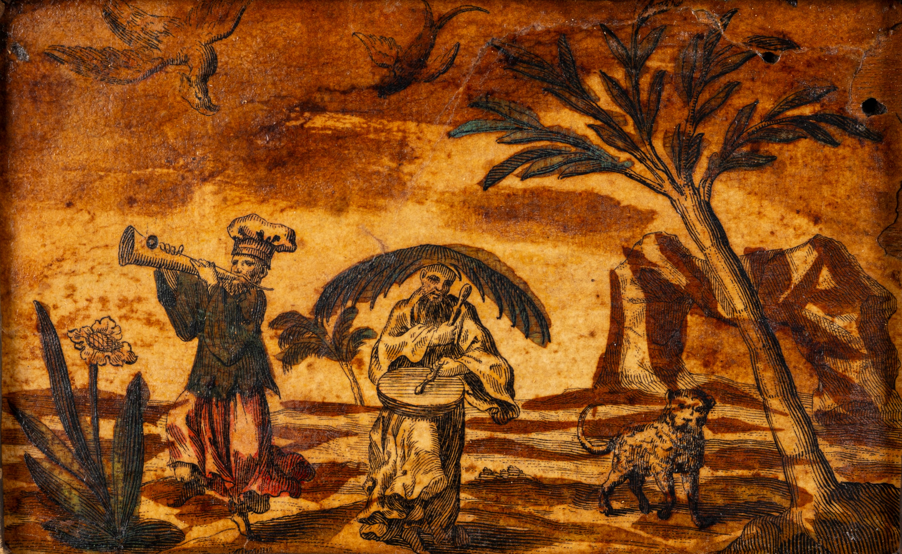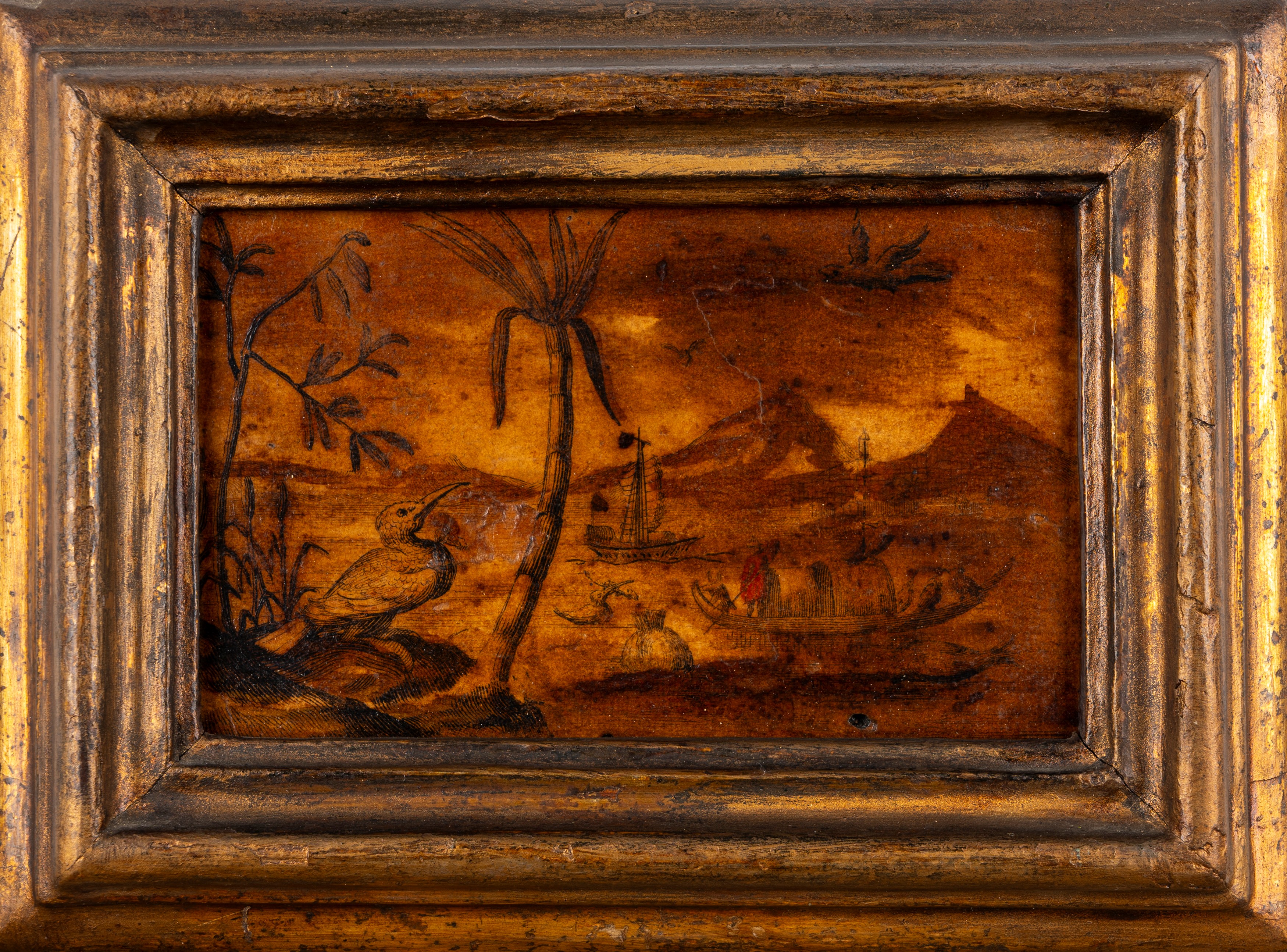 Quattro incisioni colorate a mano applicate su tavola con motivi a chinoiserie, secolo XIX