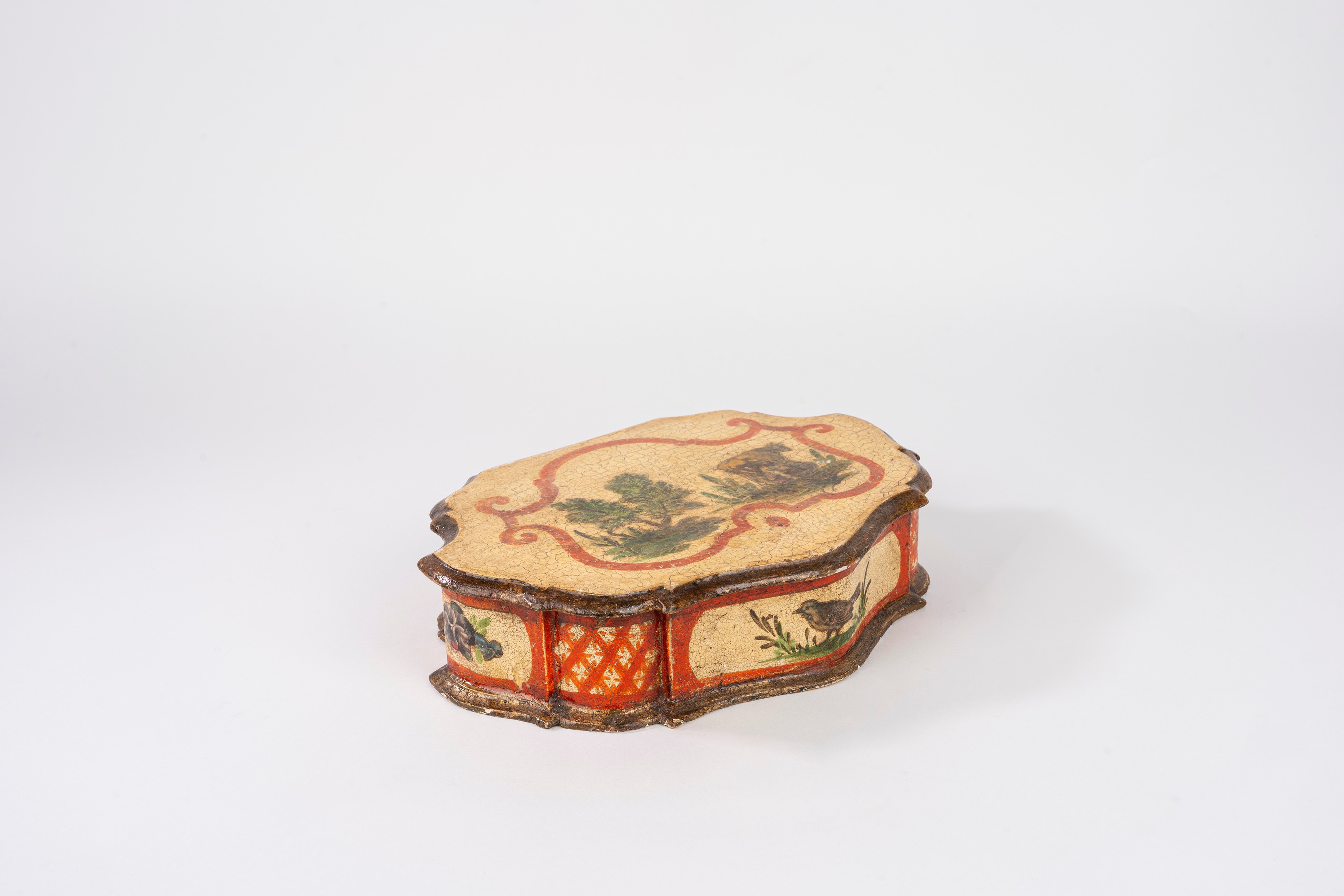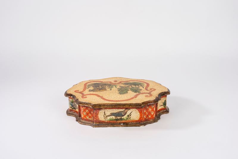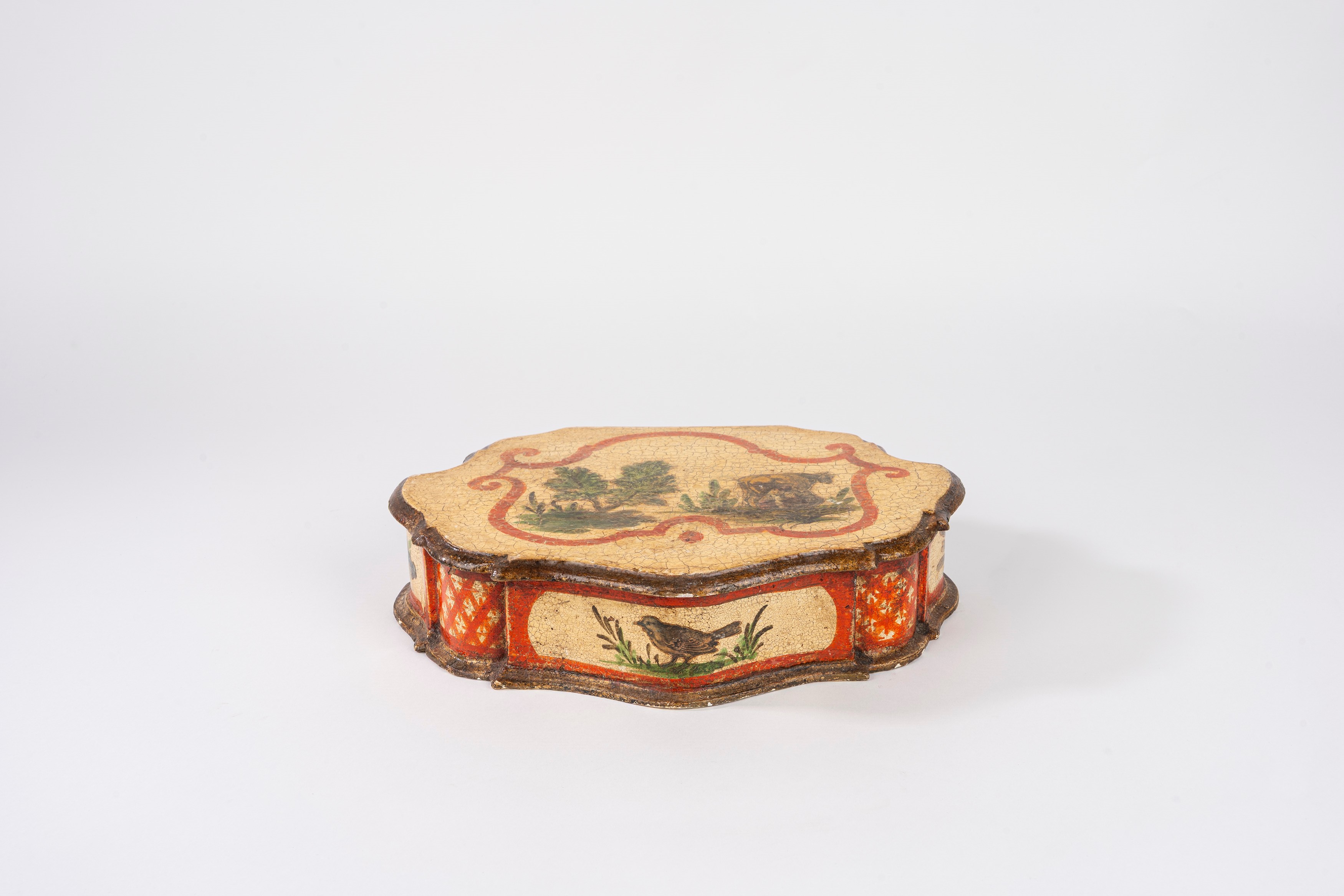 di forma mistilinea, decorata con scena campestre sul coperchio e uccellini sui bordi