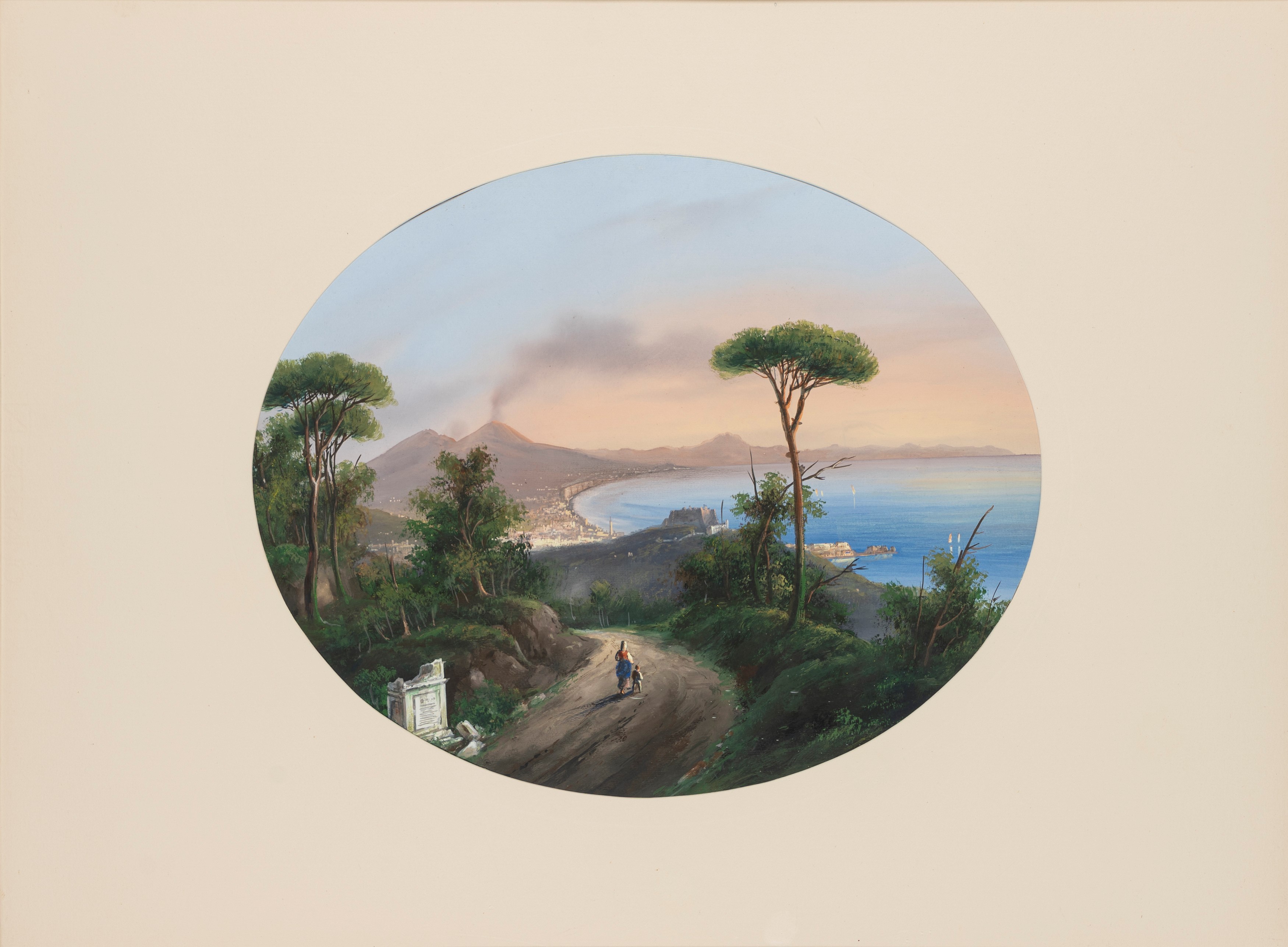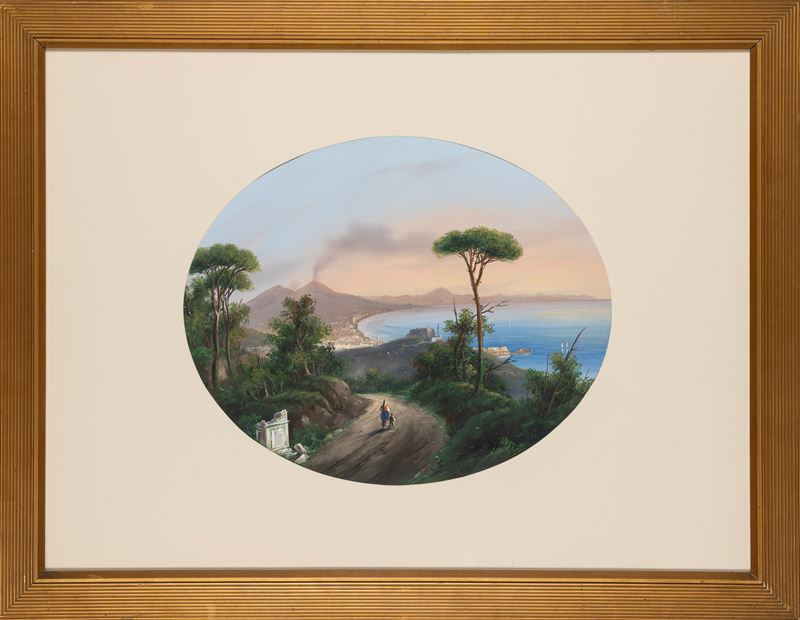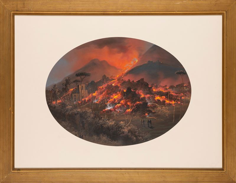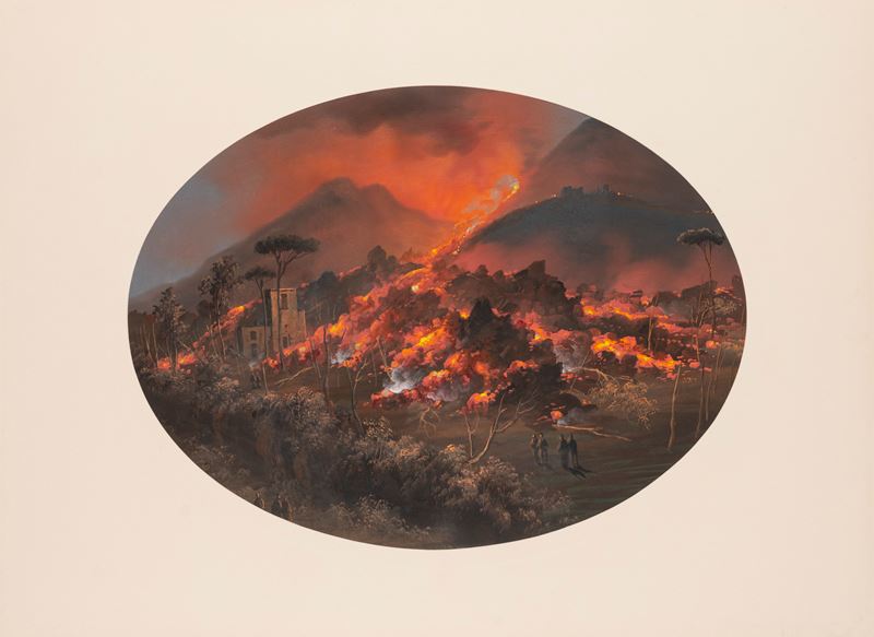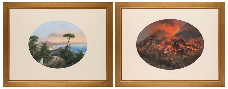 Due gouaches su carta raffiguranti eruzione notturna del Vesuvio e veduta del golfo di Napoli