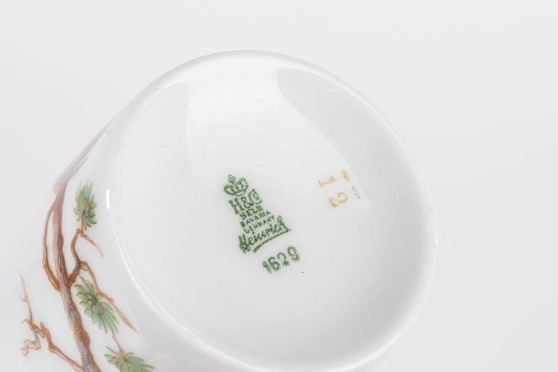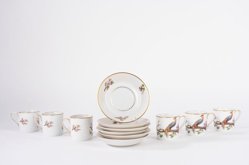 composto da sei tazzine con piattini, decorate con uccellini e motivi floreali