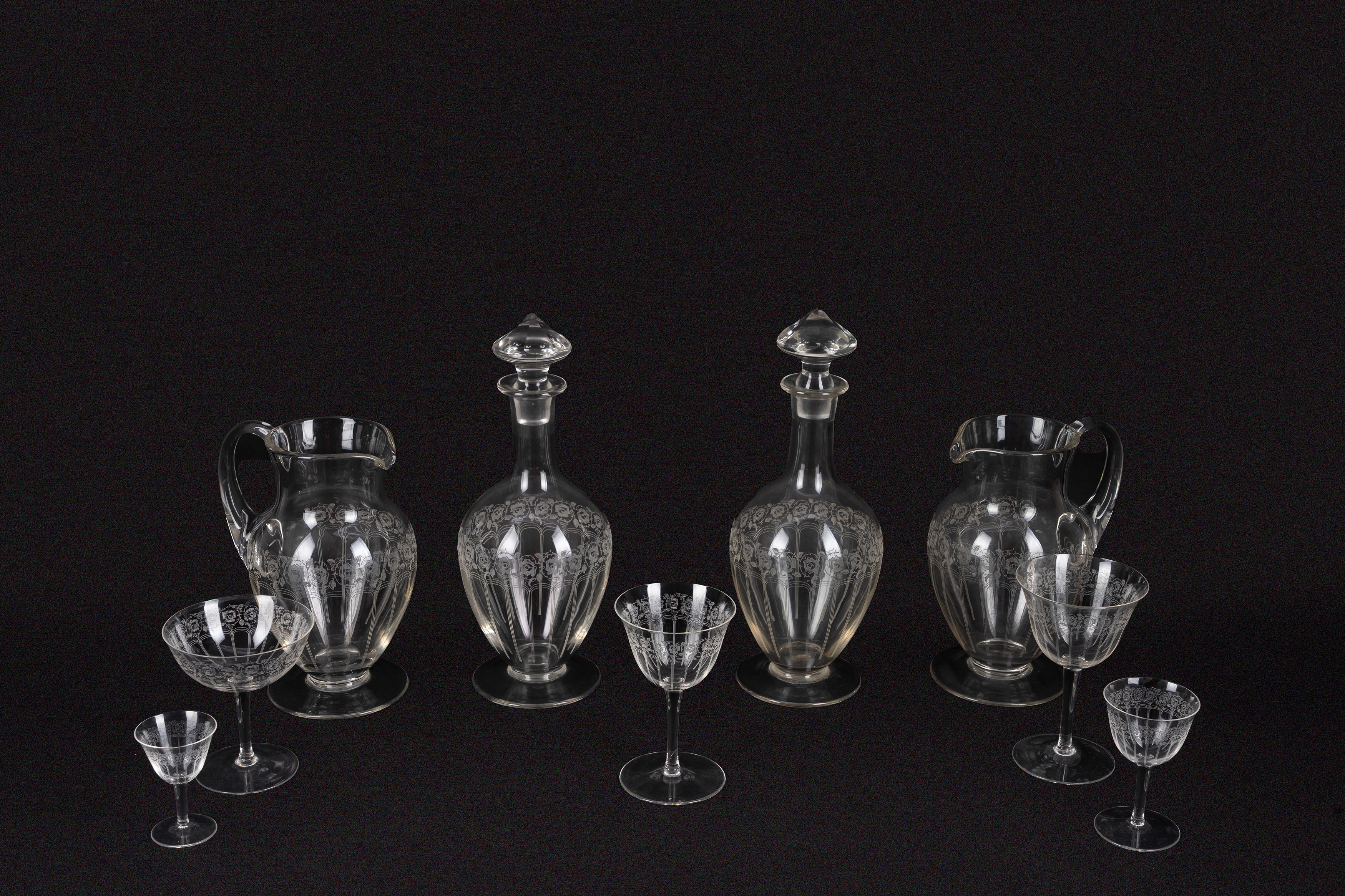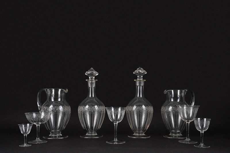 Composto da: due caraffe, due bottiglie, otto bicchieri d'acqua, otto bicchieri da vino, otto bicchieri da liquore, otto bicchieri da cherry e otto coppe da champagne (di cui una rotta).