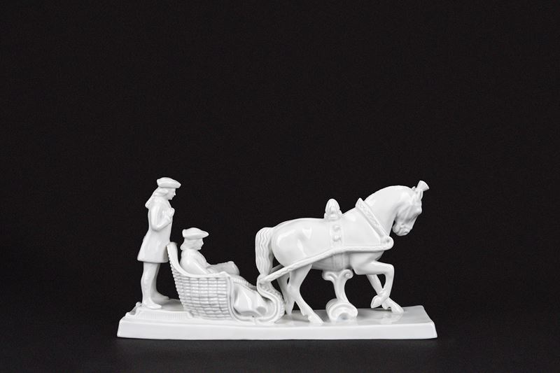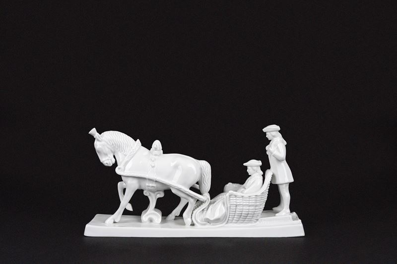 "Sulla slitta", gruppo scultoreo in porcellana bianca, manifattura Fraureuth Kunststeilung