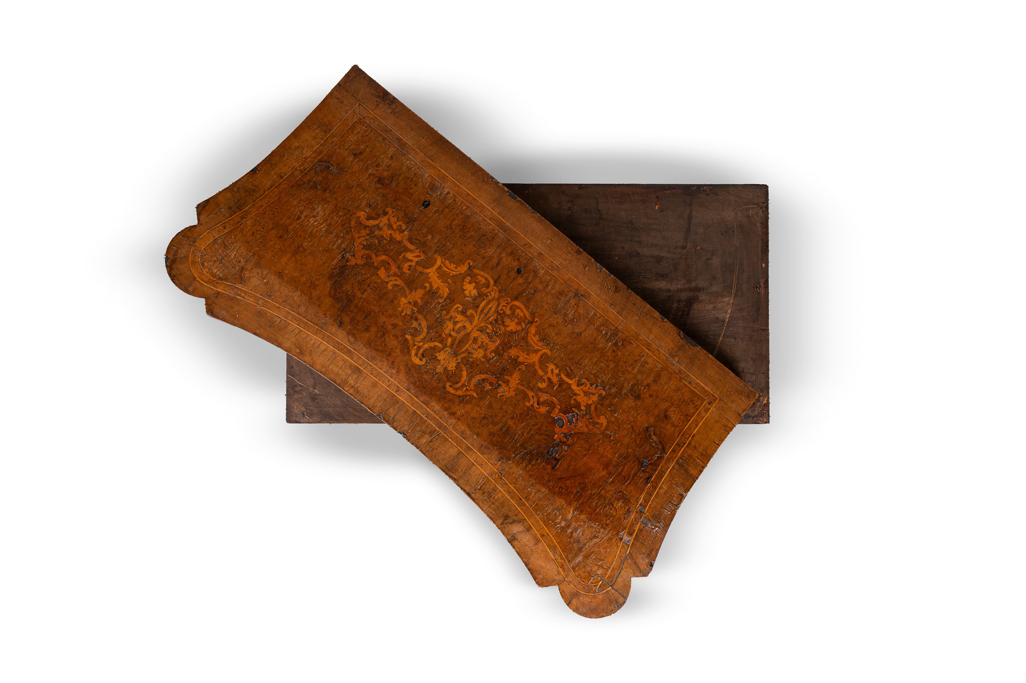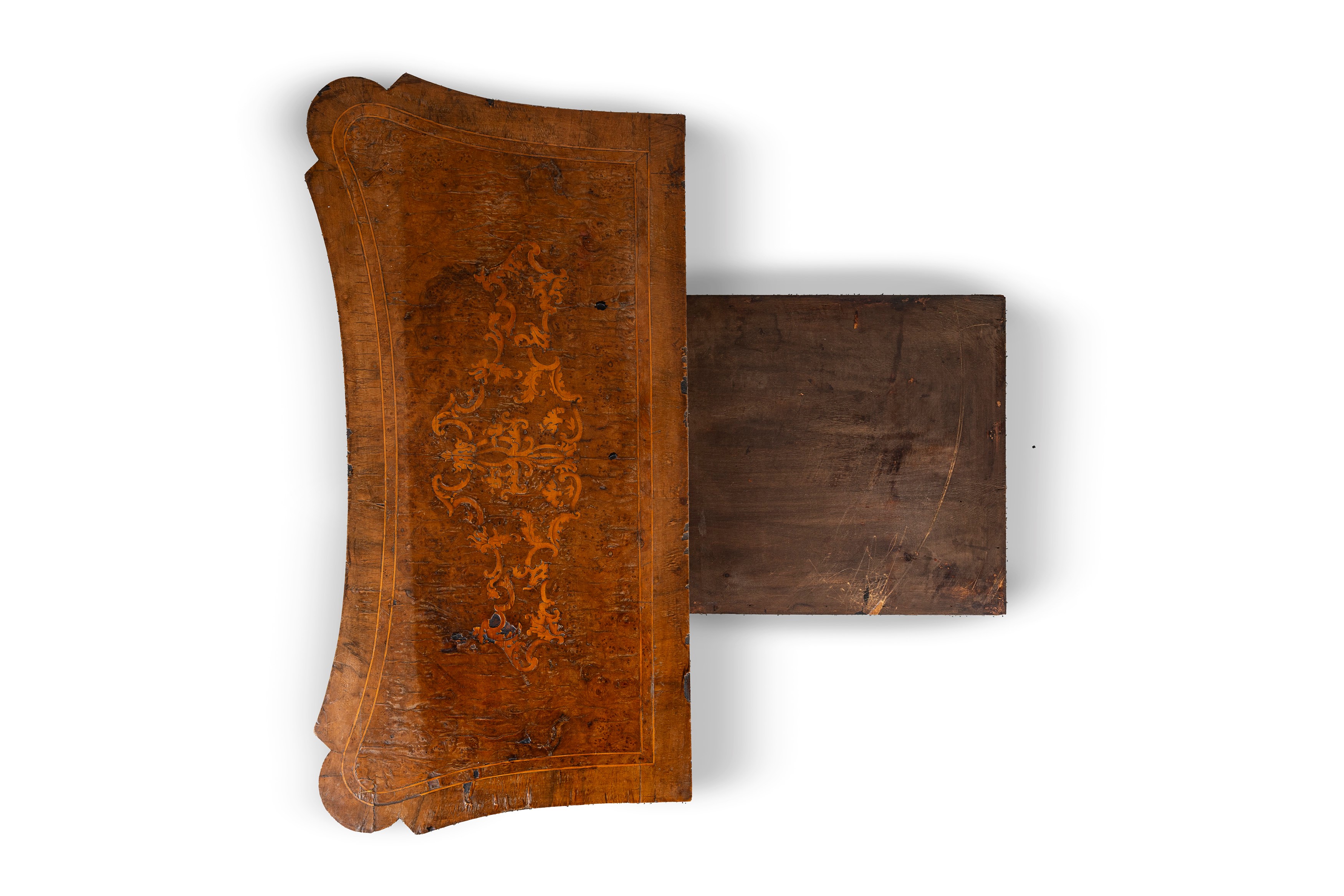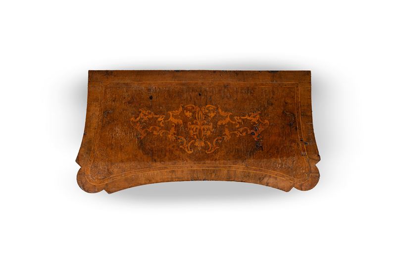 piano di forma mistilinea intarsiato con motivi a girali vegetali e gambe a obelisco rovesciato raccordate da crociera.