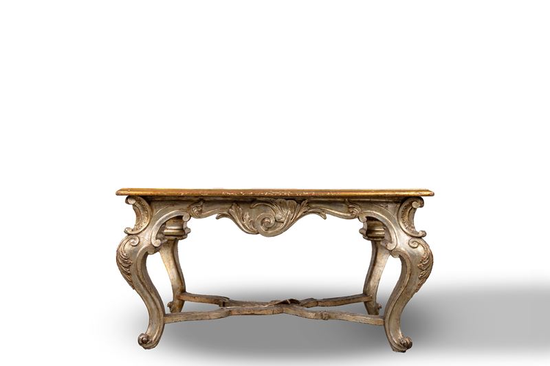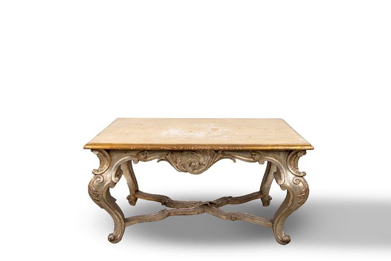Tavolino in legno intagliato, dorato e laccato verde, con piano in alabastro, secolo XIX