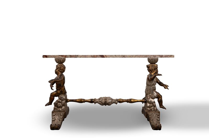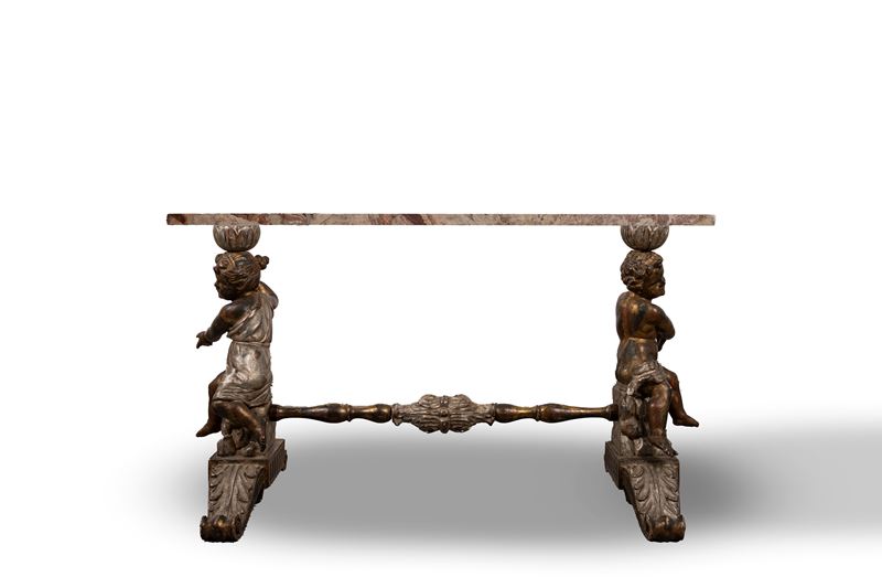 Tavolo composto da base con due puttini in legno dorato a mecca e piano in marmo, secolo XIX
