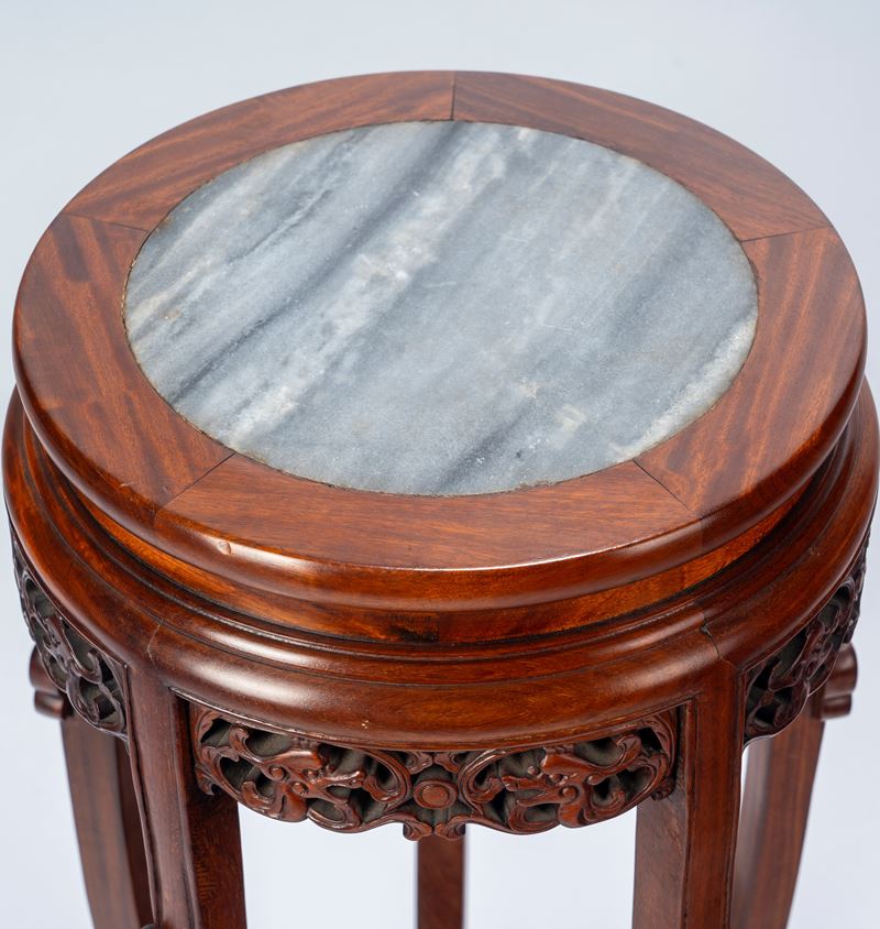 Trespolo portavaso in legno intagliato di gusto orientale con piano in marmo, XX secolo