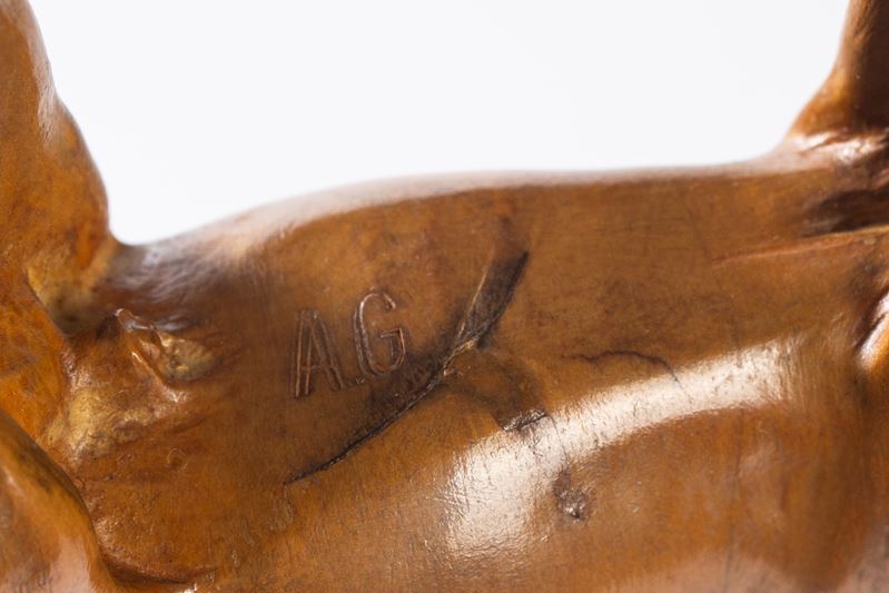 il cavallo in legno scolpito marcato A.G., con zampa sinistra posteriore restaurata e mancanza all'orecchio sinistro.