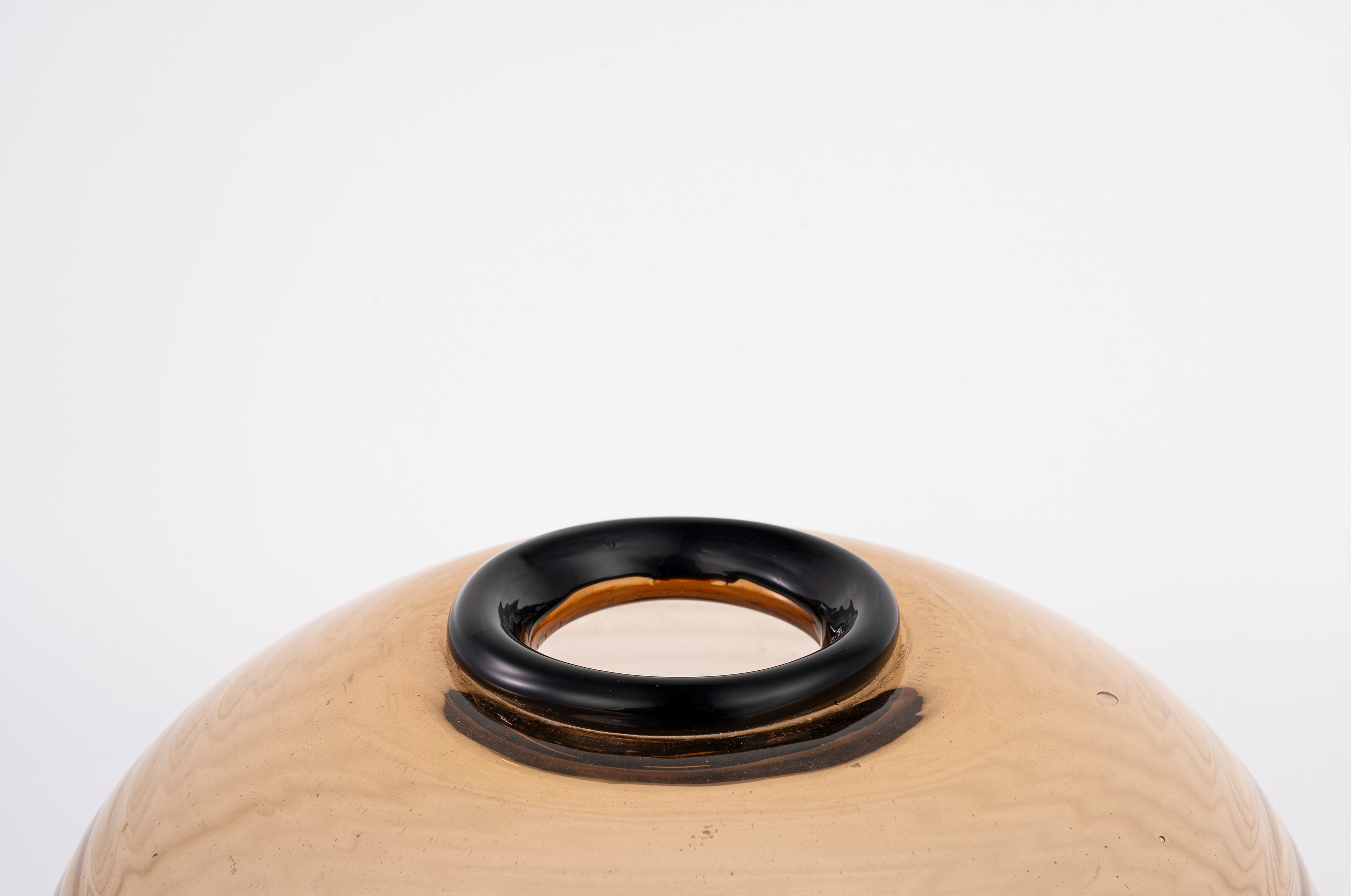 in vetro fumè con motivi a fasce concentriche, con base e colo in pasta vitrea nera