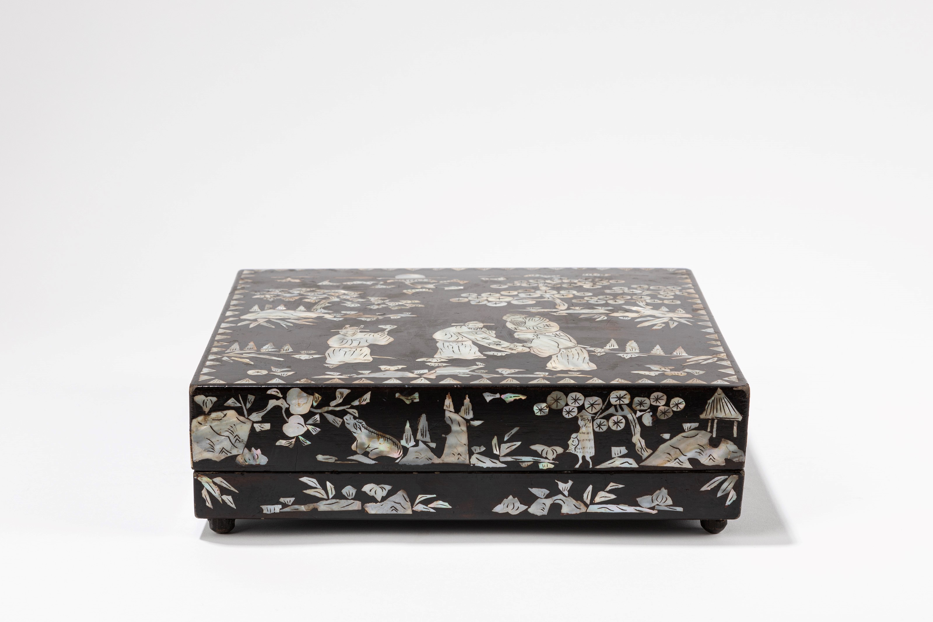 Decorata con figure di saggi, pipistrelli e alberi in madreperla