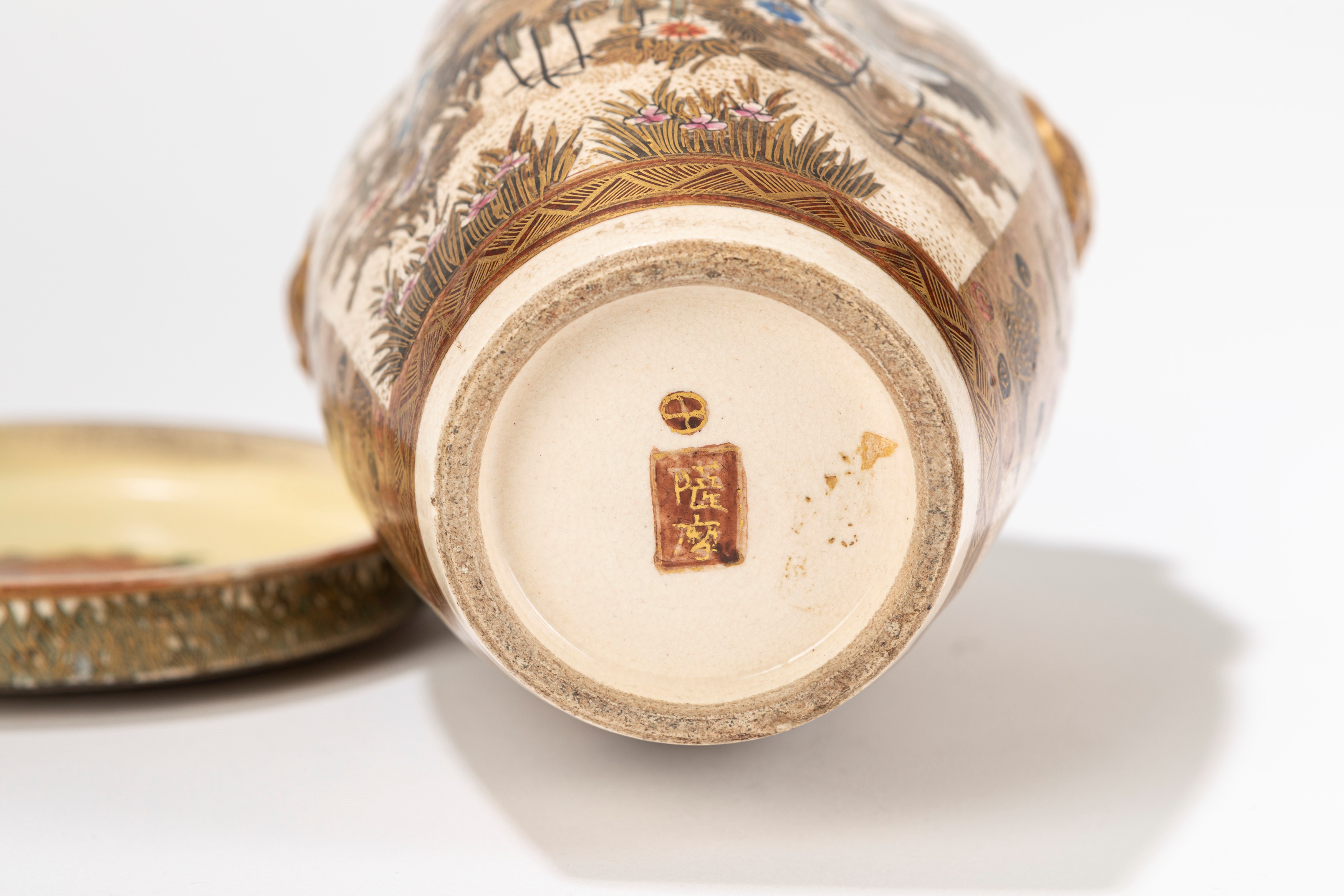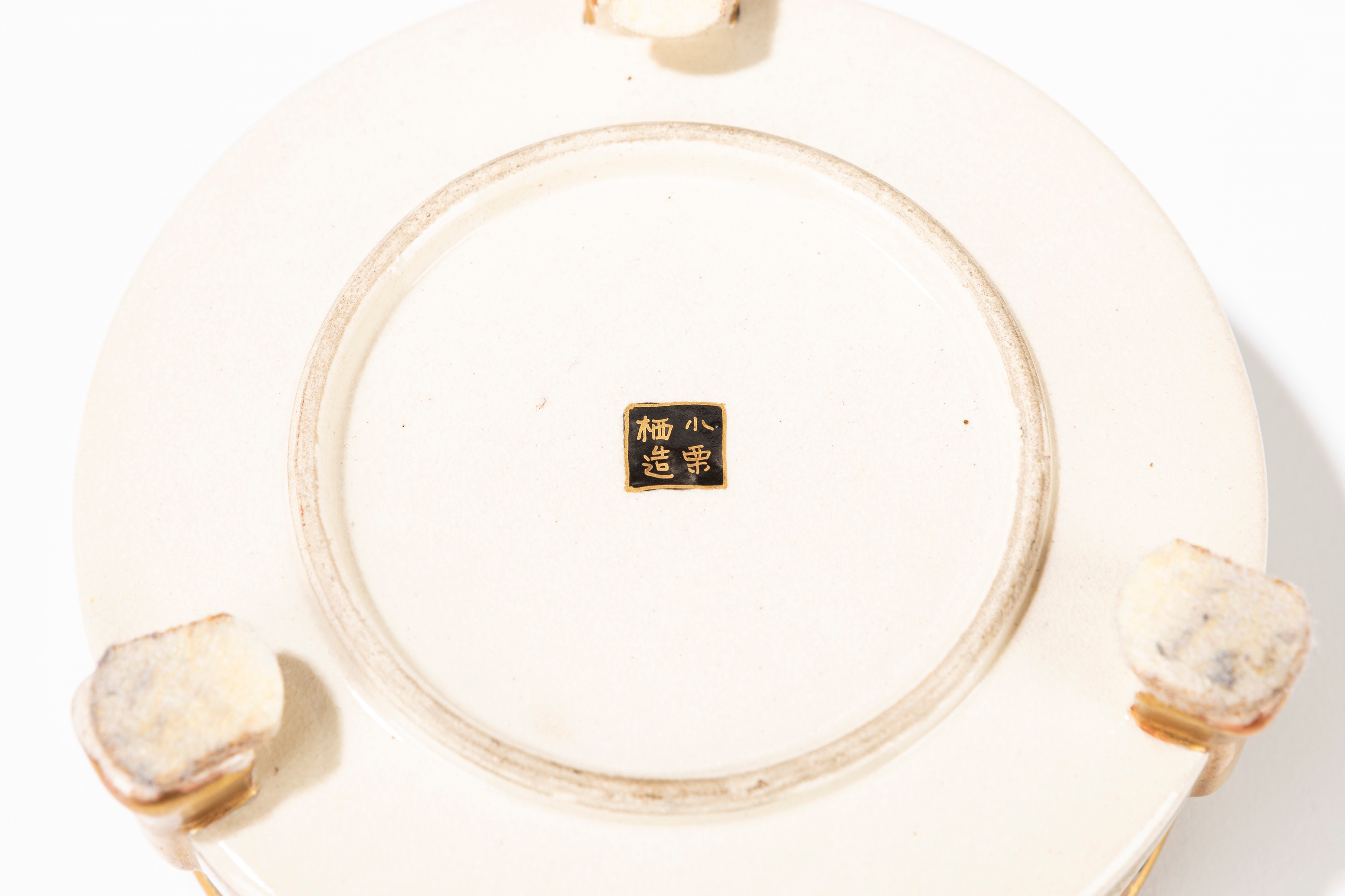 La scatola, poggiante su tre piedini, finemente decorata senza soluzione di continuità con motivi floreali e uccellini, i due vasetti decorati a riserve con paesaggio con monte Fuji, fiori e gru e due anse a motivi zoomorfi.