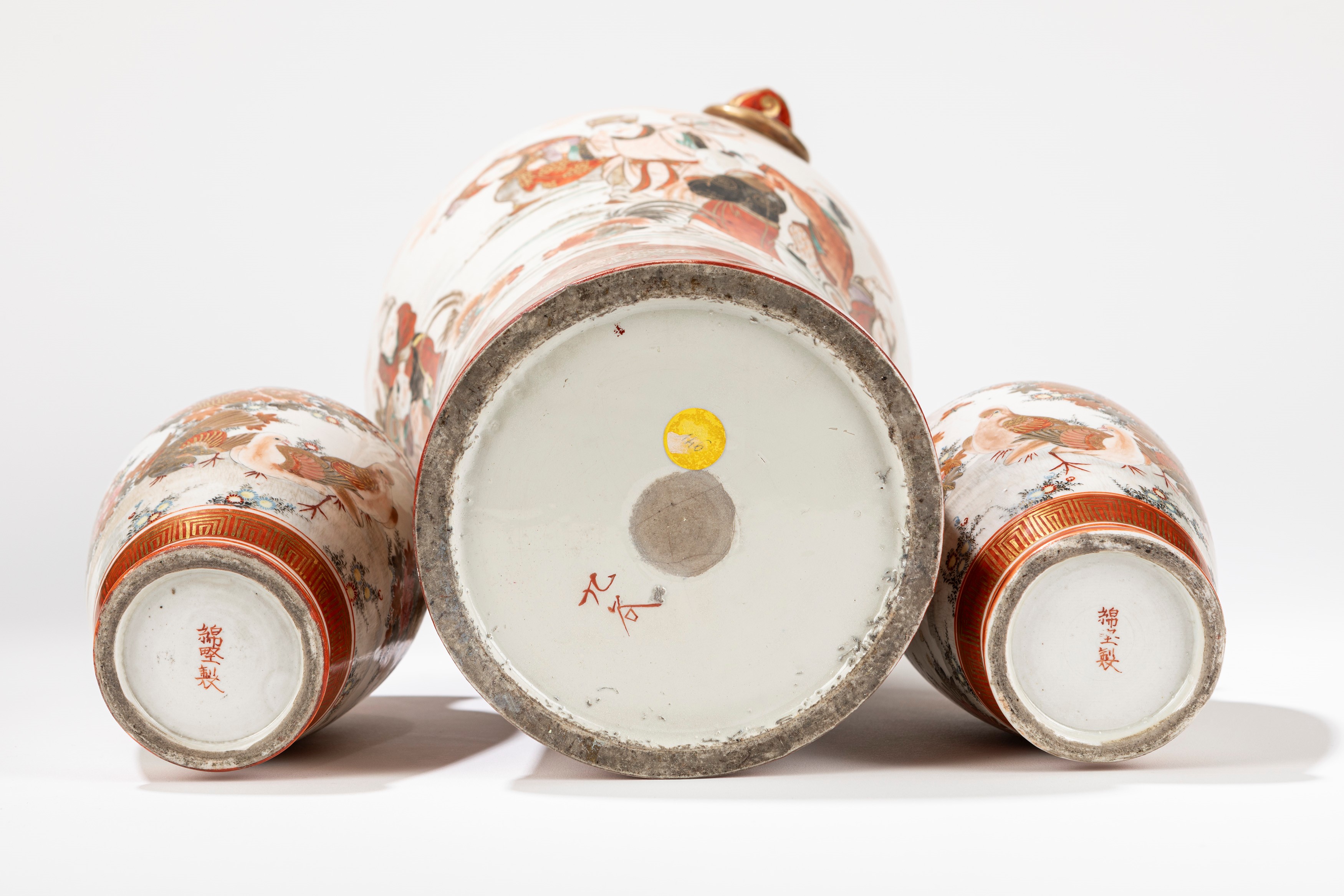 Vaso in porcellana kutani decorato con bambini che giocano e due piccoli vasi decorati con uccellini, Giappone, inizio secolo XX