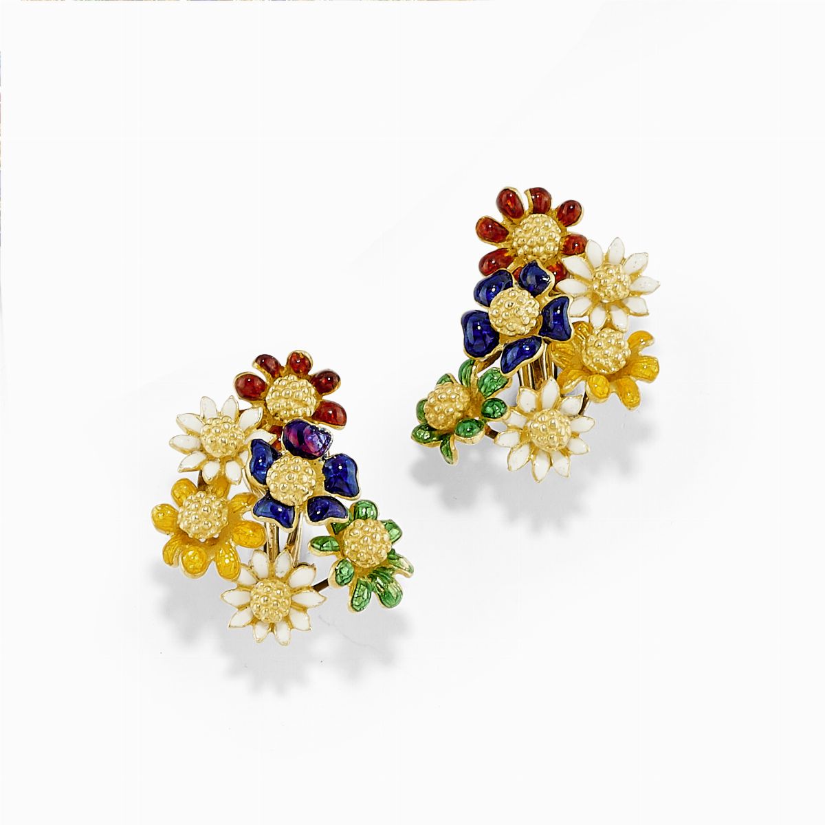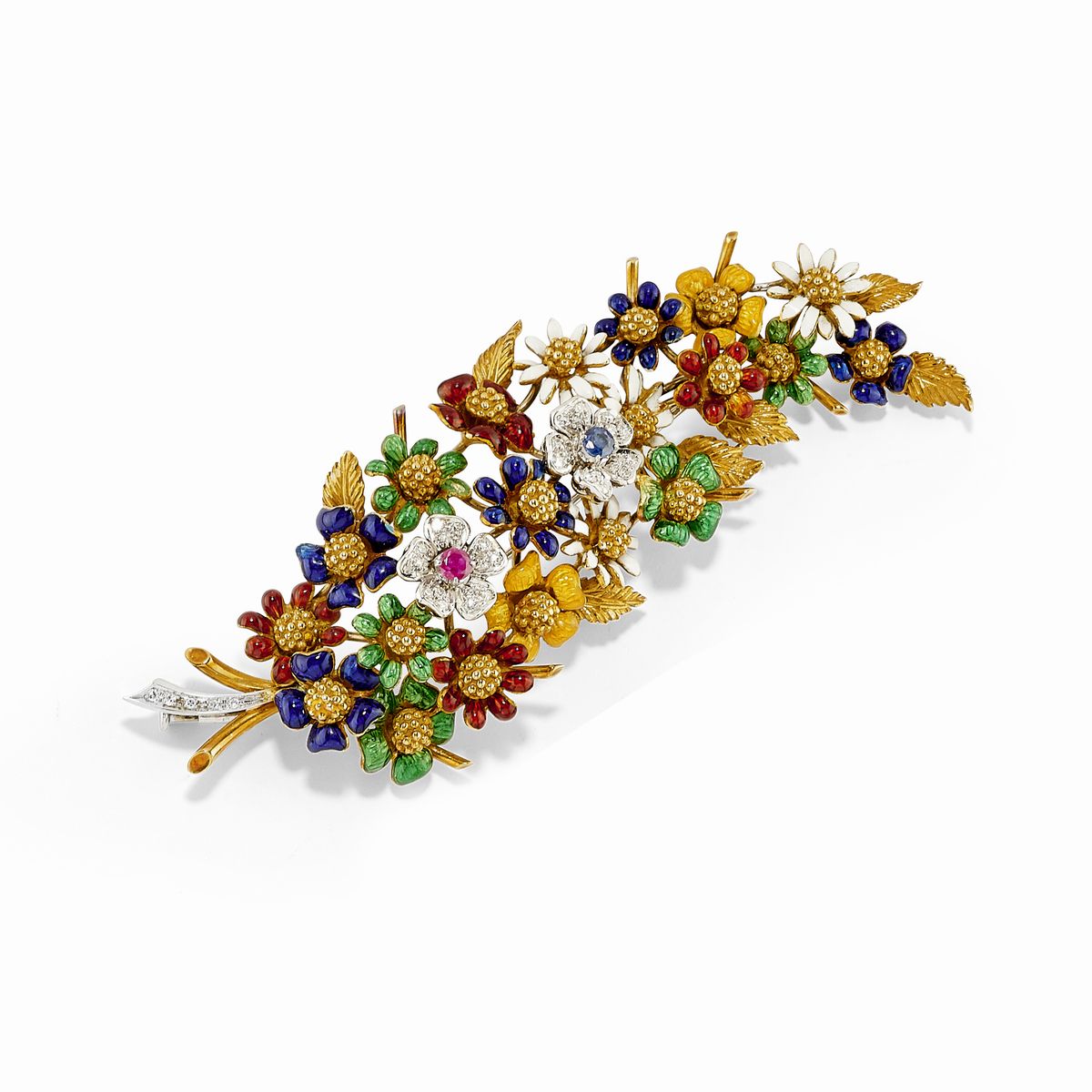 smalto policromo, rubino, zaffiro e diamanti, composta da coppia di orecchini e spilla.Peso g 57,30 cm 3,00x9,00 cm 2,2,50x2,80