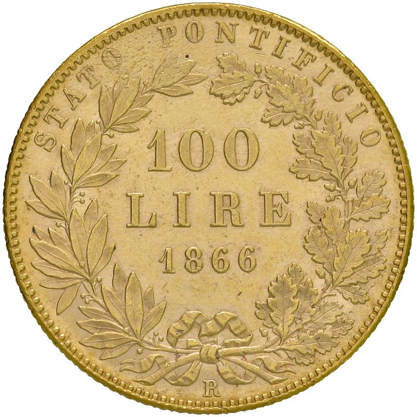 100 lire 1866/XXI. Pagani 519. Montenegro 356. Oro. Molto raro. Esemplare di grande bellezza. qFDC.Base d'asta