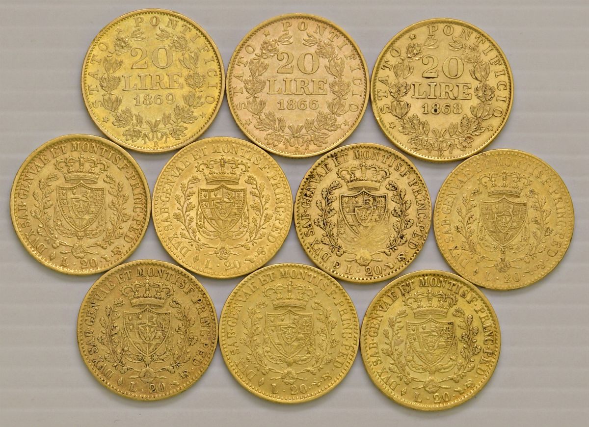 10 monete in oro da 20 lire: 7 di Carlo Felice (di cui 1821, 1823 e 1831 rari) e 3 di Pio IX, di cui una 1866/XX, molto rara.Base d'asta