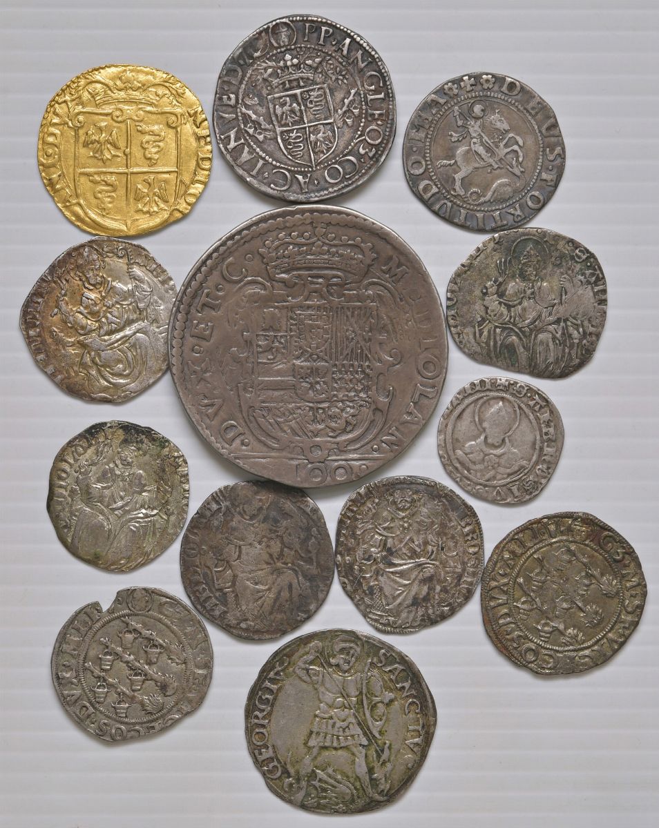 13 monete, di cui 11 di Milano (compresi un testone di Ludovico il Moro, una doppia in oro di Filippo II e un denaro da 100 soldi 1605 di Filippo III), un grosso da 6 soldi di Gian Giacomo Trivulzio per Mesocco e un grossone di Ercole I d'Este, di Ferrara