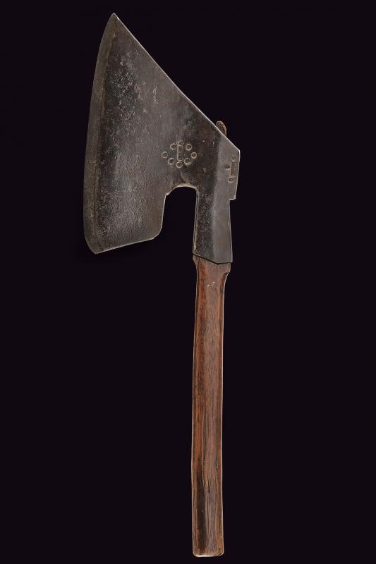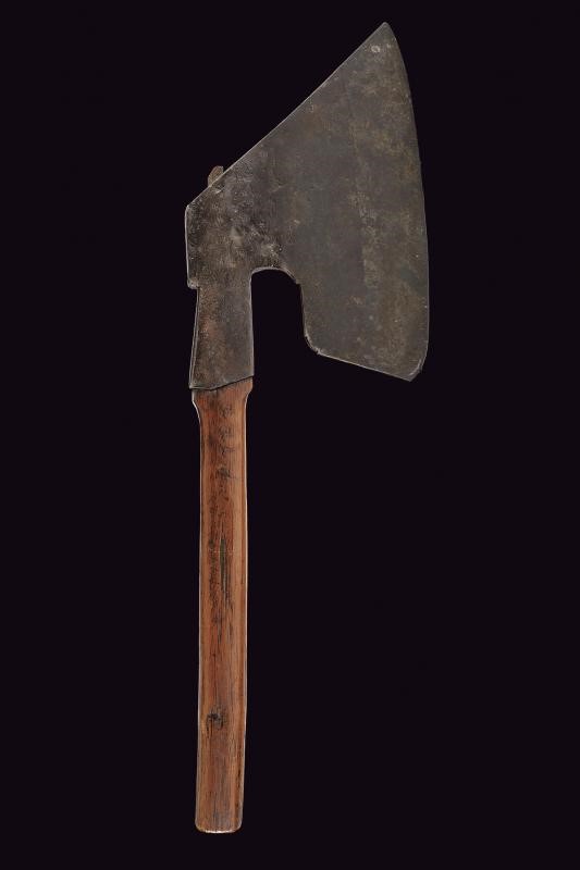 Pesante testa in ferro con scure a lungo taglio; due punzoni "MPM" entro una cornice di fiori. Gorbia costolata. Fusto in legno. Questo lotto è importato da un Paese extra UE e comporta una tassazione aggiuntiva rispetto alla commissione della casa d'aste e alla tassa sul servizio. Di conseguenza, la commissione totale, comprensiva di tutte le tasse, ammonta al 35%.