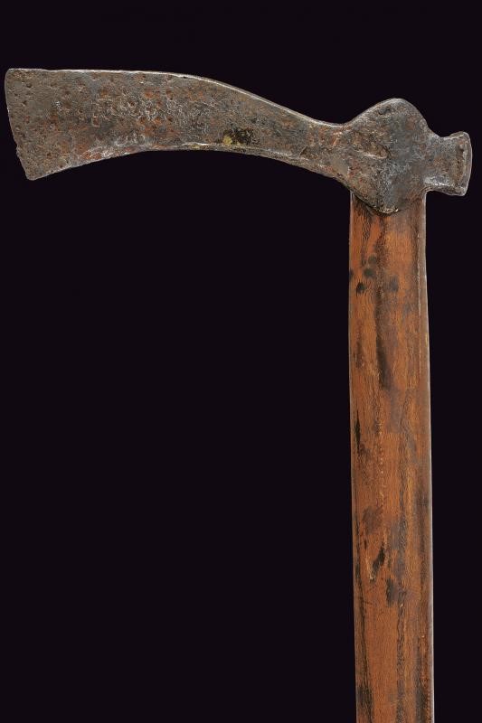 Testa in ferro con lunga scure incurvate a taglio quasi dritto. Breve martello rettangolare. Su fusto moderno in legno. Questo lotto è importato da un Paese extra UE e comporta una tassazione aggiuntiva rispetto alla commissione della casa d'aste e alla tassa sul servizio. Di conseguenza, la commissione totale, comprensiva di tutte le tasse, ammonta al 35%.